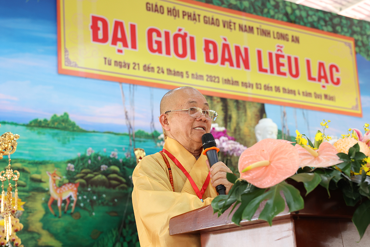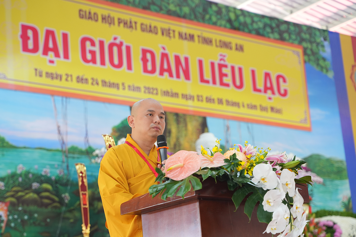 Báo cáo tiến trình công tác tổ chức Đại Giới đàn, ĐĐ. Thích Lệ Duyên thay mặt Ban Kiến đàn báo cáo công tác tổ chức. ĐĐ cho biết Đại giới đàn Liễu Lạc do Ban Trị sự GHPGVN tỉnh Long An tổ chức từ ngày 21-5-2023 đến ngày 24-5-2023 (03-4 đến 06-4-Quý Mão), đàn giới Tăng tại chùa Pháp Minh (Đức Hoà) và đàn giới Ni tại chùa Long Thành (Đức Hoà).