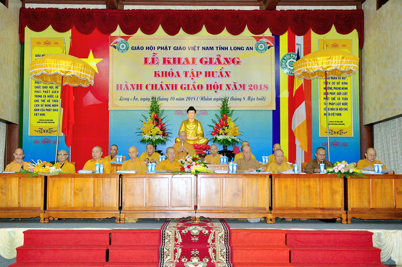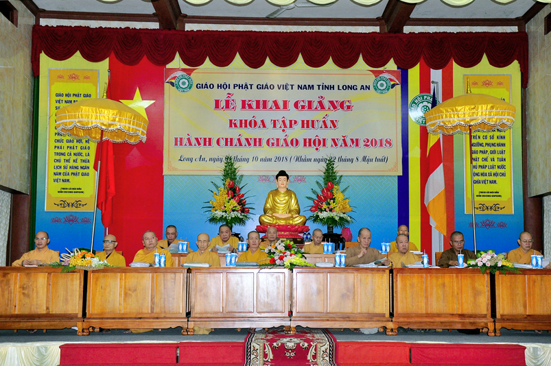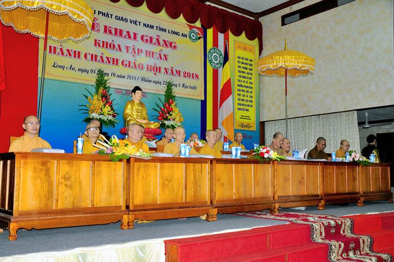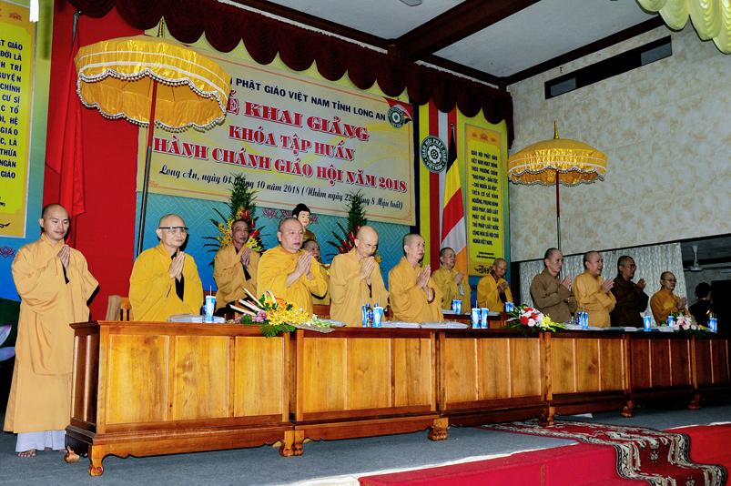 Trong buổi lễ, Hòa thượng Thích Minh Thiện đã tuyên đọc lời khai mạc cho khóa Tập huấn Hành Chánh Giáo hội năm 2018. Trong lời khai mạc, Hòa thượng điểm qua những thành quả Phật giáo Long An đã đạt được. Hòa thượng nói, thừa kế những thành quả đó, thực hiện chủ trương hoạt động của Ban trị sự Phật giáo tỉnh Long An, thừa kế quả khóa Tập Huấn Hành Chánh Giáo hội do Văn phòng II, Trung ương GHPGVN tổ chức từ ngày 10 -12/ 09/ 2018 và nhu cầu thực tế của Tăng Ni trong tỉnh, kết hợp từ nhiều duyên lành như vậy nên khóa Tập huấn Hành chánh Giáo hội từ ngày 01 – 04/ 10 tại Văn phòng Tỉnh hội do BTS. GHPGVN tỉnh Long An tổ chức.