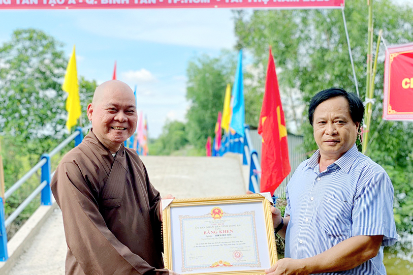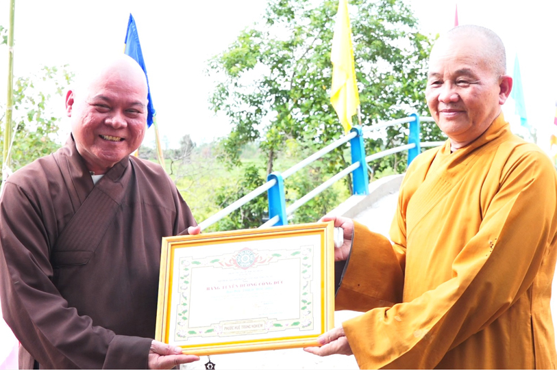 Và để ghi nhận công đức của Đại đức Thích Đức Hậu, GHPGVN tỉnh Long An đã trao bằng công đức đến Đại đức; và ông Hồ Phước Hồng trào bằng khen của Ủy ban Nhân dân tỉnh đến Đại đức Thích Đức Hậu.