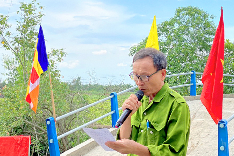 Mở đầu buổi lễ là nghi thức truyền thống Phật giáo Sái Tịnh cây cầu mới, sau khi kết thúc nghi lễ là chính thức vào phần lễ hành chánh. Đại diện chính quyền báo cáo quá trình xây dựng cây cầu. Được biết cầu Sạn 5 được thiết kế chiều dài 26m, rộng 2,7m, với kinh phí 187 triệu đồng với sự tài trợ của Đại đức Thích Đức Hậu và Phật tử chùa Long Vân, Phường Tân Tạo A, quận Bình Tân, Tp. HCM là 160 triệu đồng phần còn lại do ngân sách và nhân dân địa phương đóng góp.