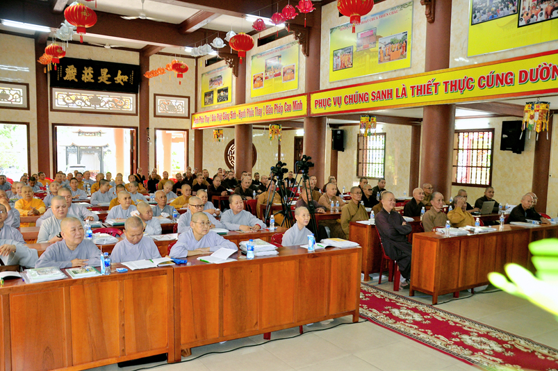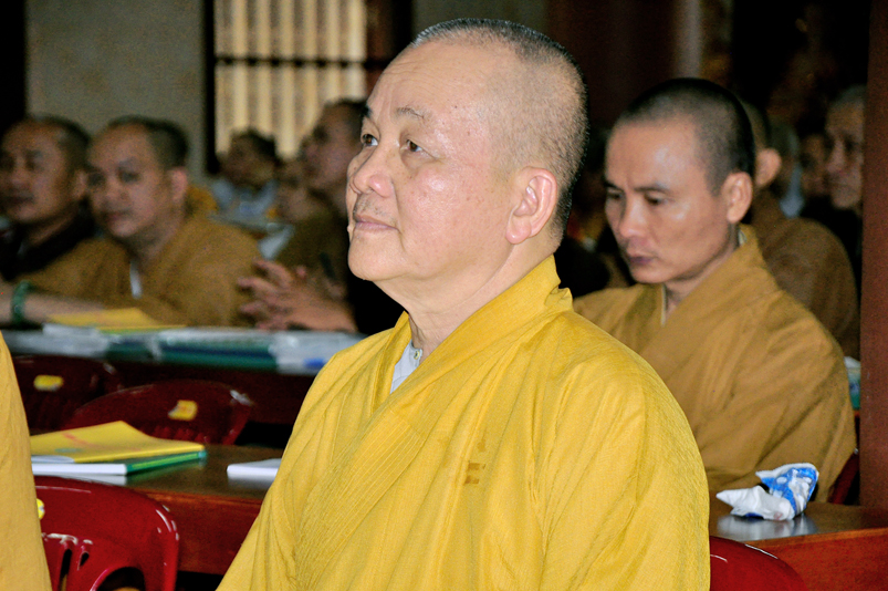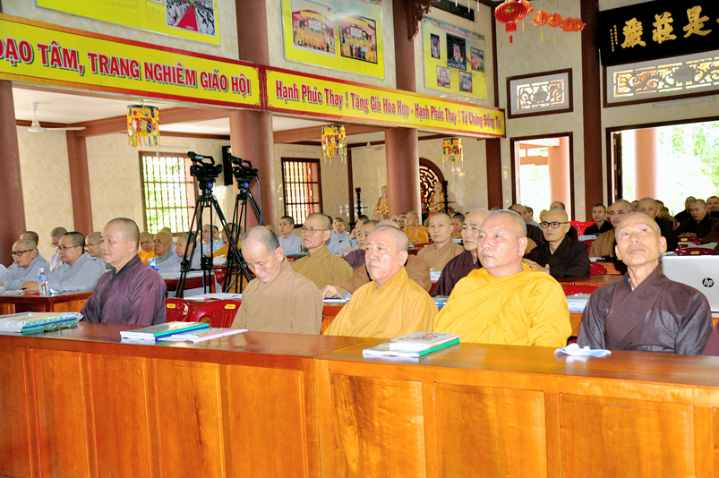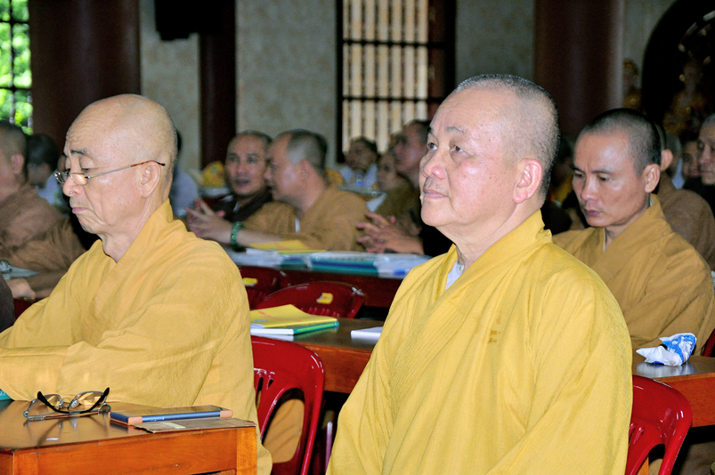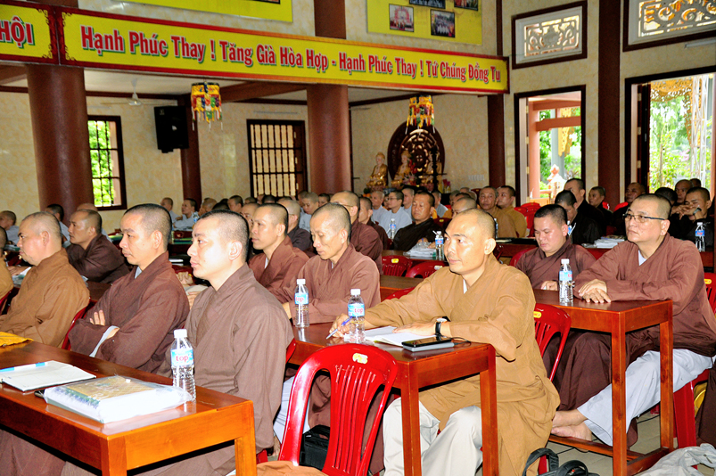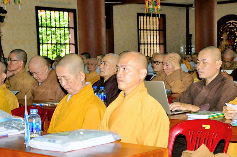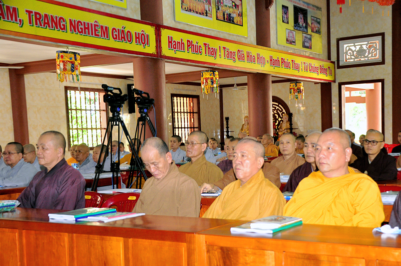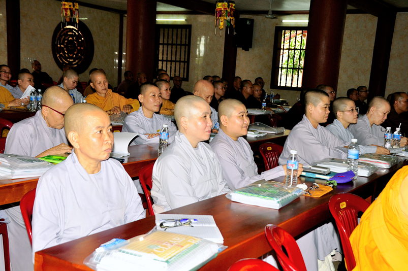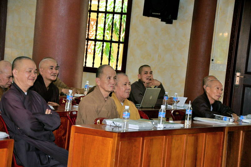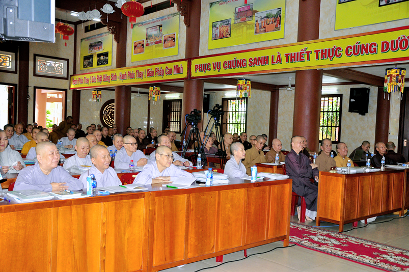 Tiếp chương trình học, Hòa thượng Huệ Thông – Phó tổng Thư ký, Chánh văn phòng II có thời triển khai Hiến chương và Nội quy Ban Tăng sự, từ 13g30 đến 16g00.
