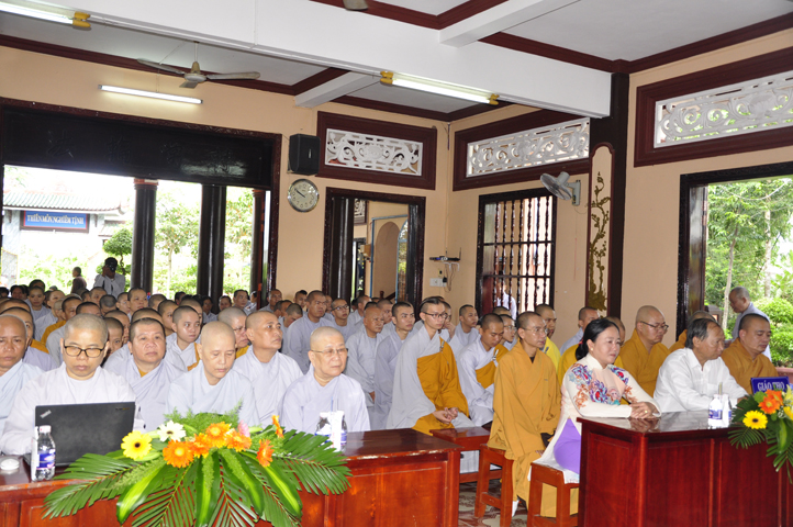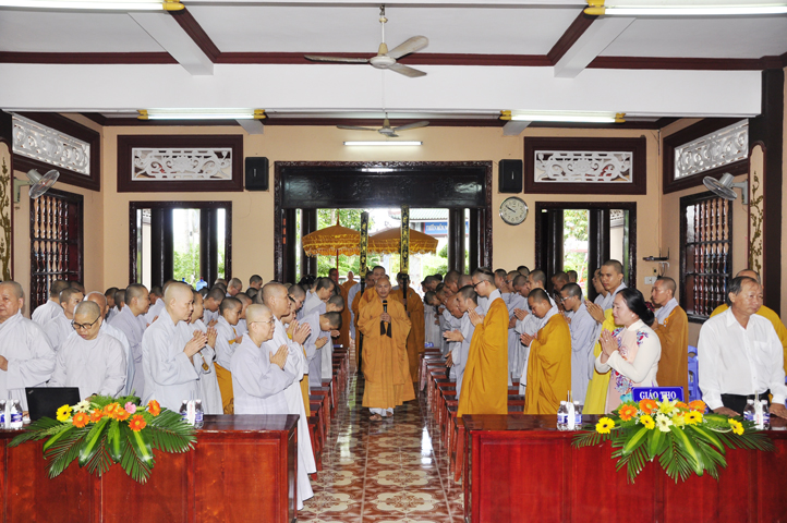 Tiếp đó, Ban tổ chức cung thỉnh HT. Thích Thiện Đức – UVHĐTSTW, Giáo phẩm chứng minh ban đạo từ cho buổi Lễ Tổng kết và Khai giảng năm học mới. Hòa thượng đã nhấn mạnh “Giáo dục là quốc sách hàng đầu của Phật giáo”. Giáo dục có ba cấp: “Giáo dục nội tự, giáo dục học đường, giáo dục xã hội”. Trong ba cấp giáo dục này, Giáo dục nội tự chính là nền tảng đầu tiên cho các Tăng Ni sinh có được định hướng tốt cho mình trước khi bước vào giai đoạn giáo dục học đường.