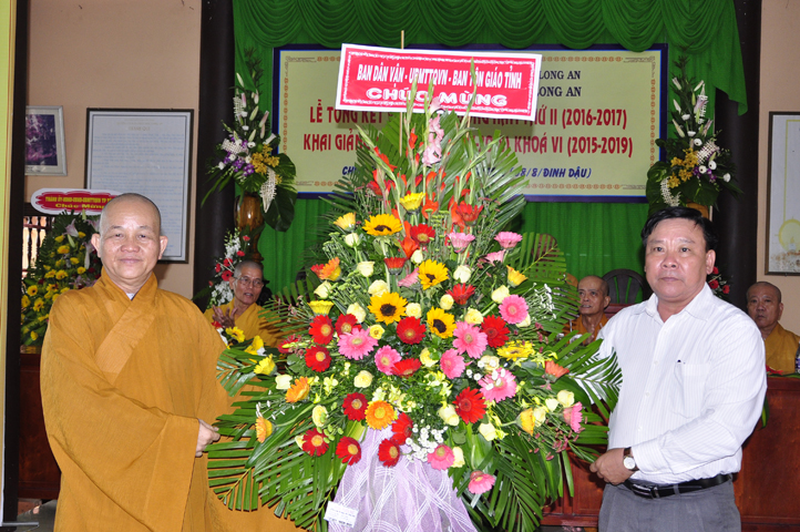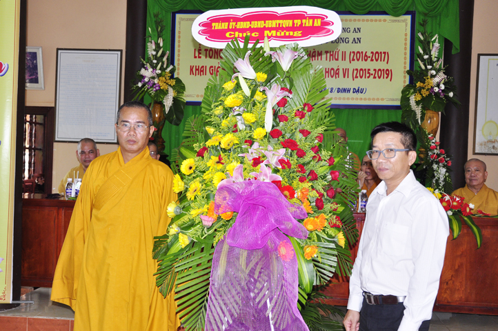 Ngoài ra, Ban Giám hiệu còn trân trọng đón nhận các lẵng hoa từ đại diện khách quý chính quyền Ban Dân Vận, Ủy ban Mặt trận Tổ quốc, do ông Công Hoàng Bạch, ông Nguyễn Hoàng Phương trao tặng. HT. Thích Minh Thiện và TT. TT. Minh Thọ đón nhận đại diện Ban Giám hiệu hoan hỷ tiếp nhận.