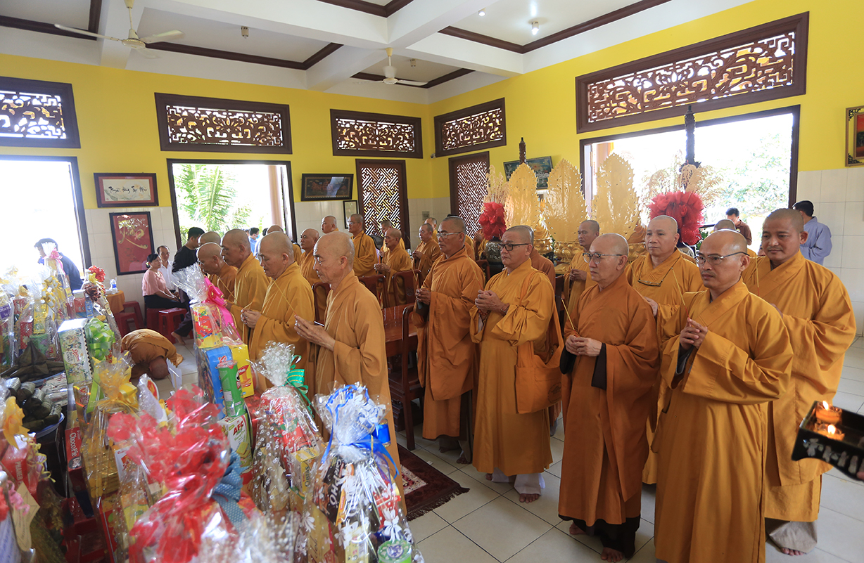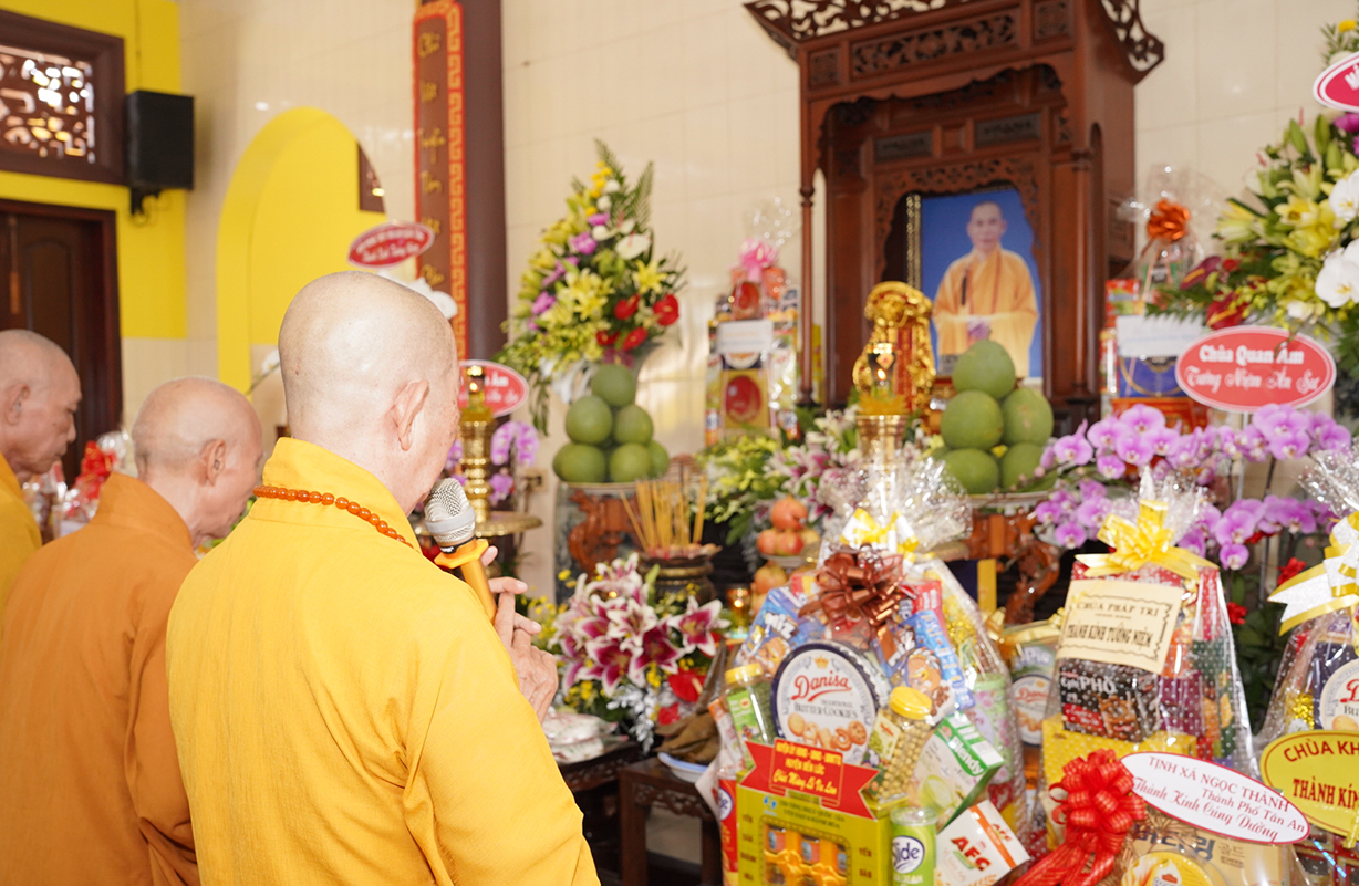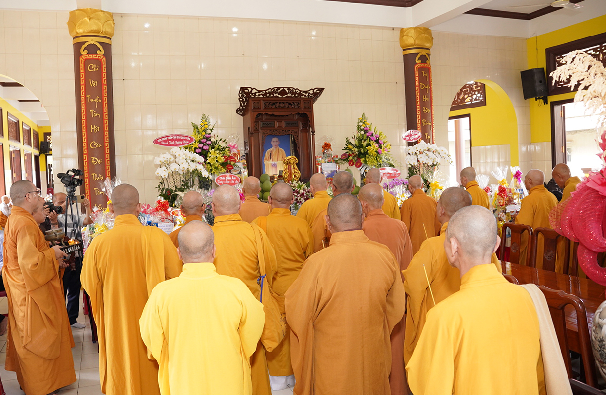 Tiếp đó, chư Tôn đức đồng thân lâm Giác linh đường thắp hương tưởng niệm vị Pháp lữ đồng hành Phật sự suốt 16 năm tròn (1990-2006). Trong buổi lễ, Đại đức Thích An Nhựt, Trưởng ban Trị sự Phật giáo huyện Thủ Thừa cung tuyên tiểu sử Cố Thượng tọa. Từ những công hạnh của Ân sư, Thượng tọa Thích An Trung thành kính dâng lời tác bạch cúng dường Đại tăng.