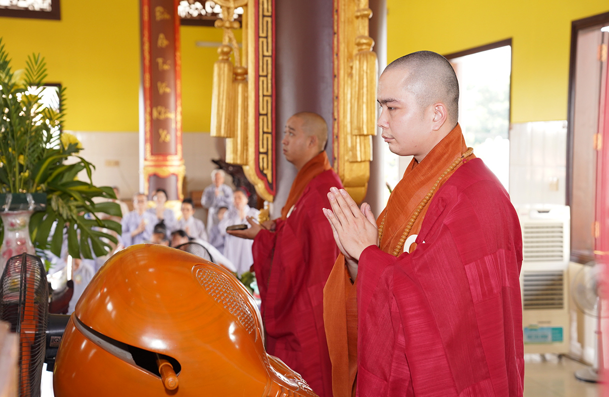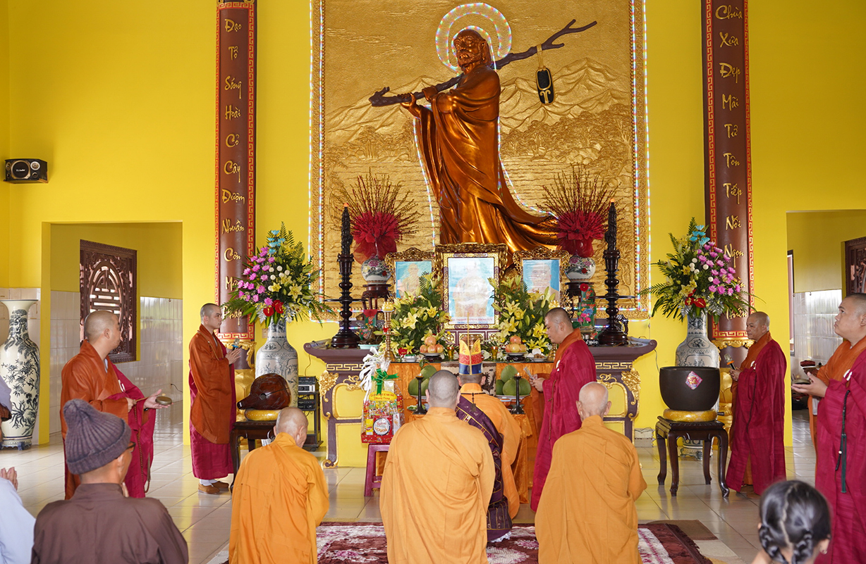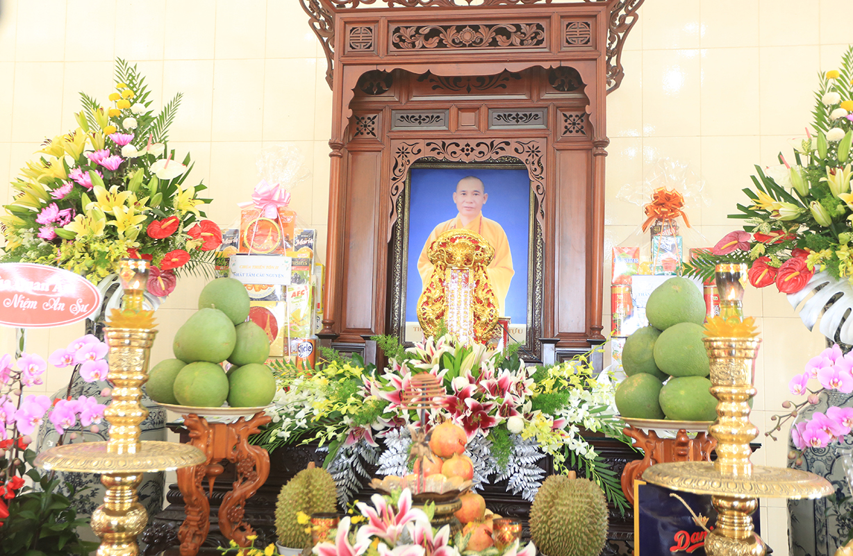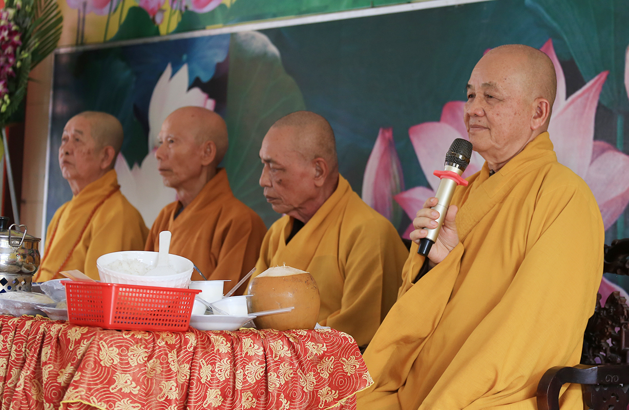 Tiếp đó, chư Tôn đức đồng thân lâm Giác linh đường thắp hương tưởng niệm vị Pháp lữ đồng hành Phật sự suốt 16 năm tròn (1990-2006). Trong buổi lễ, Đại đức Thích An Nhựt, Trưởng ban Trị sự Phật giáo huyện Thủ Thừa cung tuyên tiểu sử Cố Thượng tọa. Từ những công hạnh của Ân sư, Thượng tọa Thích An Trung thành kính dâng lời tác bạch cúng dường Đại tăng.