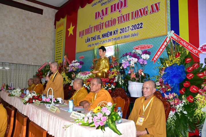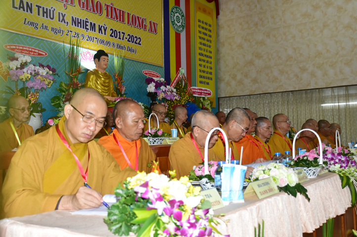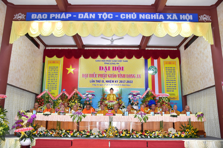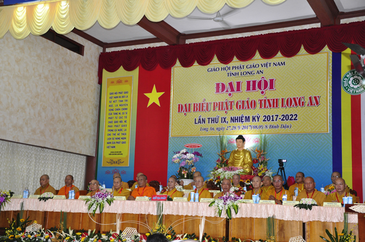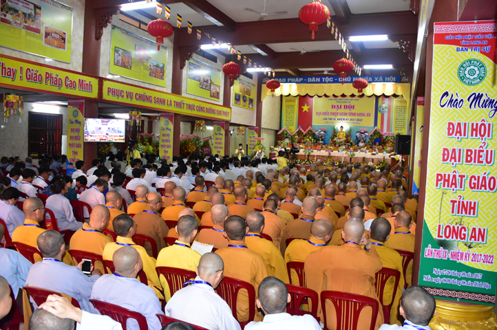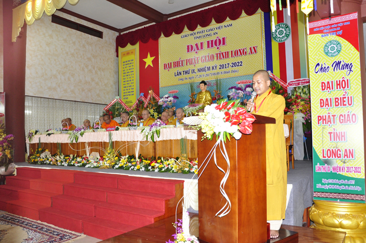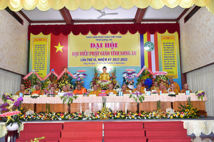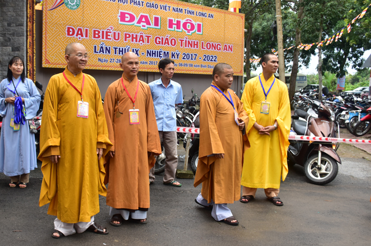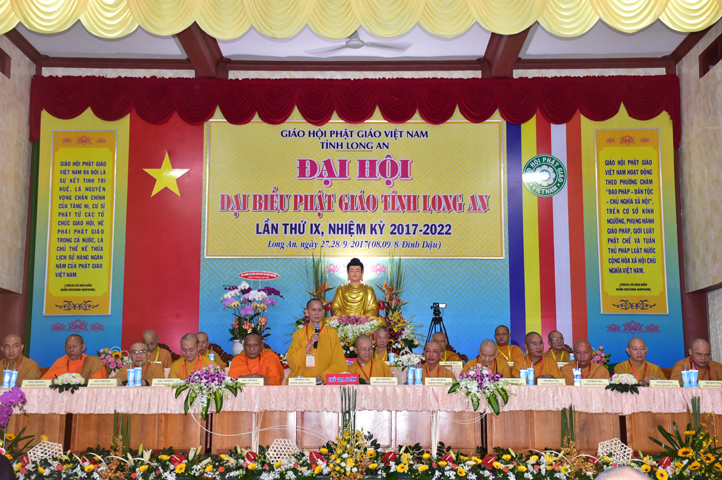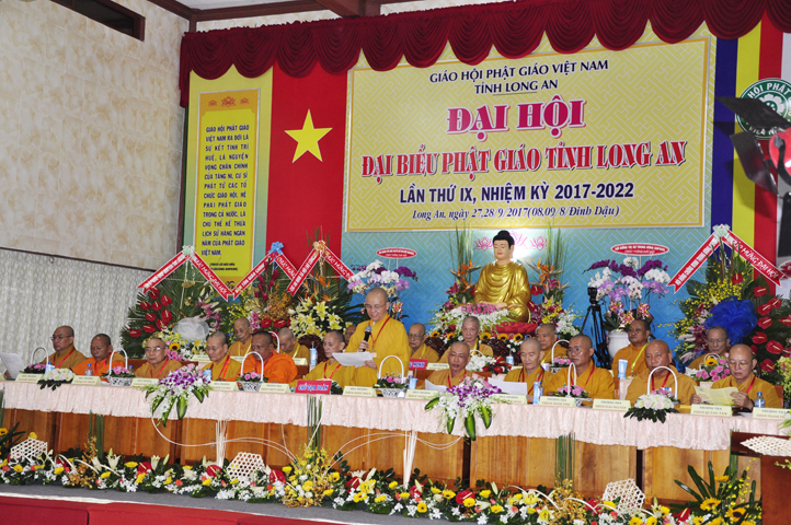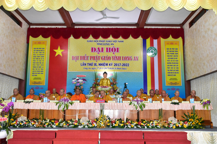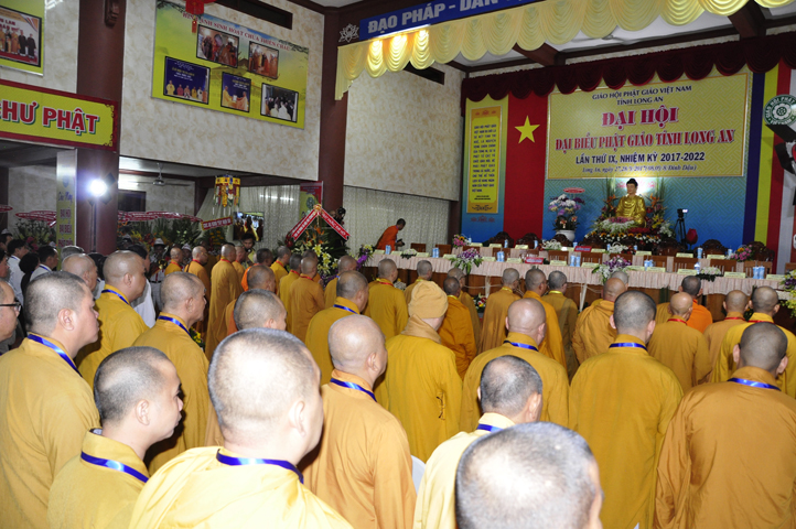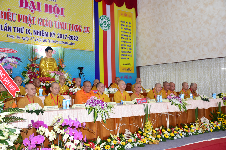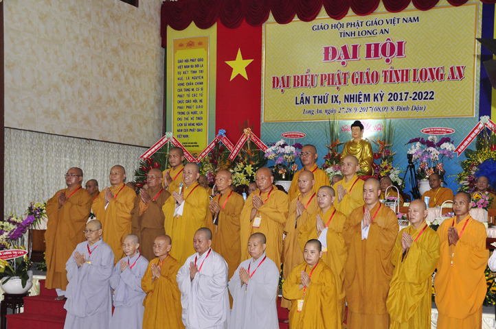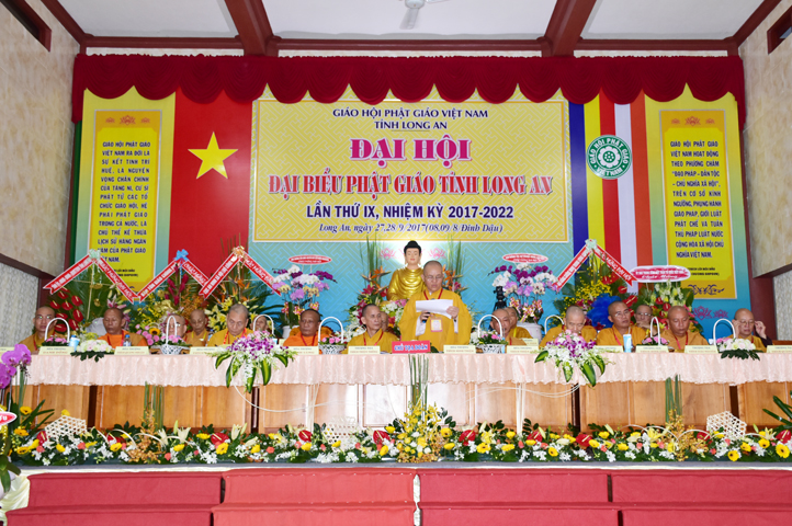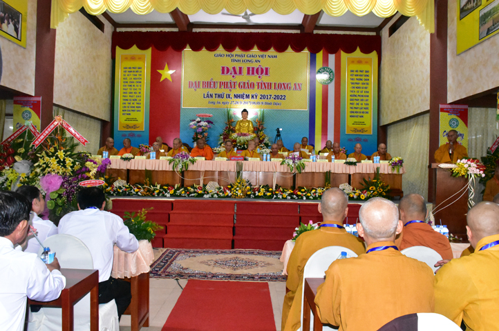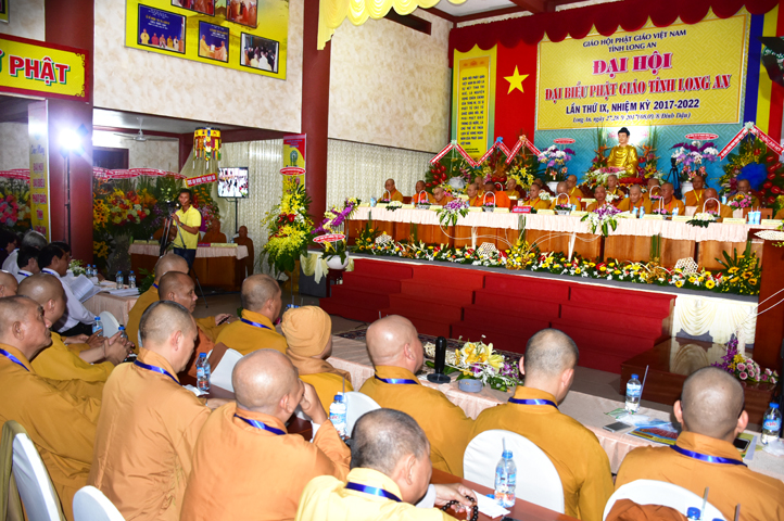 Sau phần cung nghinh chư Tôn đức Giáo phẩm, TT. Thích Minh Thọ -Thường trực Phó Ban Trị sự Phật giáo tỉnh Long An tuyên bố lý do tổ chức Đại hội. Tiếp theo, chư Tôn đức Ban Kiểm soát đã kính trình chư Tôn đức Giáo phẩm, Chủ tọa đoàn danh sách số lượng 769 vị đại biểu chư Tăng Ni và 1000 Phật tử tham dự Đại hội. Với tỷ lệ yêu cầu phù hợp với số Đại biểu tham dự, Đại hội Phật giáo Long An đầy đủ tư cách pháp nhân, pháp lý tiến hành Hội nghị chính thức lần thứ IX nhiệm kỳ (2017-2022).