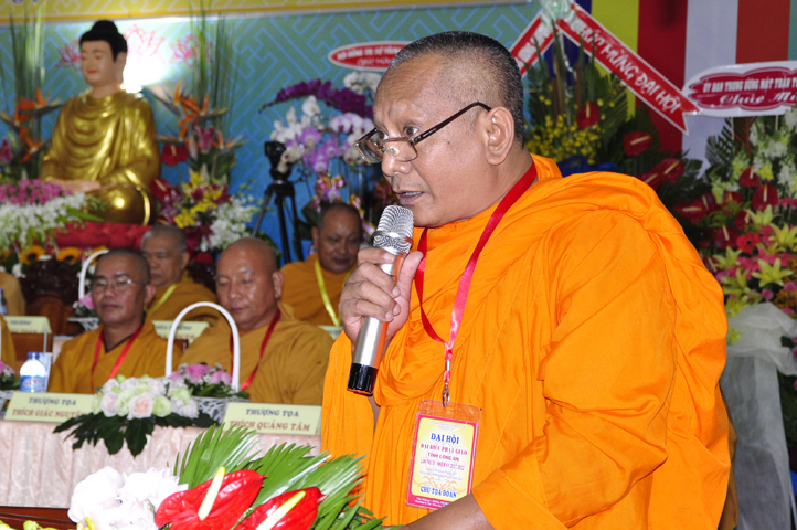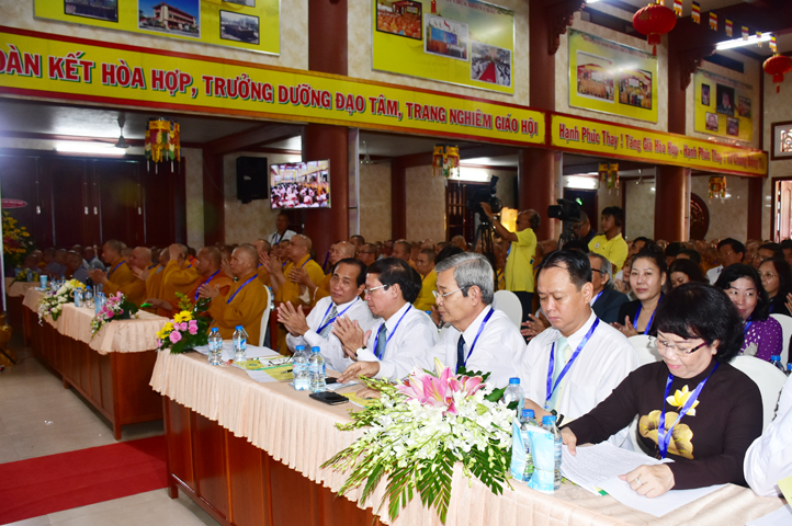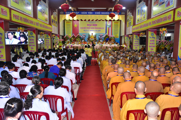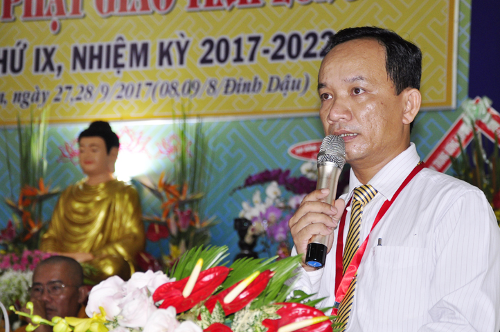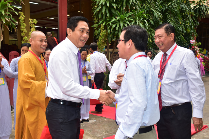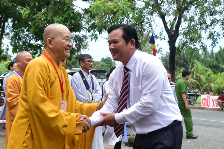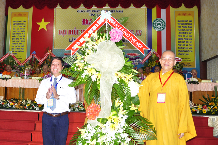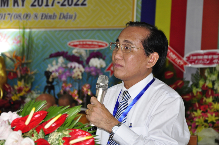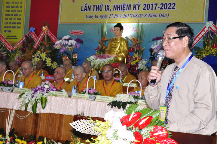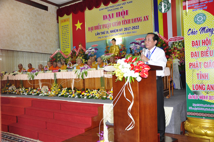 Thể hiện tinh thần hòa hợp Đạo pháp – Dân tộc, ông Nguyễn Thanh Cang đại diện cấp Lãnh đạo tỉnh Long An phát biểu chúc mừng Đại hội. Ông đánh giá cao kết quả, những thành tựu mà Phật giáo Long An đã đạt được. Trong niềm vui HT. Thích Minh Thiện tái đắc cử cùng tinh thần trẻ hóa nhân sự Tăng Ni nhiệm kỳ mới, Lãnh đạo tỉnh tin tưởng và chúc mừng Phật giáo Long An tương lai sẽ ngày càng vững mạnh, phát triển sâu rộng hơn.