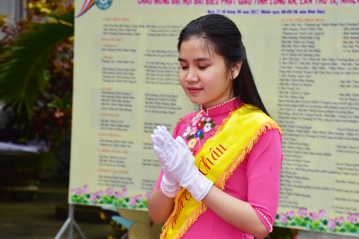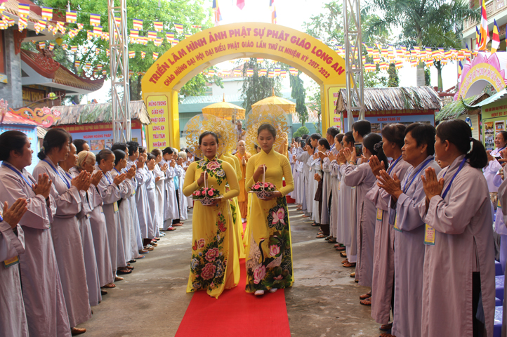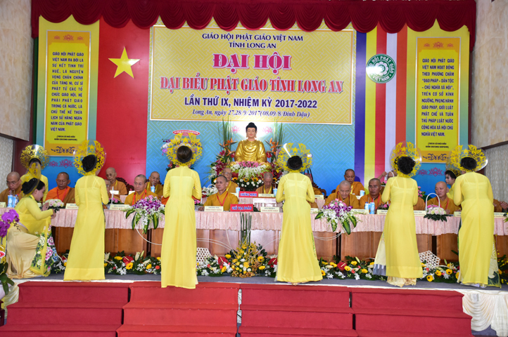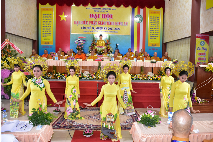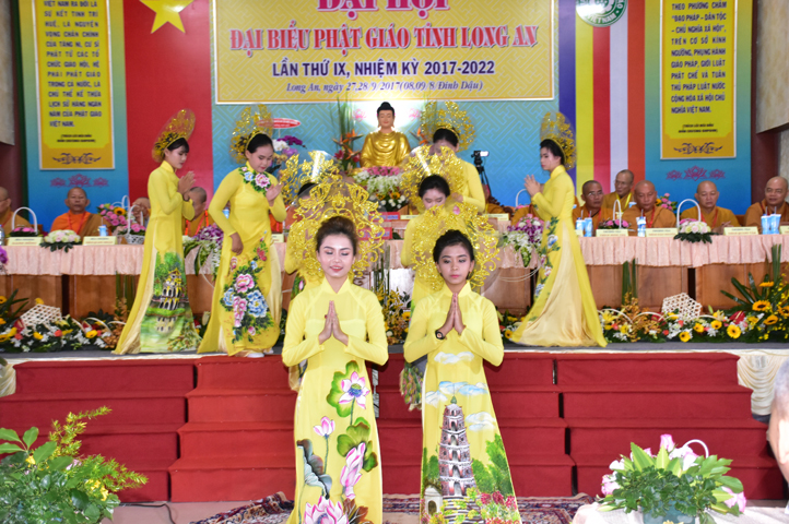 Mở đầu Đại hội, HT. Thích Minh Thiện- UV HĐTS, Trưởng Ban Trị sự Phật giáo tỉnh Long An tuyên đọc diễn văn Khai mạc Đại hội Phật giáo Long An lần thứ IX, nhiệm kỳ (2017-2022). Trang nghiêm nghi thức kính mừng Đại hội, đoàn thanh thiếu niên Tp. Tân An dâng hoa cúng dường.