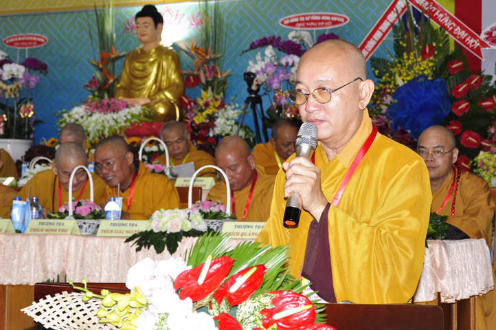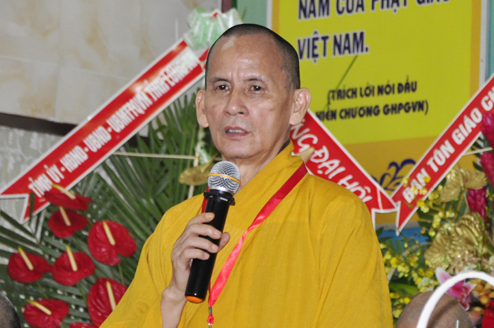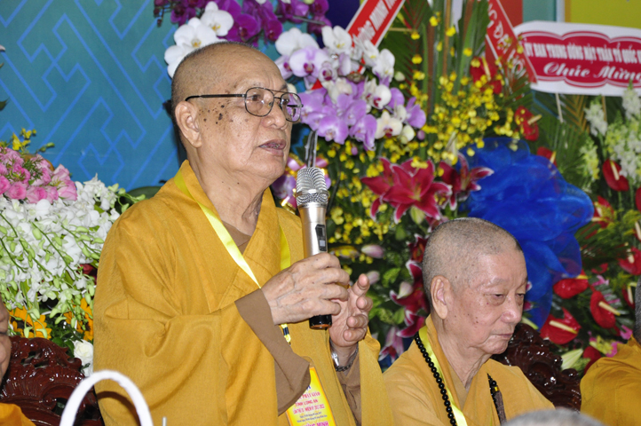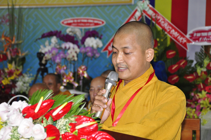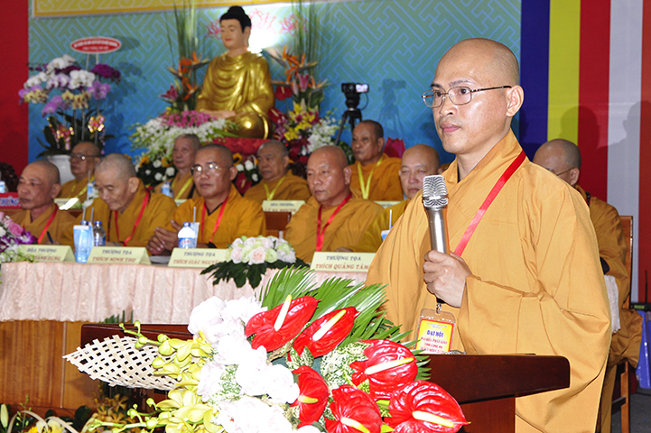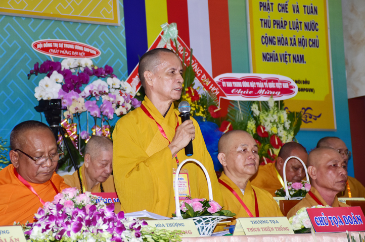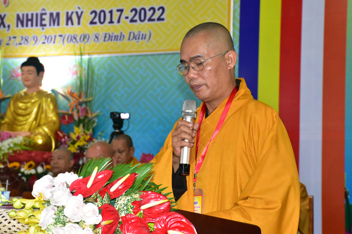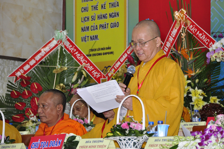 Tiếp theo, TT. Thích Thiện Thống – Chủ tọa đoàn mời HT. Thích Minh Thiện tuyên bố mãn nhiệm kỳ khóa VIII (2012-2017). Trong phút giây cảm động này, HT. Thích Minh Thiện đã có lời phát biểu mãn nhiệm và chuyển giao trách nhiệm Lãnh đạo cho Tân ban Trị sự nhiệm kỳ IX.