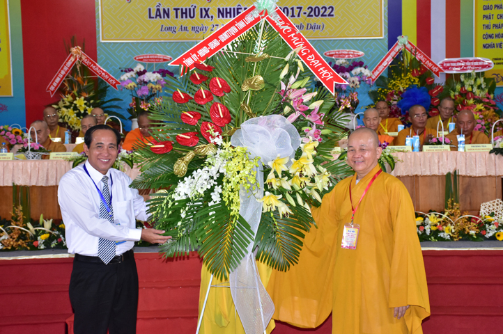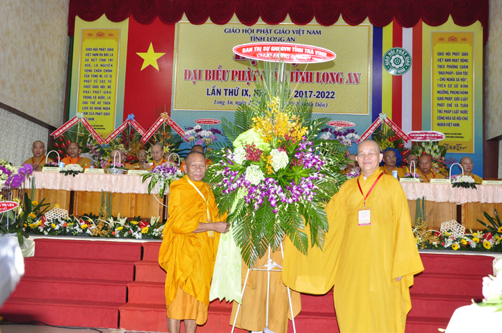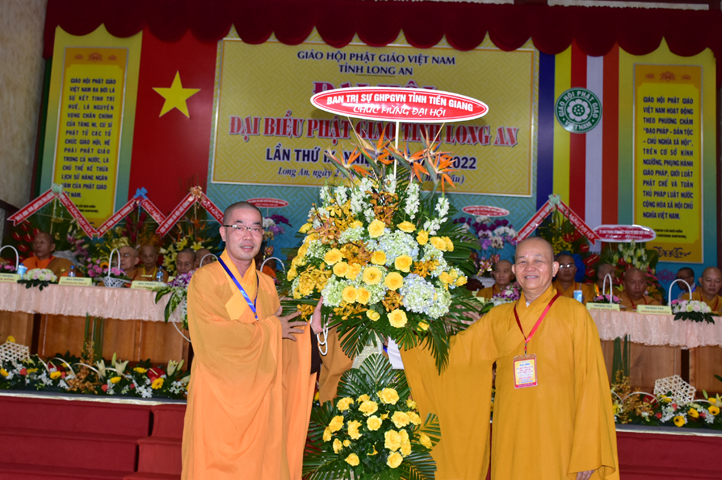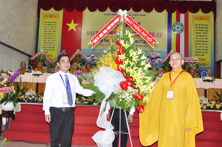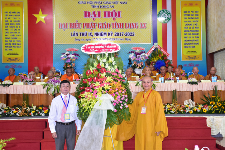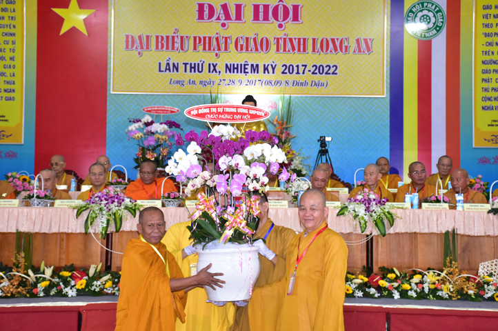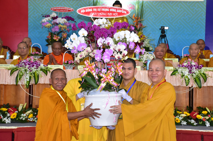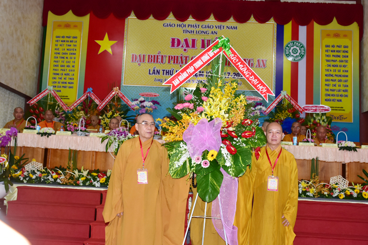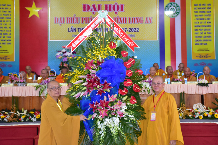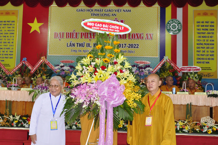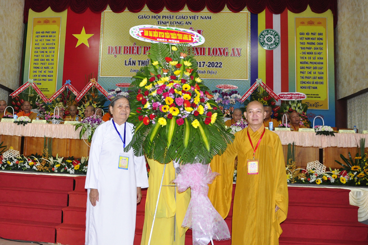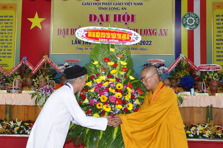 Đại hội tiếp tục với phần mục trao tặng hoa chúc mừng của chư Tôn đức Giáo phẩm TW, các Ban, Ngành, Viện; chư Tôn đức các Ban Trị sự tỉnh, thành; các nhân sĩ tôn giáo bạn và lãnh đạo các cấp chính quyền v.v.. Thể hiện mối tương giao giữa Đạo pháp và Dân tộc, Lãnh đạo chính quyền cấp tỉnh Long An đã chân tình gởi tặng lẵng hoa chúc mừng Đại hội.