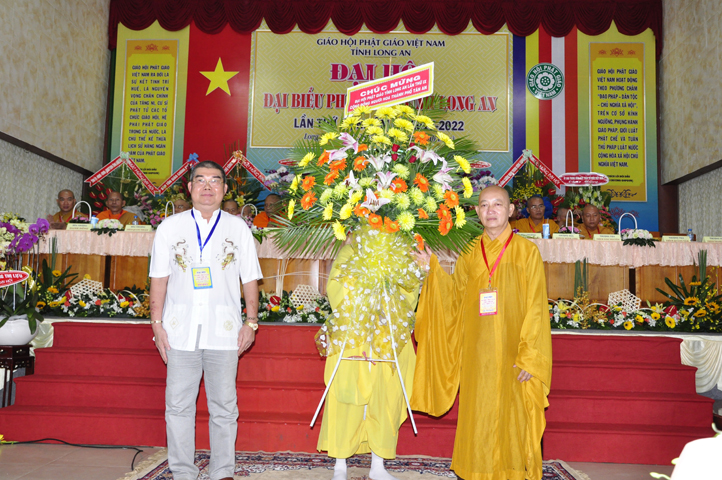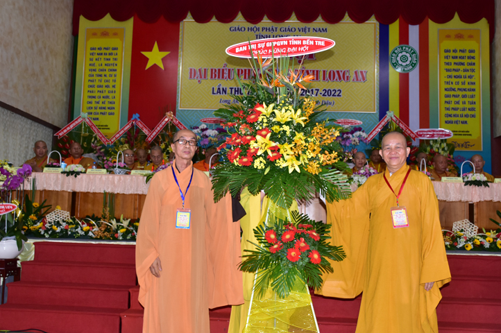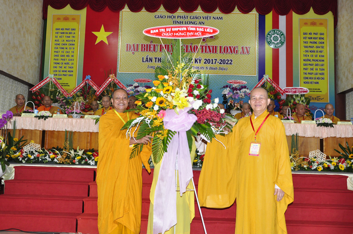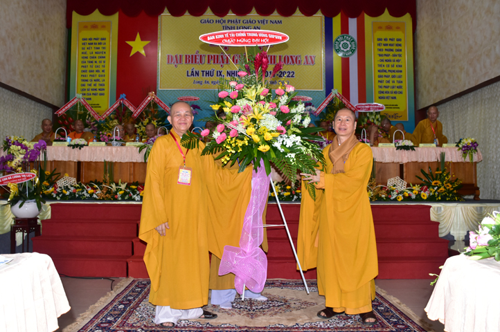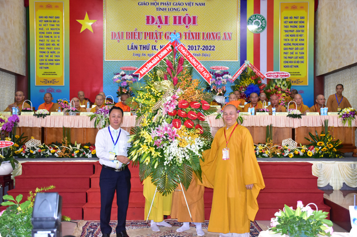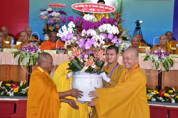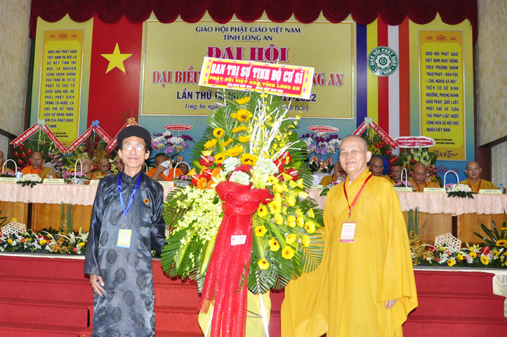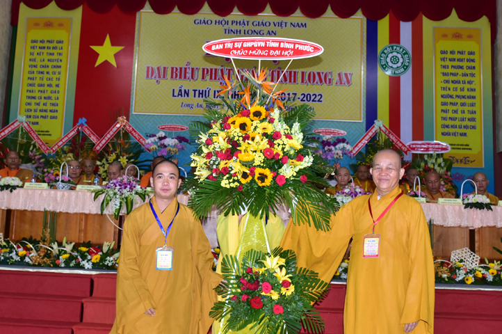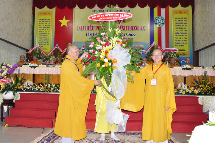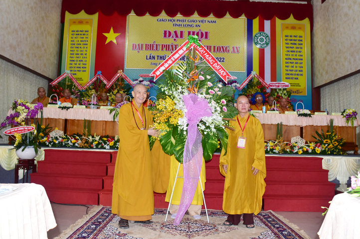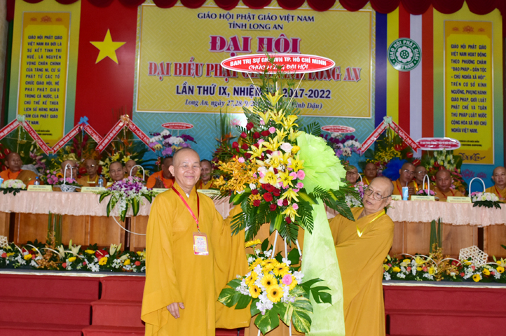Đại hội tiếp tục với phần mục trao tặng hoa chúc mừng của chư Tôn đức Giáo phẩm TW, các Ban, Ngành, Viện; chư Tôn đức các Ban Trị sự tỉnh, thành; các nhân sĩ tôn giáo bạn và lãnh đạo các cấp chính quyền v.v.. Thể hiện mối tương giao giữa Đạo pháp và Dân tộc, Lãnh đạo chính quyền cấp tỉnh Long An đã chân tình gởi tặng lẵng hoa chúc mừng Đại hội.