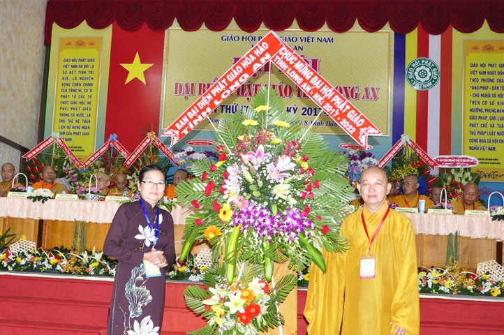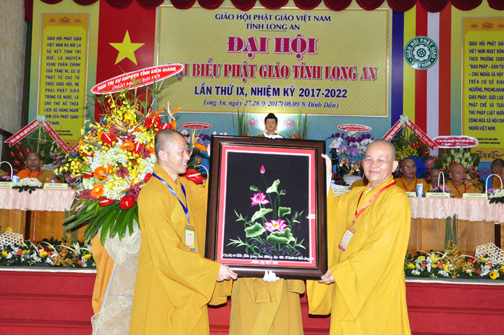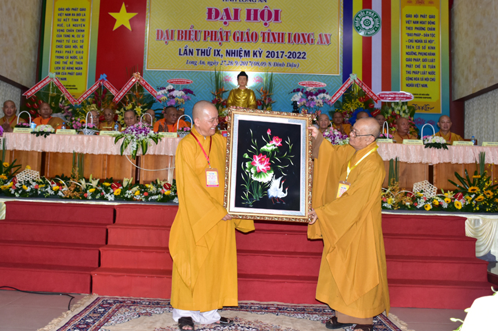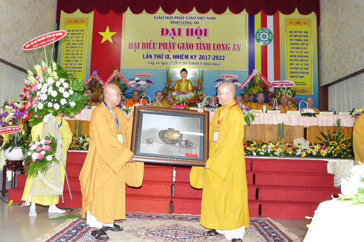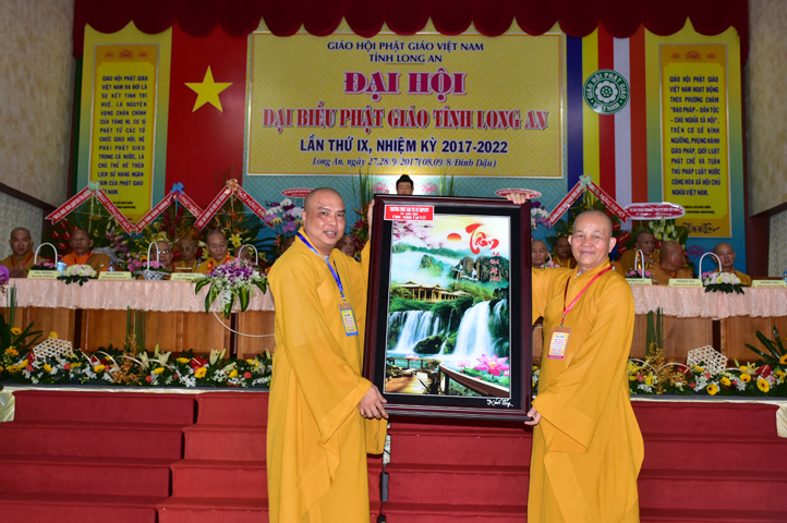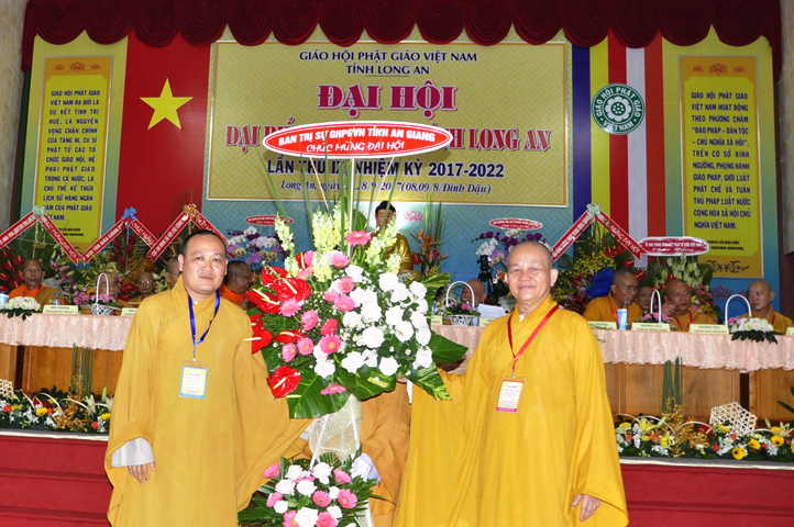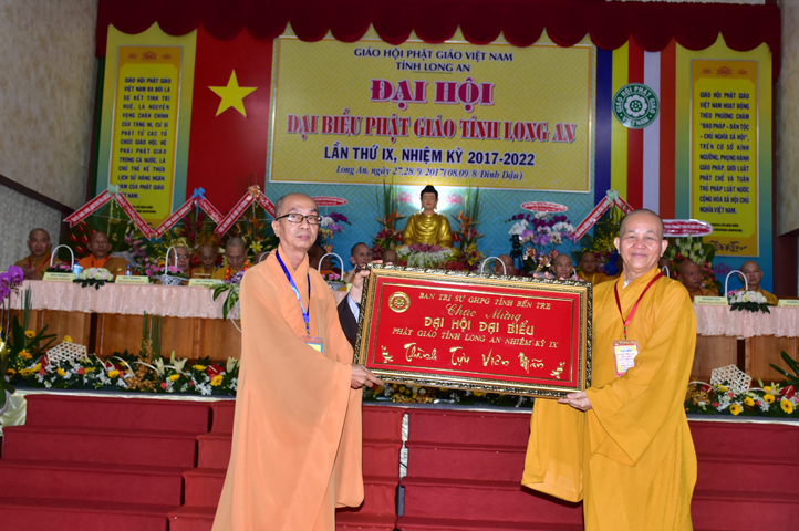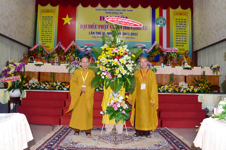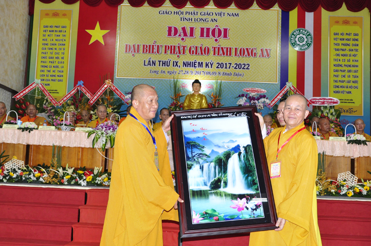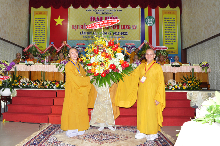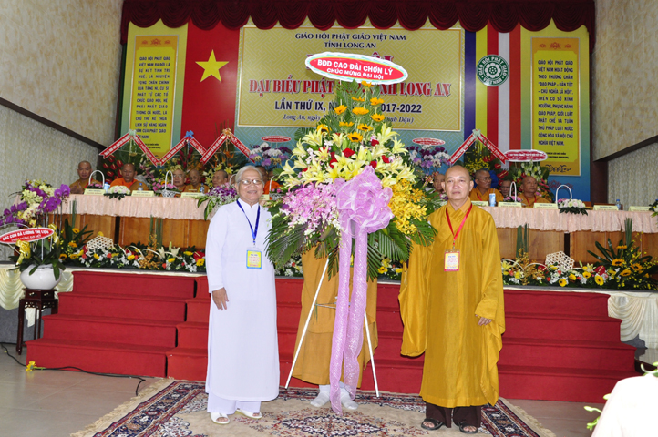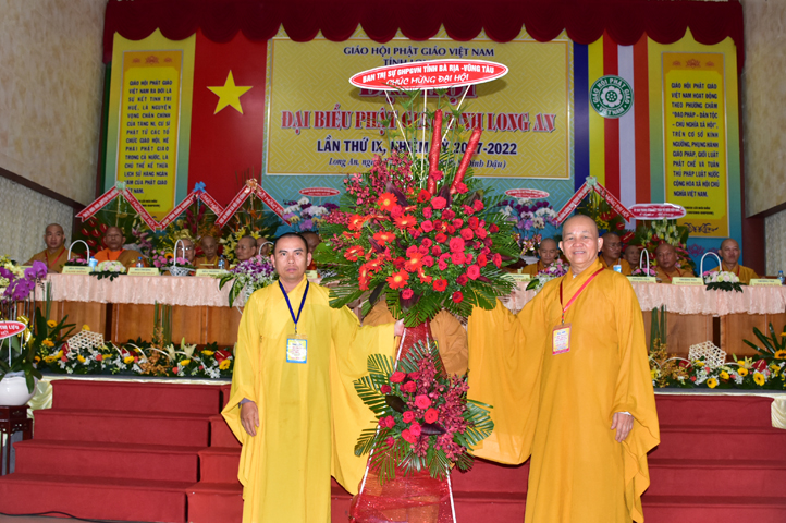 Đại hội tiếp tục với phần mục trao tặng hoa chúc mừng của chư Tôn đức Giáo phẩm TW, các Ban, Ngành, Viện; chư Tôn đức các Ban Trị sự tỉnh, thành; các nhân sĩ tôn giáo bạn và lãnh đạo các cấp chính quyền v.v.. Thể hiện mối tương giao giữa Đạo pháp và Dân tộc, Lãnh đạo chính quyền cấp tỉnh Long An đã chân tình gởi tặng lẵng hoa chúc mừng Đại hội.