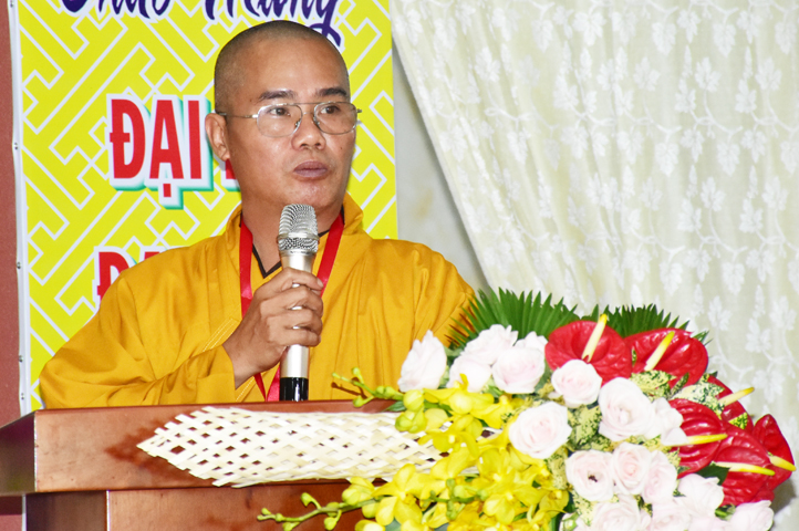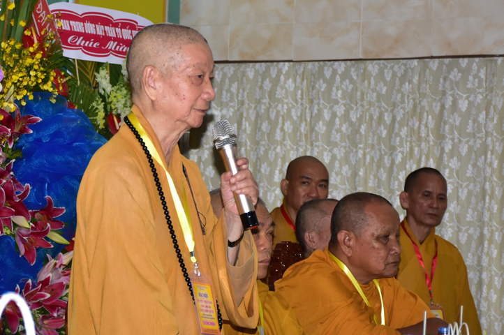 Chúc mừng Tân Ban Trị sự, HT. Thích Trí Quảng ban đạo từ sách tấn, động viên chư Tôn đức. Trưởng lão Hòa thượng Phó Pháp chủ GHPGVN chân tình nhắc lại các giai đoạn khởi đầu của Phật giáo Việt Nam. Trải qua biết bao khó khăn thăng trầm trong lịch sử nhưng Phật giáo vẫn thường trụ trong lòng Dân tộc. Vì vậy, trước những thành quả Phật giáo Long An đã đạt, Ngài mong mỏi Tân Ban Trị sự trong sự lãnh đạo của HT. Thích Minh Thiện hãy đoàn kết, gắn bó; hãy quan tâm đến đời sống của nhân dân, trải rộng tình thương đến mọi nơi, làm tốt các công tác Phật sự. Đó chính là món quà tri ân cao đẹp nhất của người tu sĩ. Tri ân tấm lòng Trưởng lão Hòa thượng Phó Pháp Chủ, HT. Thích Minh Thiện cùng Tăng Ni Long An phát nguyện “y giáo phụng hành”.