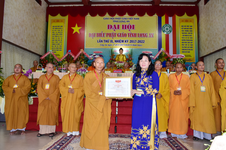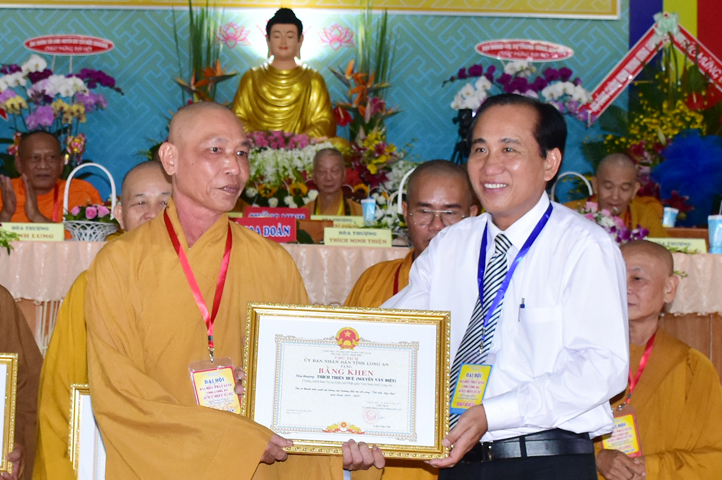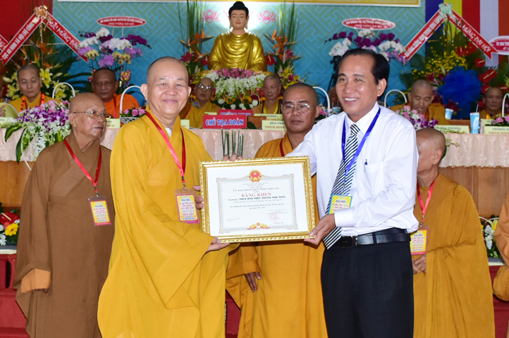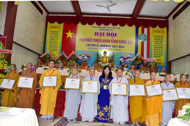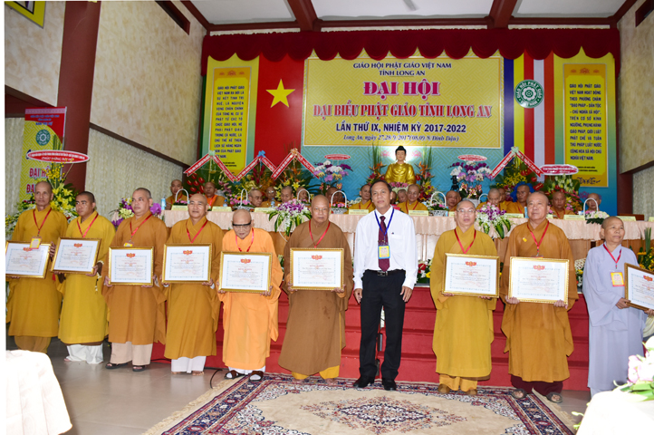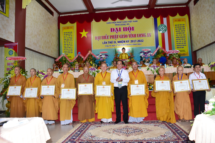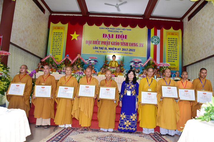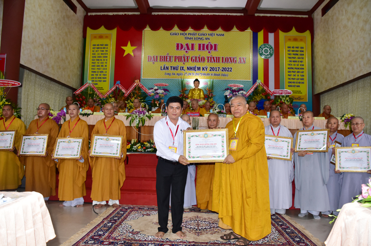 Chúc mừng Đại hội, Lãnh đạo Ủy ban Mặt trận Tổ quốc tỉnh Long An cũng đã vinh danh và trao tặng 10 bằng khen cho 10 đơn vị Ban Trị sự, 20 bằng khen cá nhân Tăng Ni tỉnh Long An, do ông Lê Văn Hùng – Tỉnh ủy viên và Bà Phạm Ngọc Tiệp – Phó Chủ tịch MTTQVN tỉnh Long An trao tặng.