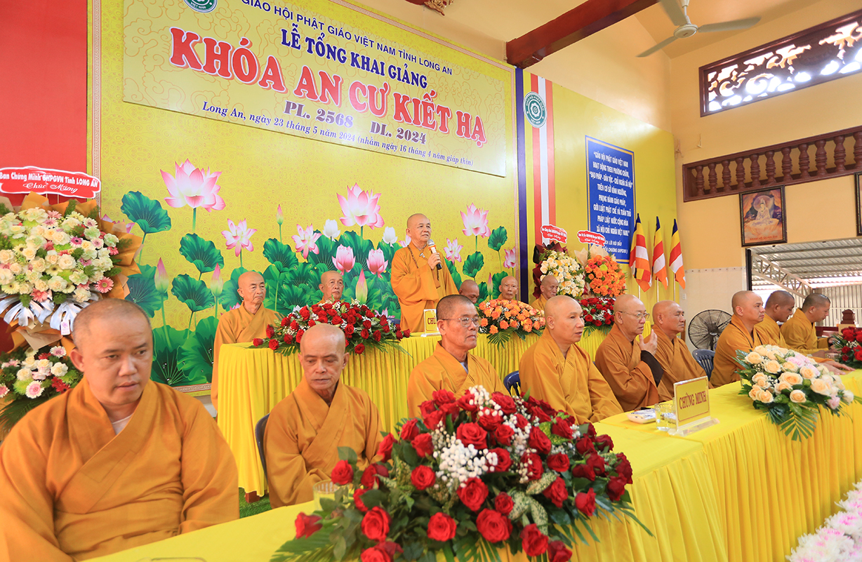 Tại buổi lễ, Đại đức Thích Thiện Danh – Phó Thư ký kiêm Chánh Văn Phòng Ban Trị sự GHPGVN tỉnh Long An báo cáo công tác tổ chức Khoá An cư Kiết hạ Phật lịch 2568 – DL 2024. Đại đức Cung An chức sự Chư tôn đức Ban tổ chức Khóa An Cư Kiết Hạ năm 2024 của Ban Thường trực BTS GHPGVN tỉnh Long An. Theo báo cáo: Các trường hạ sẽ học các chuyên đề về Kinh – Luật – Luận, thực hiện Bố tát đầy đủ mỗi tháng 2 lần, Hành chánh Giáo hội, Bồi dưỡng Kiến thức Trụ trì, Luật Tín ngưỡng Tôn giáo …Được biết, mùa An cư kiết hạ năm nay, Phật giáo Long An tổ chức 13 điểm An cư Kiết hạ cho hơn 500 vị Tăng Ni trong tỉnh tu học
