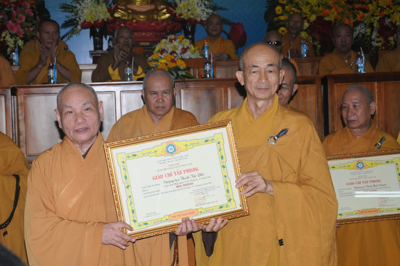 Trong giờ phút thiêng liêng trang trọng, HT. Thích Tấn Đạt – Phó Ban Thường trực Văn phòng 2, tuyên đọc các điều lệ theo Quyết định Tấn phong Giáo phẩm của Giáo hội Phật giáo Việt Nam do Đức Trưởng lão Pháp chủ Thích Phổ Tuệ đã ký, gồm có 51 vị trong các bậc: Giáo phẩm Hòa thượng (13 vị); NT (7 vị); TT ( vị ); NS (vị).