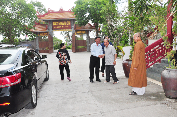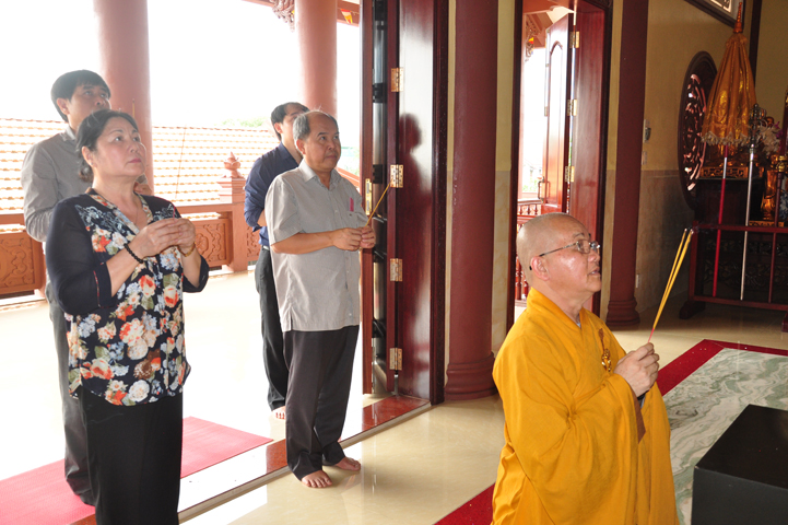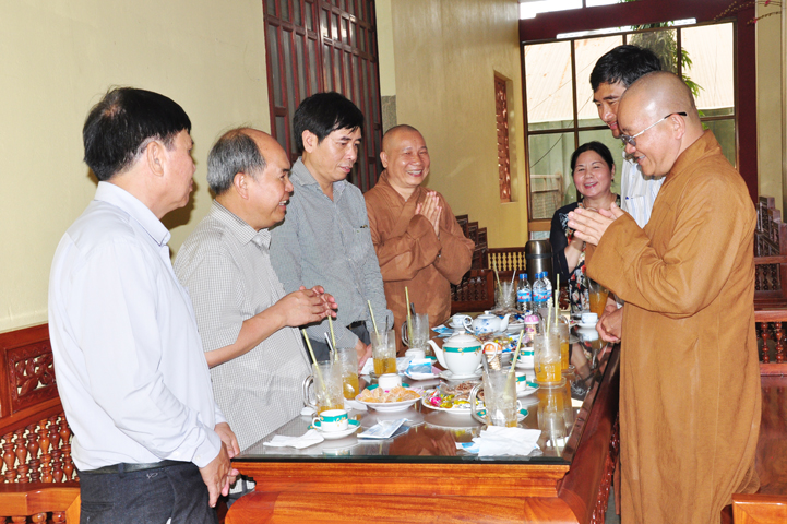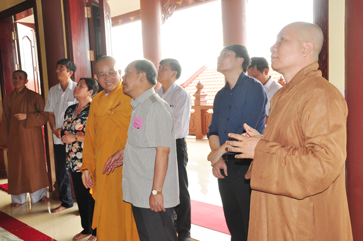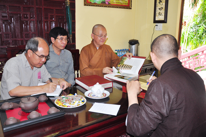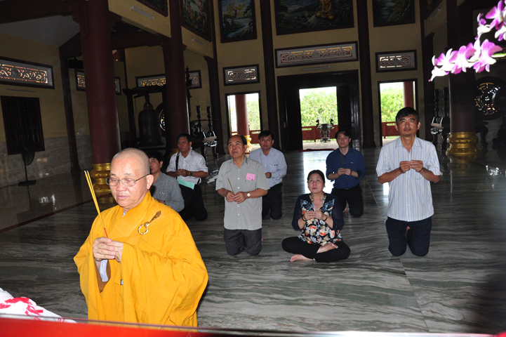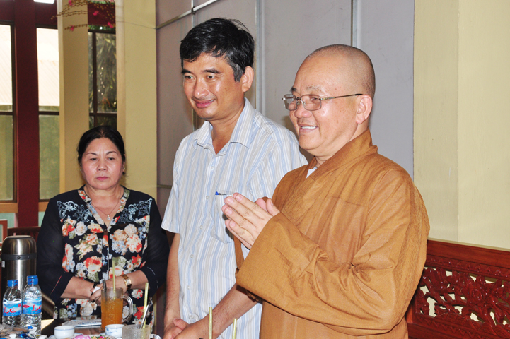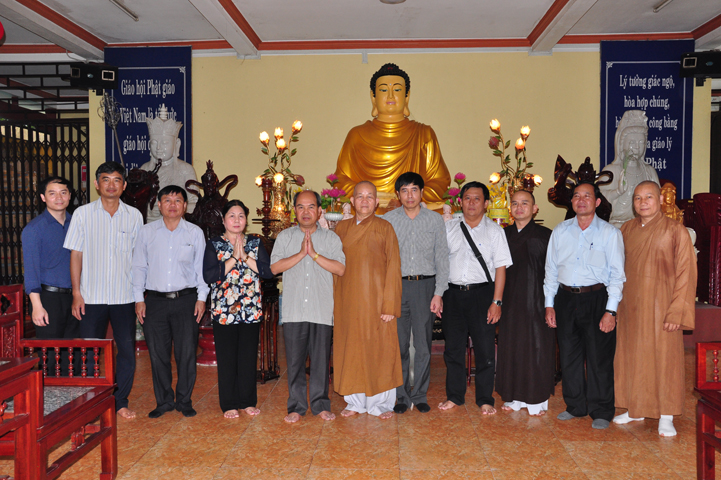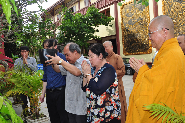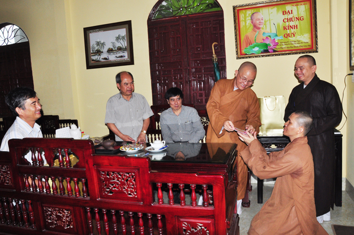 Tiếp đón đoàn có HT. Thích Minh Thiện- UVHĐTSTƯ, Phó Ban Hoằng Pháp trung ương, Trưởng Ban trị sự GHPGVN tỉnh Long An, Trụ trì chùa Thiên Châu; Ông Nguyễn Văn Thuần- Trưởng Ban Tôn Giáo tỉnh Long An.