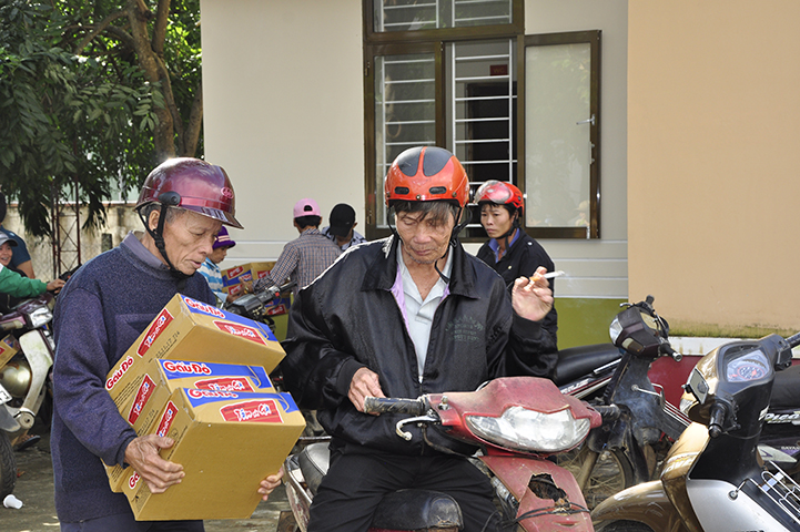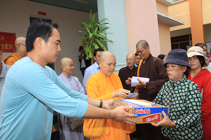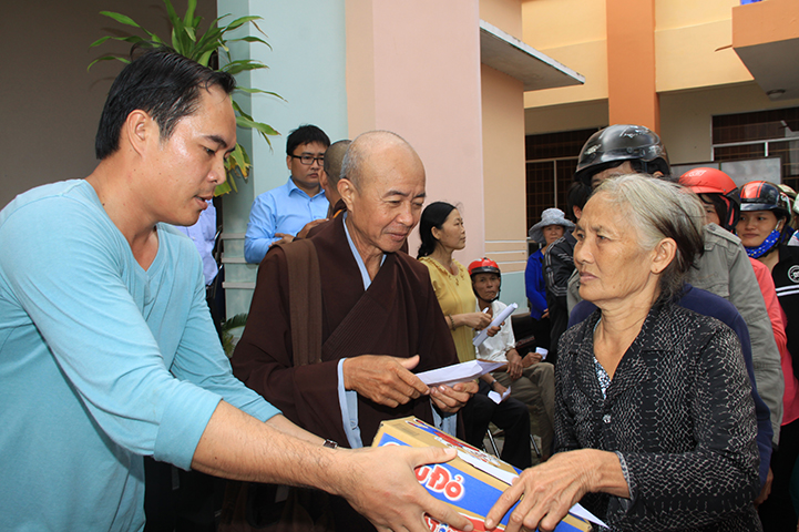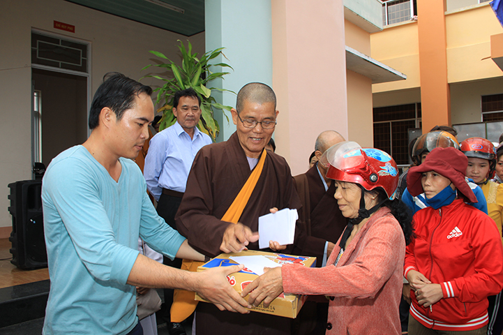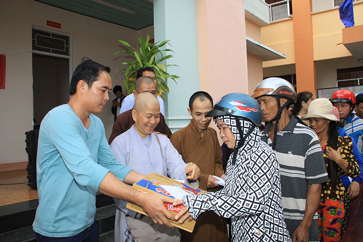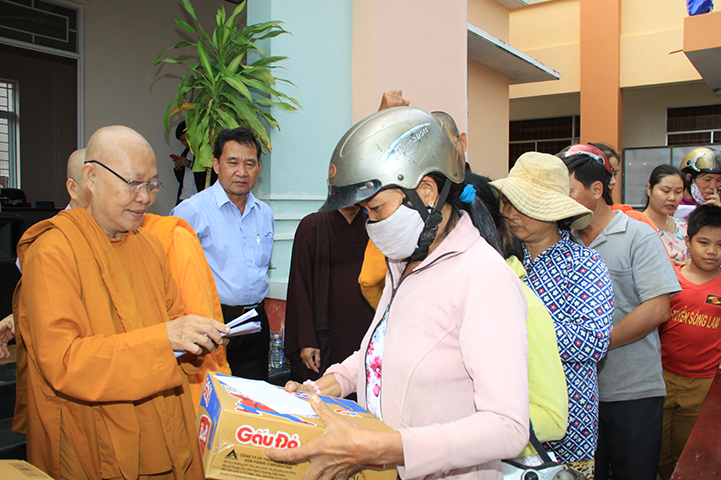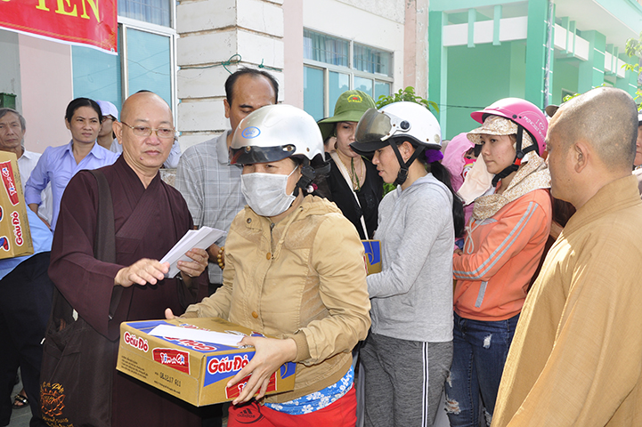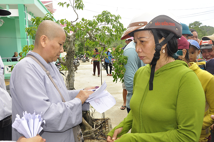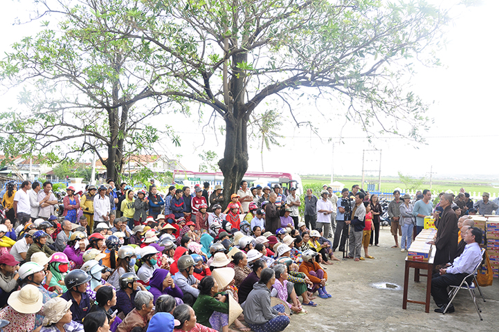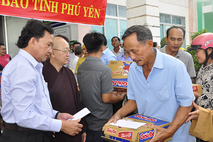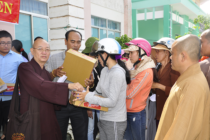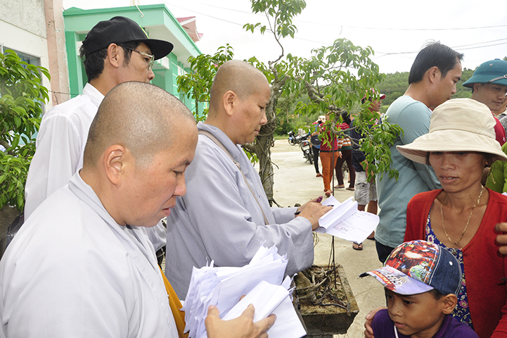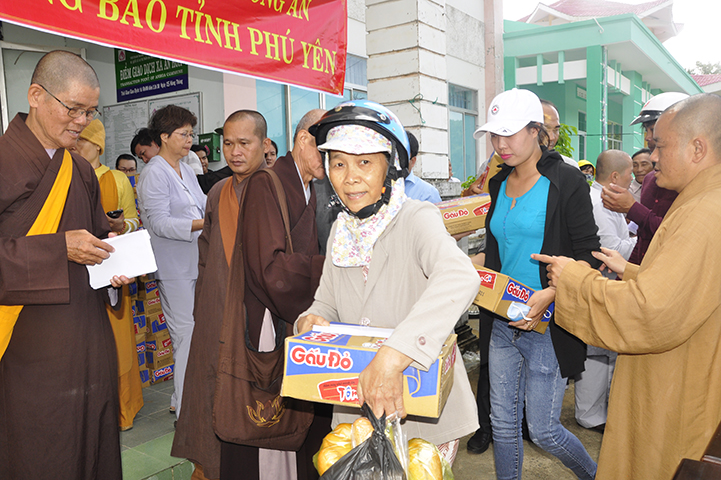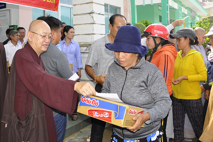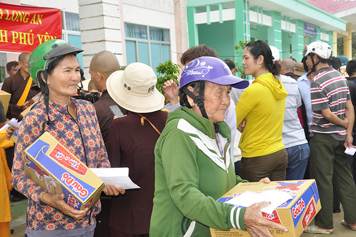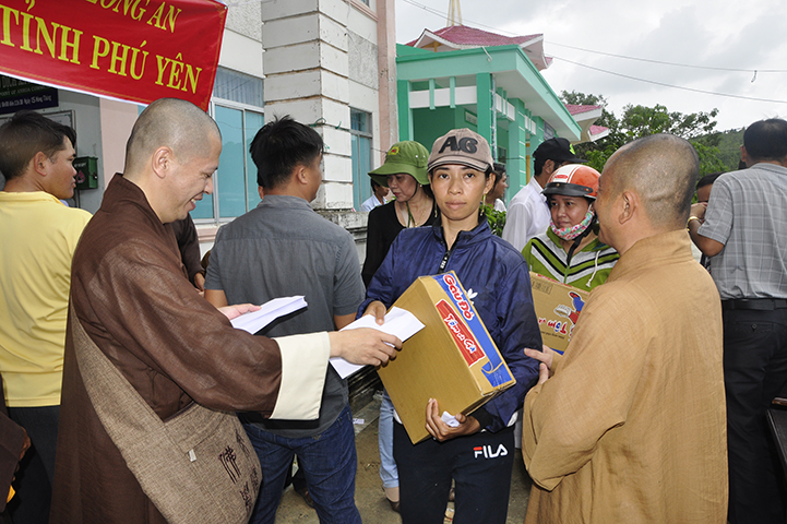 Tại các điểm phát quà, Thượng tọa Thích Quảng Tâm, ĐĐ. Thích Lệ Tấn thay lời HT. Thích Minh Thiện : UVHĐTS GHPGVN – Trưởng BTS GHPGVN tỉnh Long An kính vấn an sức khỏe đến chư Tôn Đức Tăng Ni Phật tử Phật giáo Phú Yên, chúc sức khỏe đến quý lãnh đạo Chính quyền. Nhị vị Thượng tọa đã chia sẻ những khó khăn, mất mác to lớn đối với bà con, đồng thời nhắn nhủ bà con cố gắng vượt qua nỗi khó khăn này.