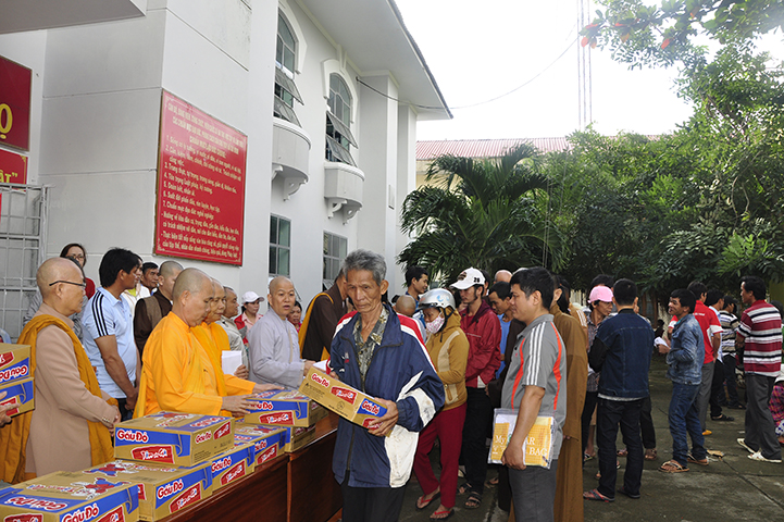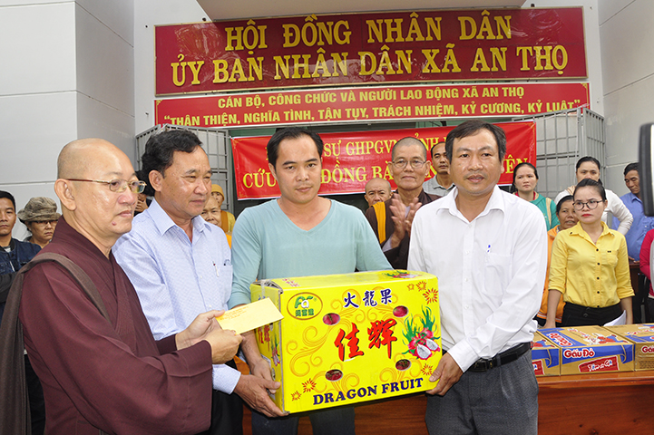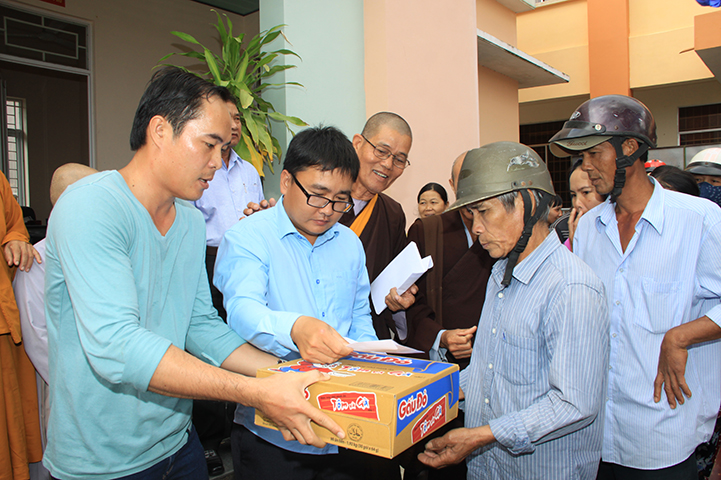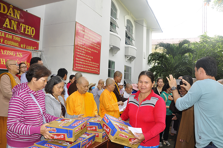 Với sự hướng dẫn phái đoàn của ĐĐ. Thích Chúc Phát, phái đoàn xuất phát lúc 07giờ 00 tại chùa Bảo Tịnh (văn Phòng Ban trị sự tỉnh Phú Yên) đến các địa điểm nêu trên để phát quà cho bà con. Tại địa điểm xã An Thọ phái đoàn phát 250 phần, xã An Hiệp 250 phần và tại xã An Hải đoàn tập trung bà con 2 xã (An Hải, An Hòa) phát 500 phần. Mỗi phần quà gồm 1 thùng mì và 500 nghìn đồng tiền mặt.