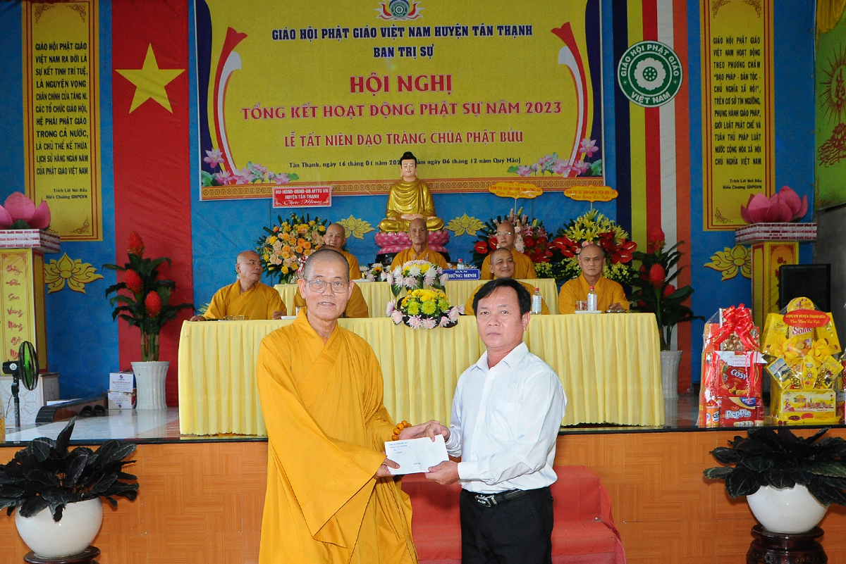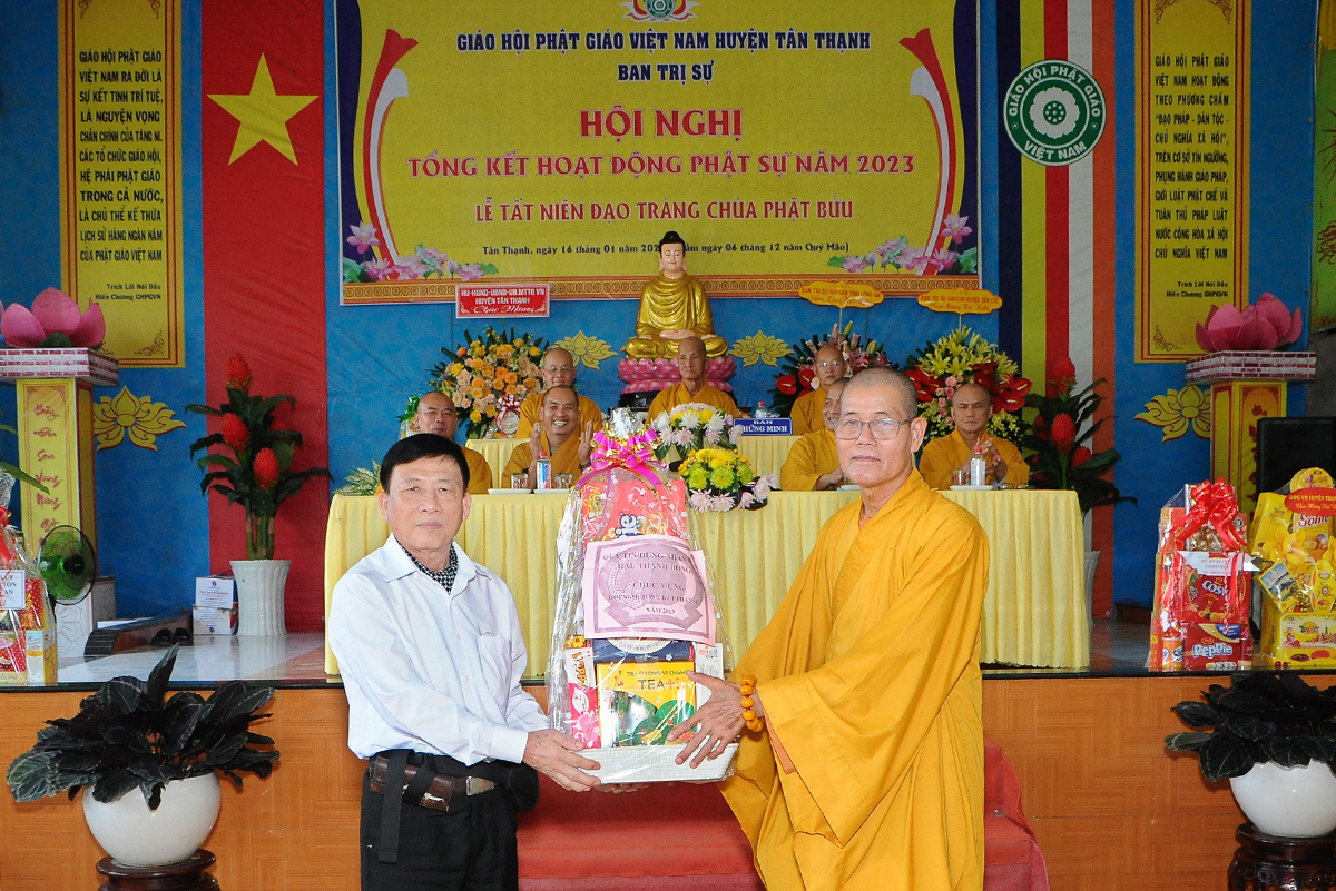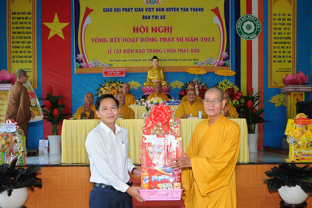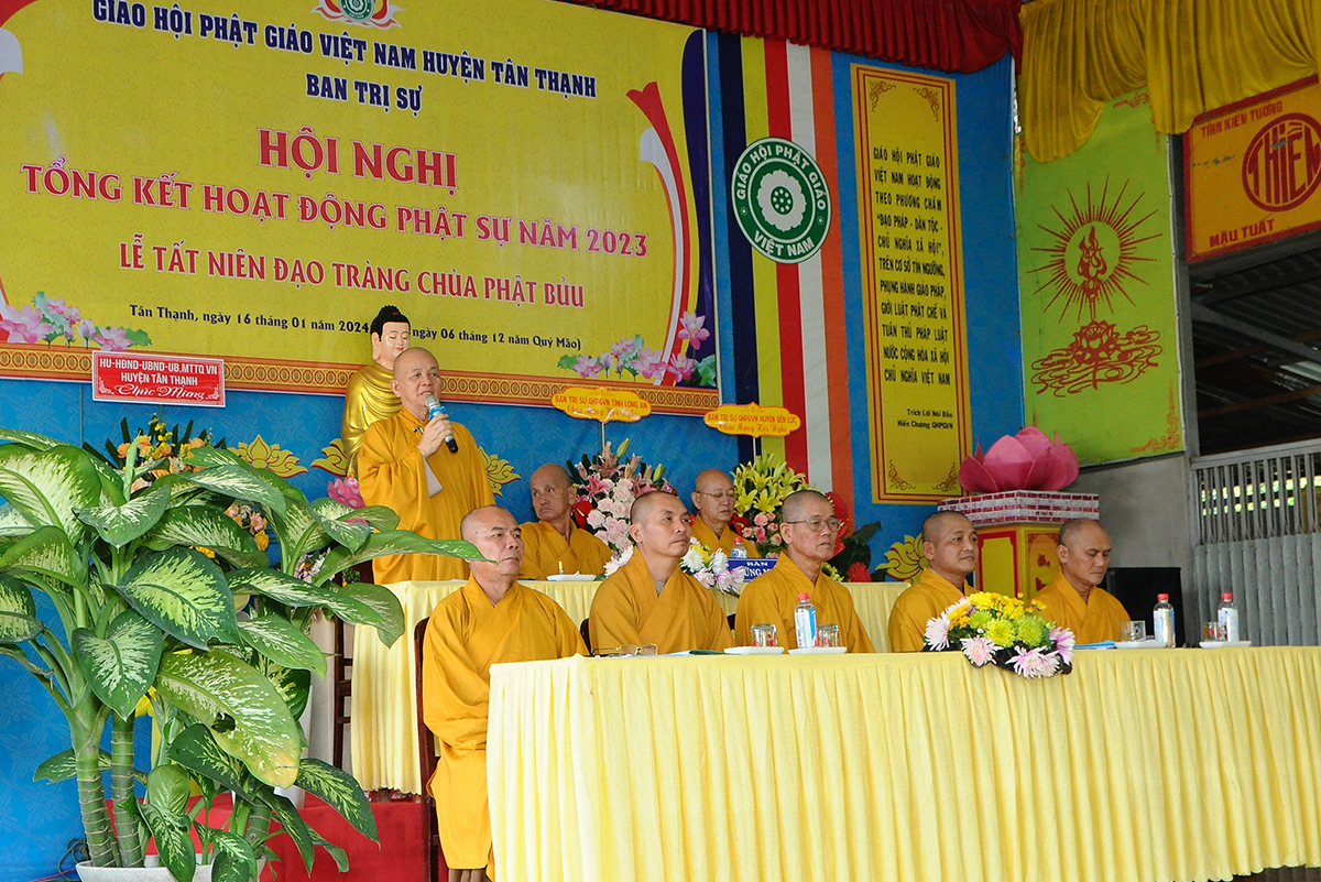 Đại diện Văn phòng, Đại đức Thích Nguyên Lộc – Chánh Thư ký BTS Phật giáo huyện trình bày báo cáo Tổng kết Phật sự năm 2023. Được sự chỉ đạo trực tiếp của chư Tôn đức giáo phẩm Ban Thường trực BTS GHPGVN tỉnh Long An, sự quan tâm giúp đỡ của các cấp Chính quyền, sự nhiệt tình ủng hộ của Tăng Ni, Phật tử, sự hỗ trợ của các mạnh thường quân trong huyện, tỉnh cũng như ngoài tỉnh nên công tác hoạt động Phật sự năm 2023 ổn định, đạt nhiều thành tựu quan trọng nỗi bật là công tác từ thiện xã hội. Theo đó, toàn huyện có 12 ngôi chùa, có 24 vị Tăng Ni. Ban Trị Sự GHPGVN huyện Tân Thạnh cùng chư Tôn đức Tăng Ni và Phật tử các tự viện đã tích cực tham gia vào những công tác từ thiện, an sinh xã hội. Tổng giá trị hoạt động từ thiện, an sinh xã hội đạt gần 20 tỷ đồng.