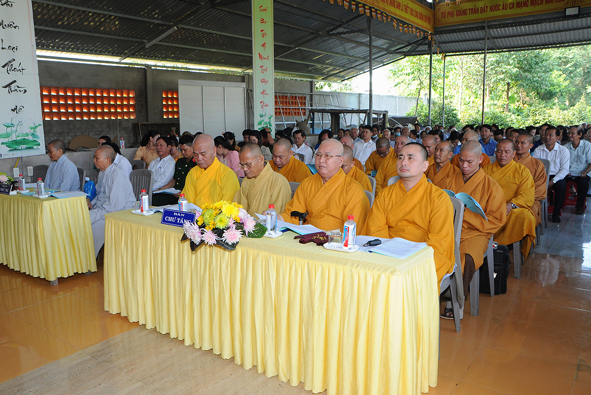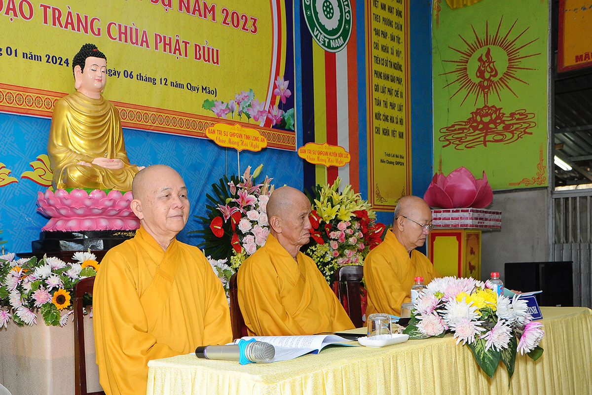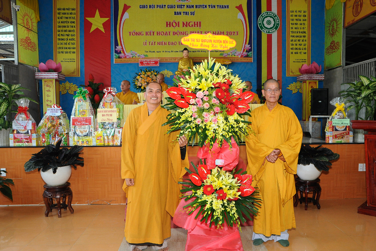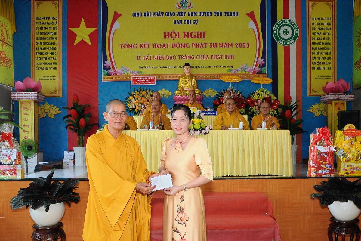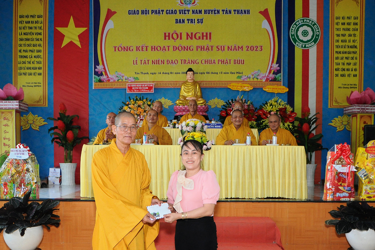 Đại diện Văn phòng, Đại đức Thích Nguyên Lộc – Chánh Thư ký BTS Phật giáo huyện trình bày báo cáo Tổng kết Phật sự năm 2023. Được sự chỉ đạo trực tiếp của chư Tôn đức giáo phẩm Ban Thường trực BTS GHPGVN tỉnh Long An, sự quan tâm giúp đỡ của các cấp Chính quyền, sự nhiệt tình ủng hộ của Tăng Ni, Phật tử, sự hỗ trợ của các mạnh thường quân trong huyện, tỉnh cũng như ngoài tỉnh nên công tác hoạt động Phật sự năm 2023 ổn định, đạt nhiều thành tựu quan trọng nỗi bật là công tác từ thiện xã hội. Theo đó, toàn huyện có 12 ngôi chùa, có 24 vị Tăng Ni. Ban Trị Sự GHPGVN huyện Tân Thạnh cùng chư Tôn đức Tăng Ni và Phật tử các tự viện đã tích cực tham gia vào những công tác từ thiện, an sinh xã hội. Tổng giá trị hoạt động từ thiện, an sinh xã hội đạt gần 20 tỷ đồng.
