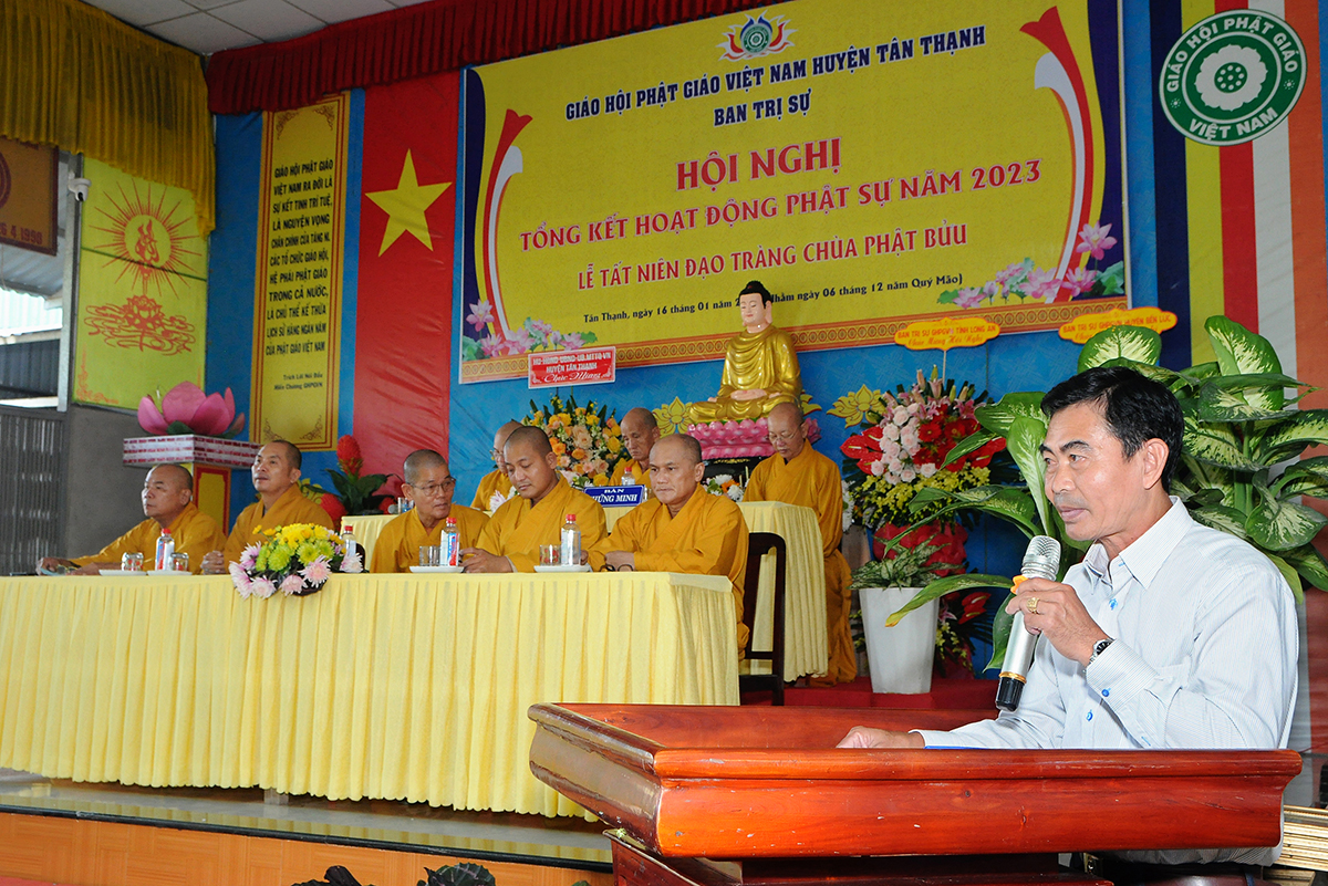 Phát biểu tại hội nghị, ông Võ Minh Dương – Phó Chủ tịch UBMTTQVN huyện Tân Thạnh đánh giá cao về tổ chức sinh hoạt Giáo hội Phật giáo huyện trong năm 2023 và chúc mừng các thành tựu tiêu biểu mà Phật giáo đạt được, đặc biệt là về công tác từ thiện, an sinh xã hội.