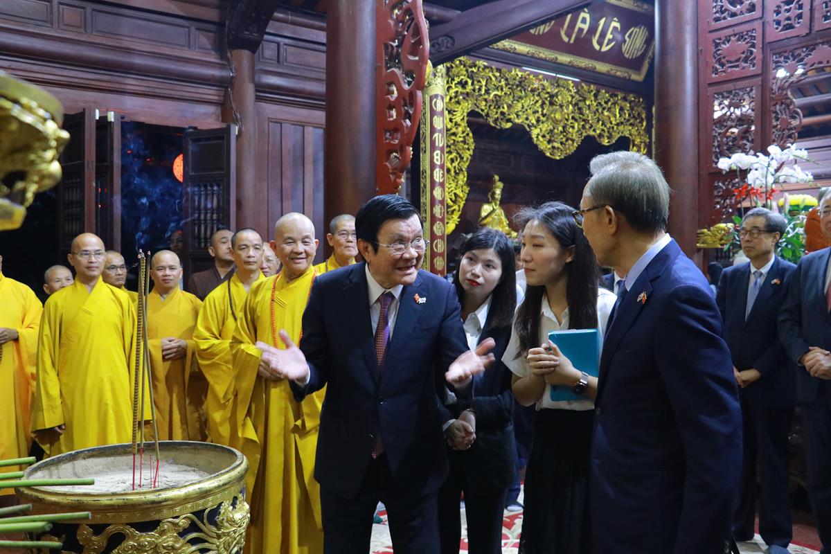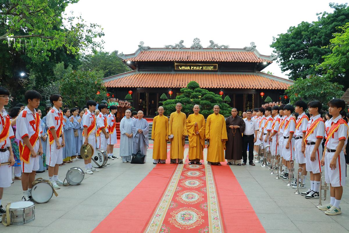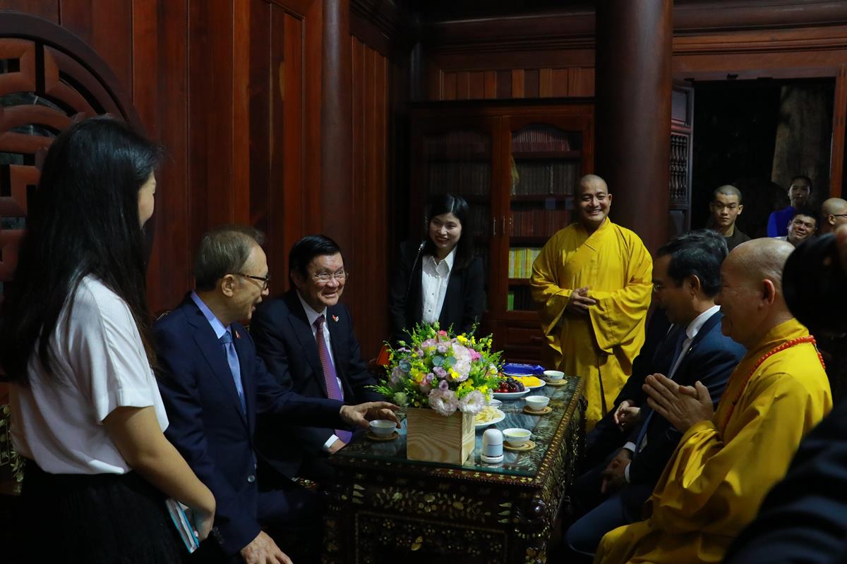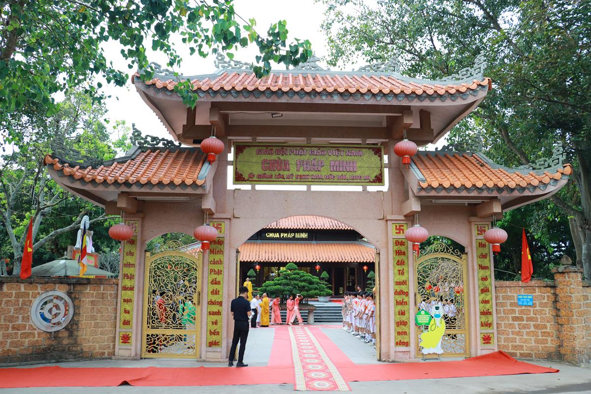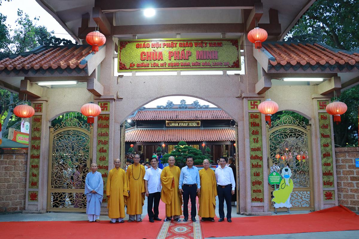 Tại buổi đón tiếp, HT. Thích Minh Thiện đã giới thiệu khái quát về quá trình hình thành và phát triển của chùa Pháp Minh. Chùa Pháp Minh do Hoà thượng Thích Liễu Lạc (1878-1937) thành lập vào năm 1933. Hòa thượng là ông 5 của Ngài Trương Tấn Sang (nội tổ của Ngài Trương Tấn Sang thứ 3). Trong thời kỳ chống thực dân Pháp (1948), chùa là địa điểm bí mật nuôi giấu dân quân kháng chiến. Bọn mật thám của giặc Pháp dò biết, quan huyện Đức Hoà ra lệnh cho Cai Nhung đem lính Mã Tà cướp phá chùa Pháp Minh và chở cột, kèo, mè… về huyện.