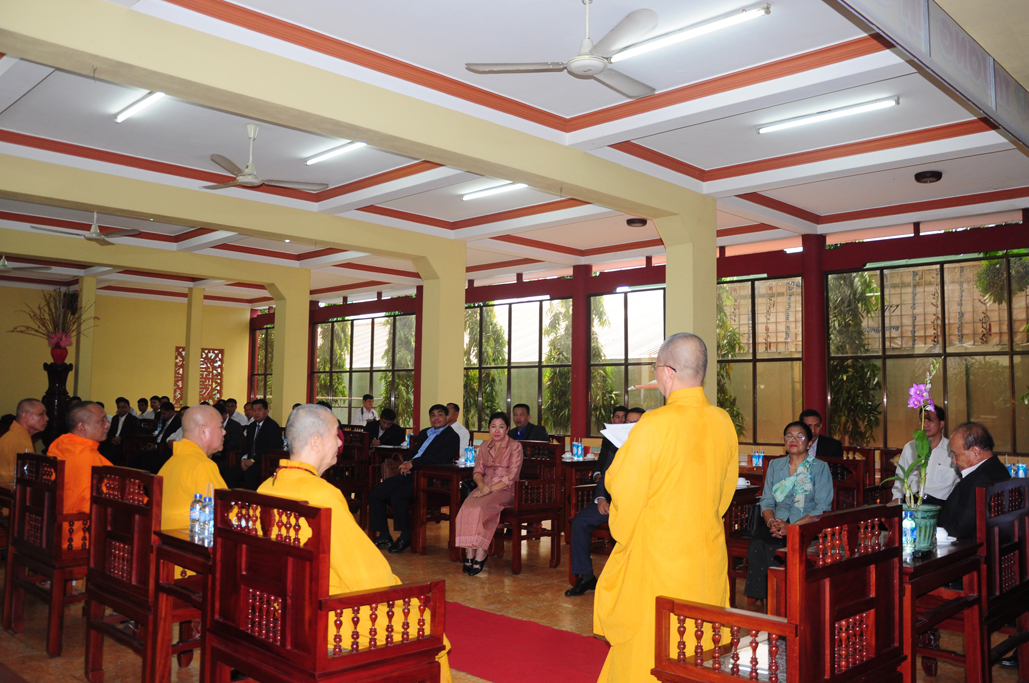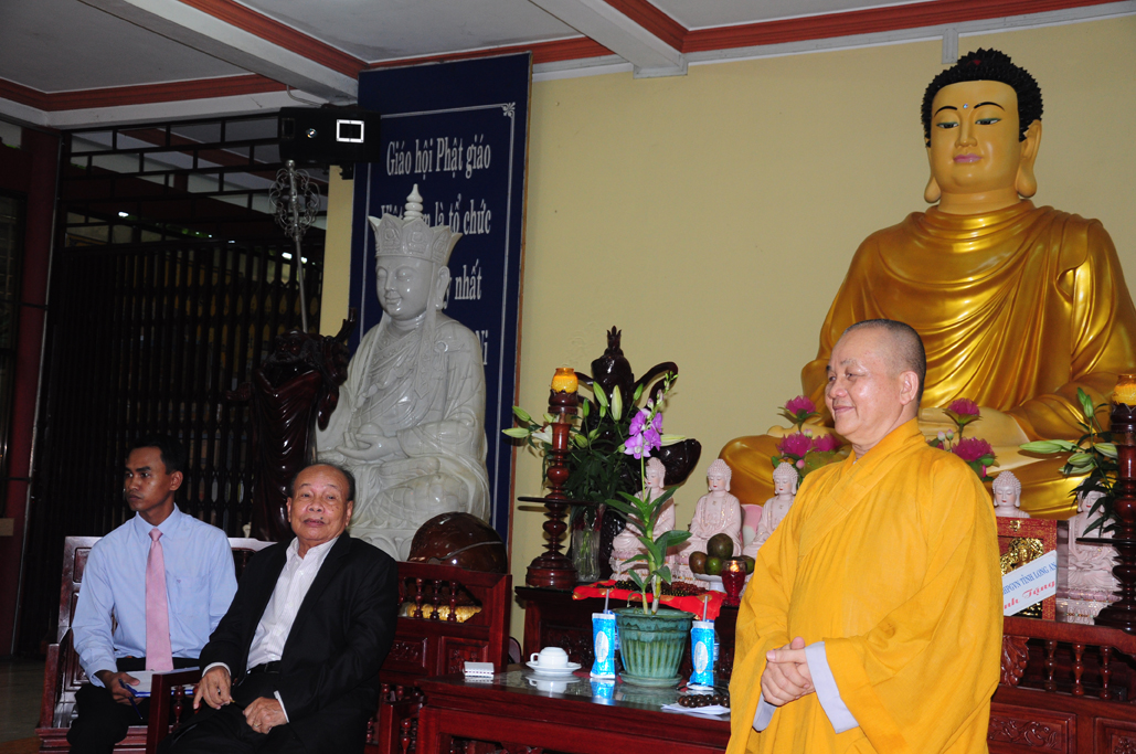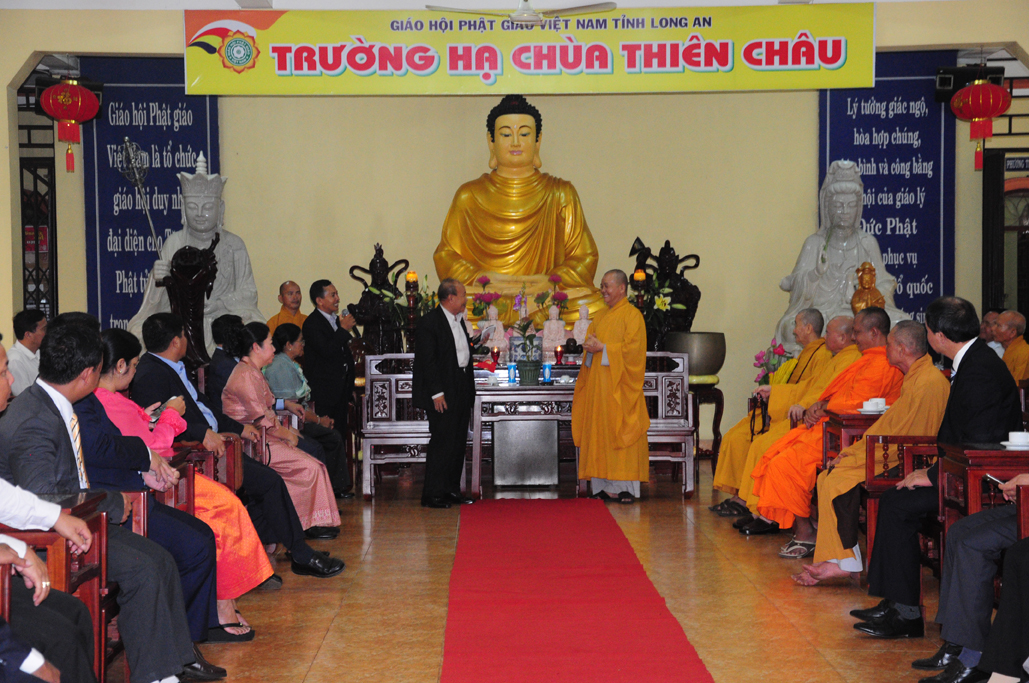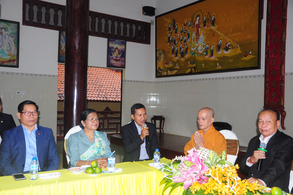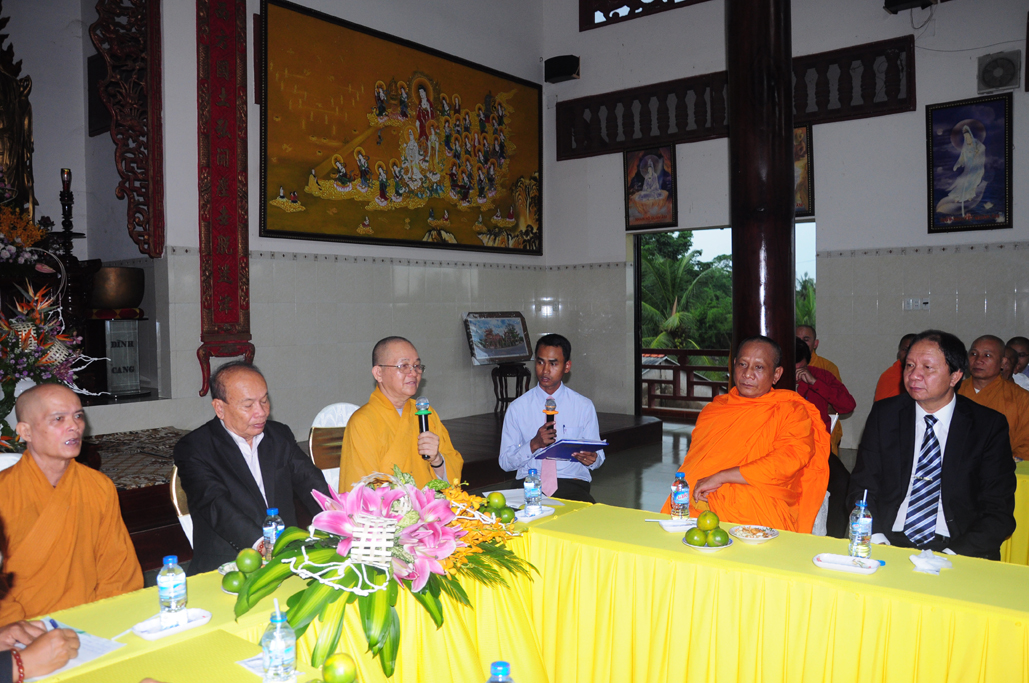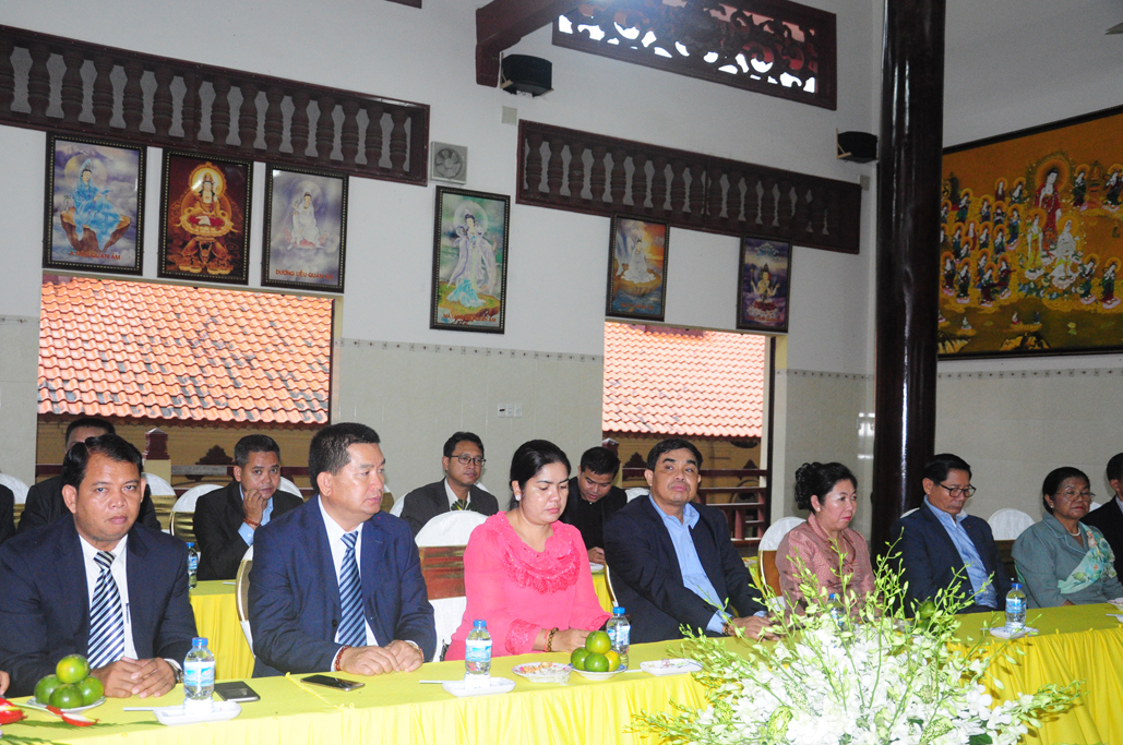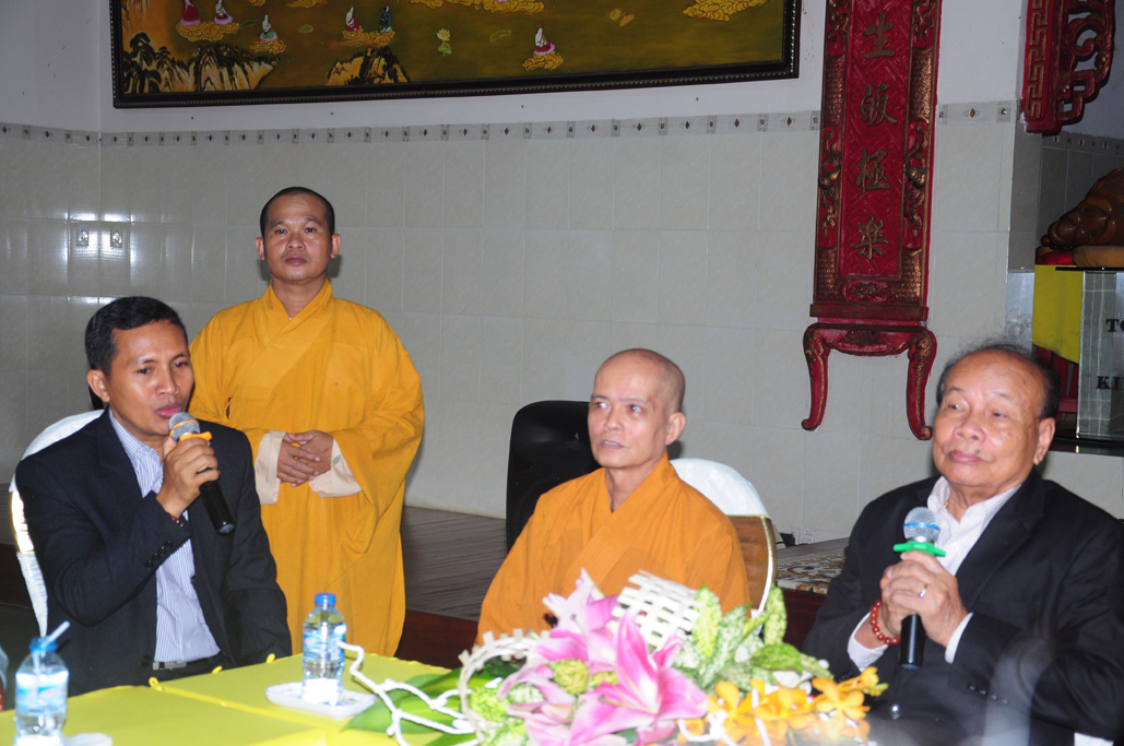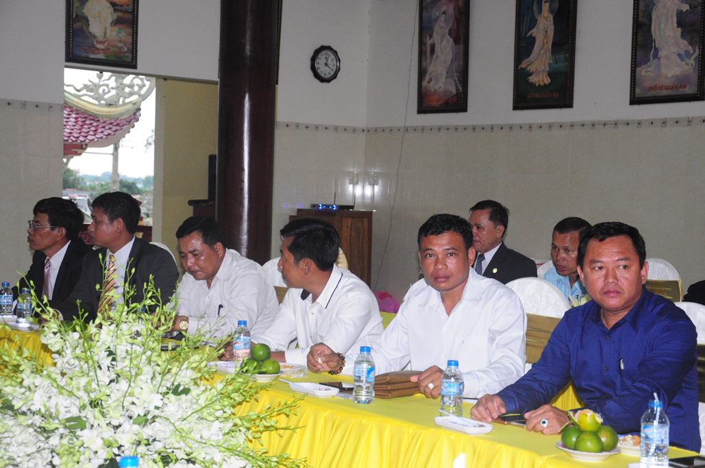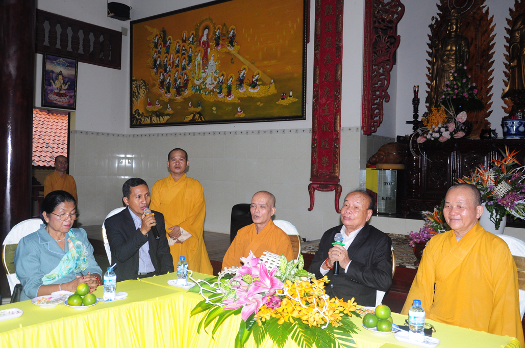 HT Thích Minh Thiện đã phát biểu chào mừng sự viếng thăm của Đoàn. Hoà thượng tán thán về mối quan hệ thân thiết của hai dân tộc từ thời kháng chiến chống thực dân đế quốc đến 2 nước được độc lập như hôm nay. Trong đó, tỉnh Long An là một tỉnh miền Tây nước Việt Nam có biên giới tiếp giáp với nước Campuchia, chịu ảnh hưởng nền văn hóa sông Mekong và tín ngưỡng Phật giáo rất đậm đà theo tinh thần từ bi và trí huệ của Đạo Phật Nam, Bắc truyền. Cho nên, mối bang giao hữu nghị giữa Chính quyền, nhân dân của tỉnh Long An và các tỉnh biên giới nước Campuchia về mặt kinh tế xã hội, từ thiện và tôn giáo…xưa nay rất tốt đẹp.