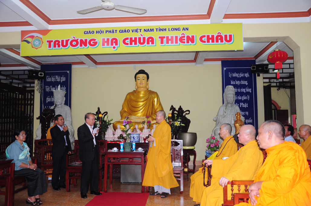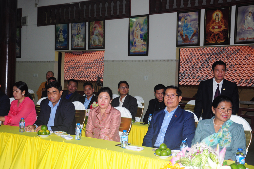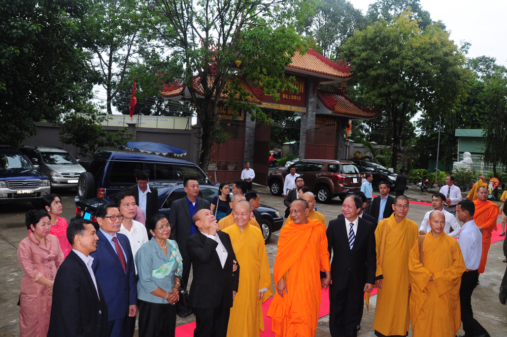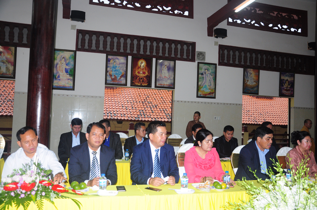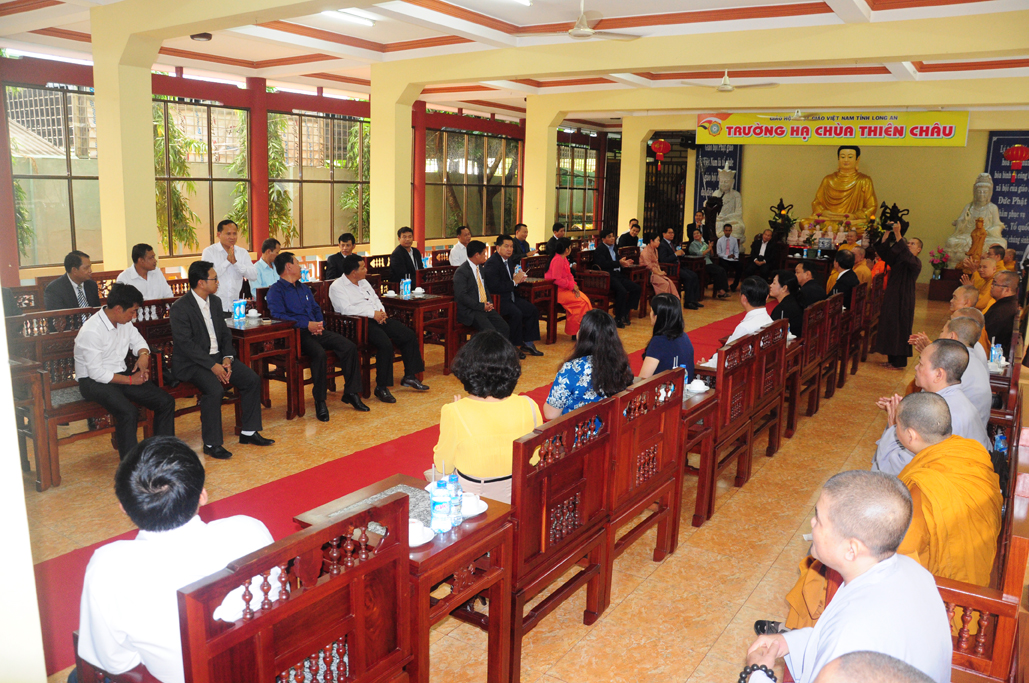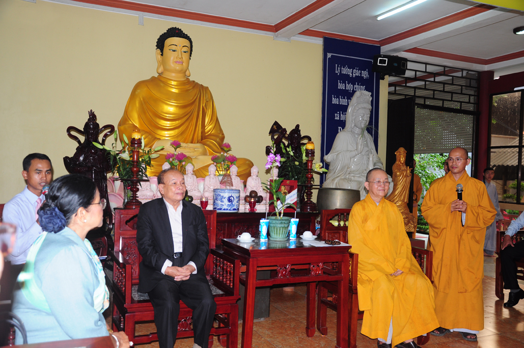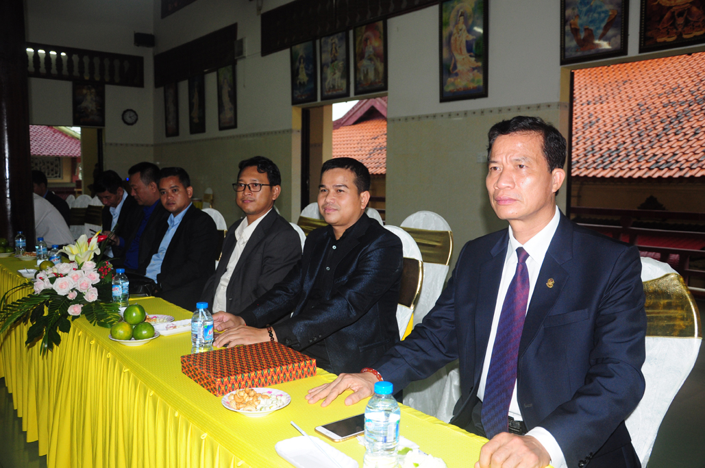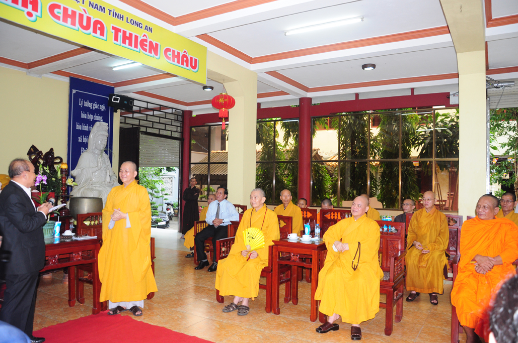 HT Thích Minh Thiện đã phát biểu chào mừng sự viếng thăm của Đoàn. Hoà thượng tán thán về mối quan hệ thân thiết của hai dân tộc từ thời kháng chiến chống thực dân đế quốc đến 2 nước được độc lập như hôm nay. Trong đó, tỉnh Long An là một tỉnh miền Tây nước Việt Nam có biên giới tiếp giáp với nước Campuchia, chịu ảnh hưởng nền văn hóa sông Mekong và tín ngưỡng Phật giáo rất đậm đà theo tinh thần từ bi và trí huệ của Đạo Phật Nam, Bắc truyền. Cho nên, mối bang giao hữu nghị giữa Chính quyền, nhân dân của tỉnh Long An và các tỉnh biên giới nước Campuchia về mặt kinh tế xã hội, từ thiện và tôn giáo…xưa nay rất tốt đẹp.