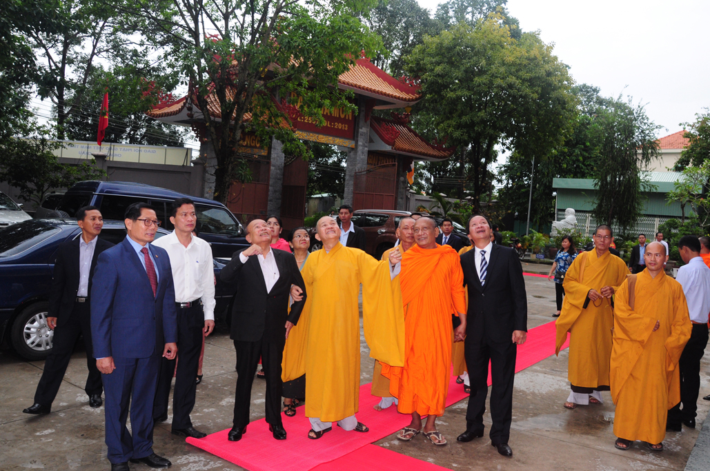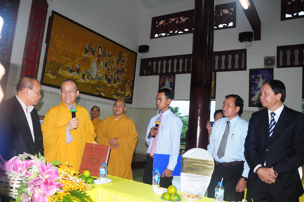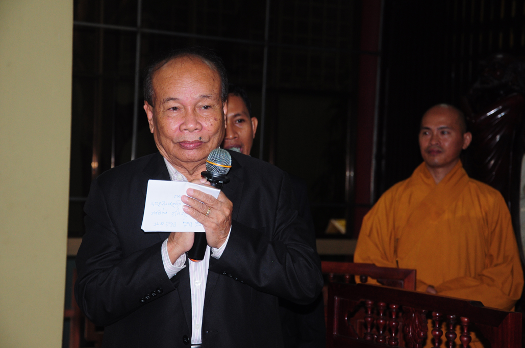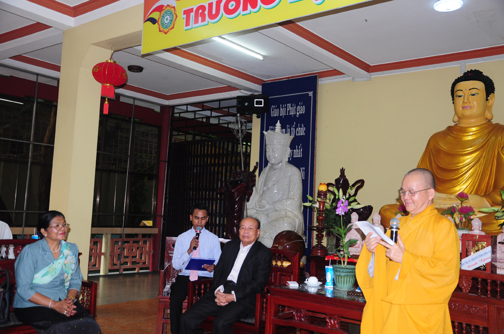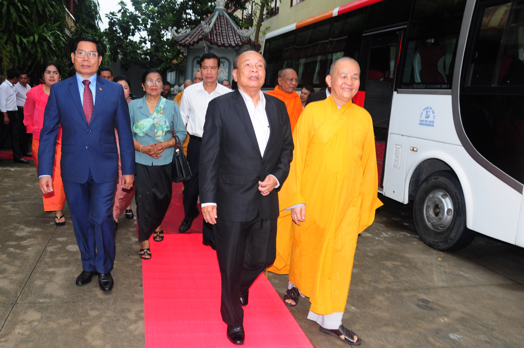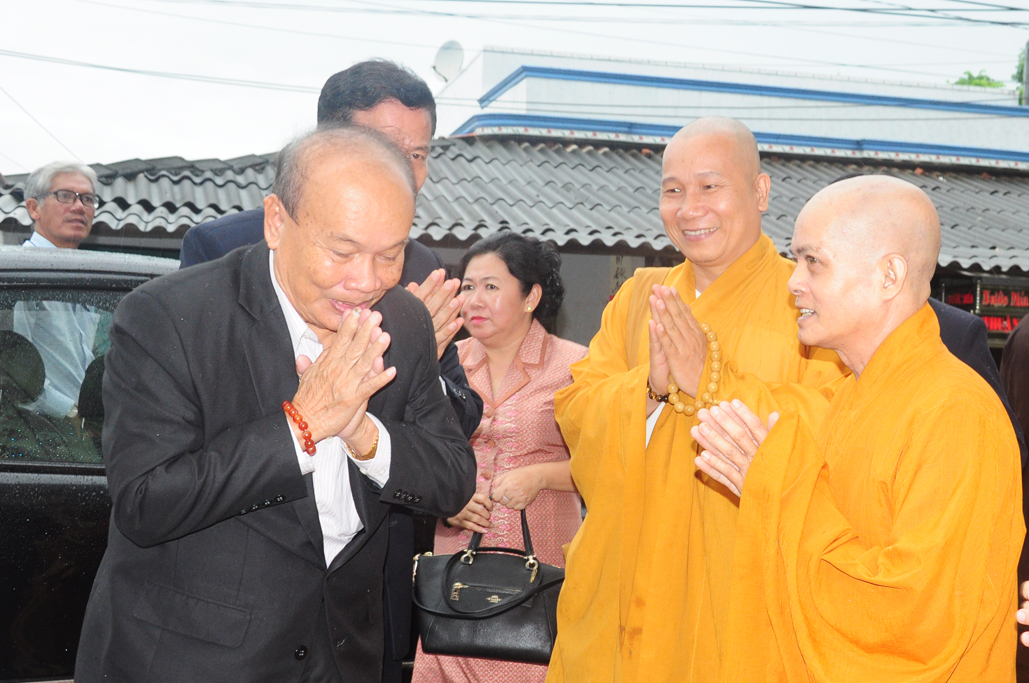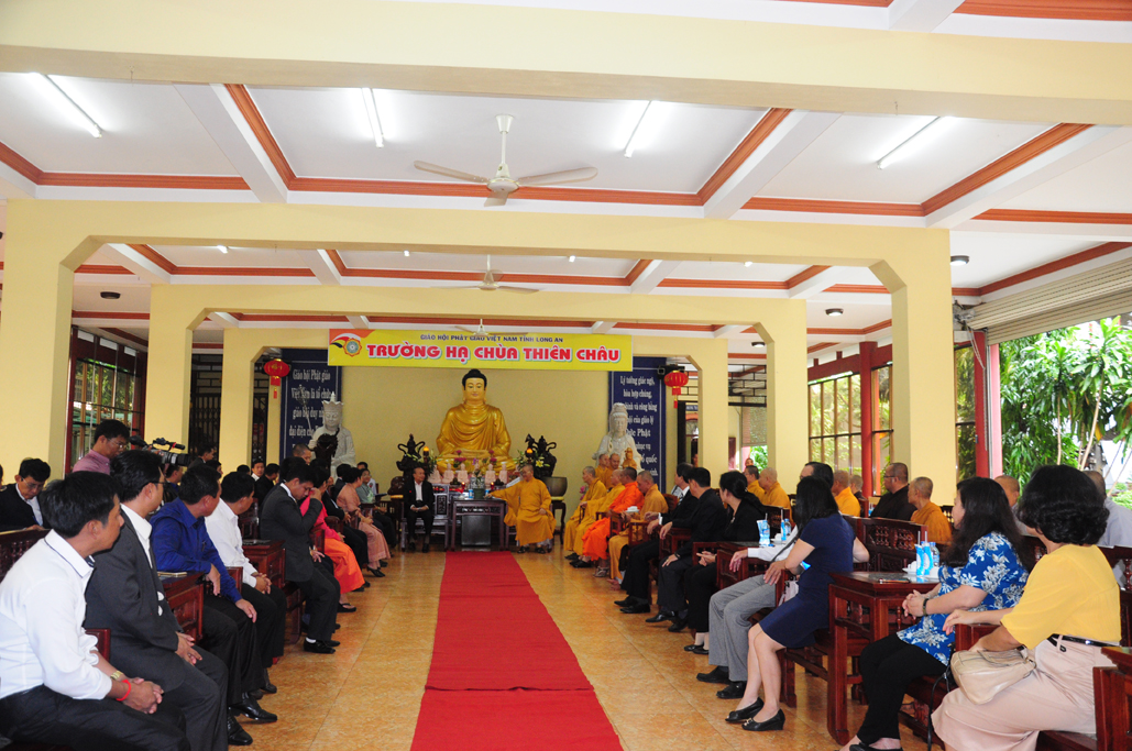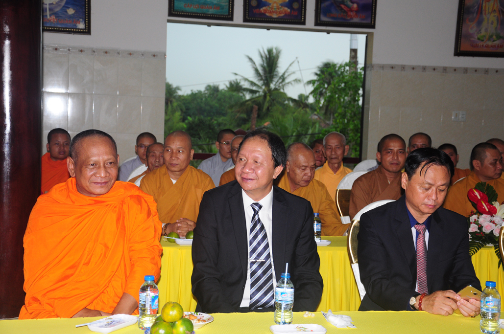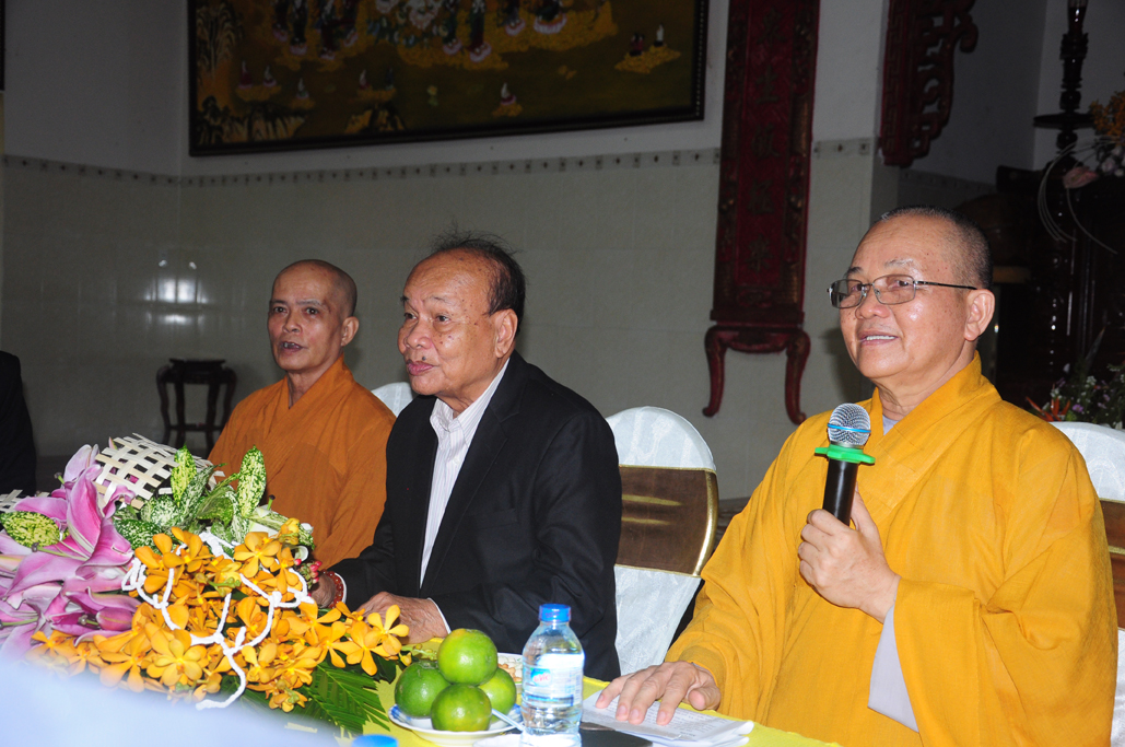 HT Thích Minh Thiện đã phát biểu chào mừng sự viếng thăm của Đoàn. Hoà thượng tán thán về mối quan hệ thân thiết của hai dân tộc từ thời kháng chiến chống thực dân đế quốc đến 2 nước được độc lập như hôm nay. Trong đó, tỉnh Long An là một tỉnh miền Tây nước Việt Nam có biên giới tiếp giáp với nước Campuchia, chịu ảnh hưởng nền văn hóa sông Mekong và tín ngưỡng Phật giáo rất đậm đà theo tinh thần từ bi và trí huệ của Đạo Phật Nam, Bắc truyền. Cho nên, mối bang giao hữu nghị giữa Chính quyền, nhân dân của tỉnh Long An và các tỉnh biên giới nước Campuchia về mặt kinh tế xã hội, từ thiện và tôn giáo…xưa nay rất tốt đẹp.