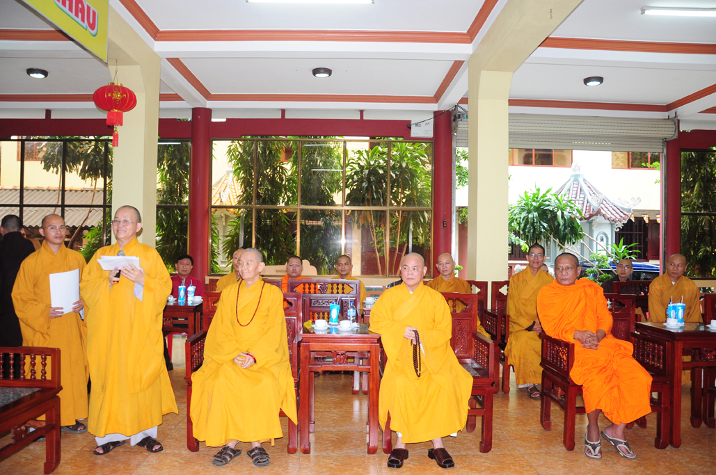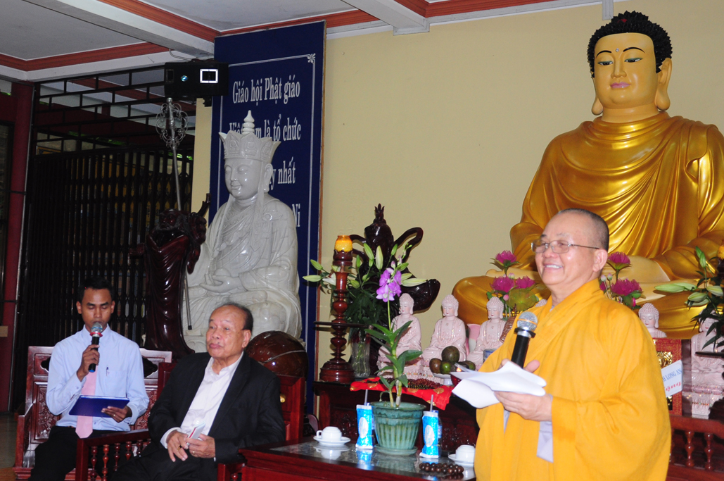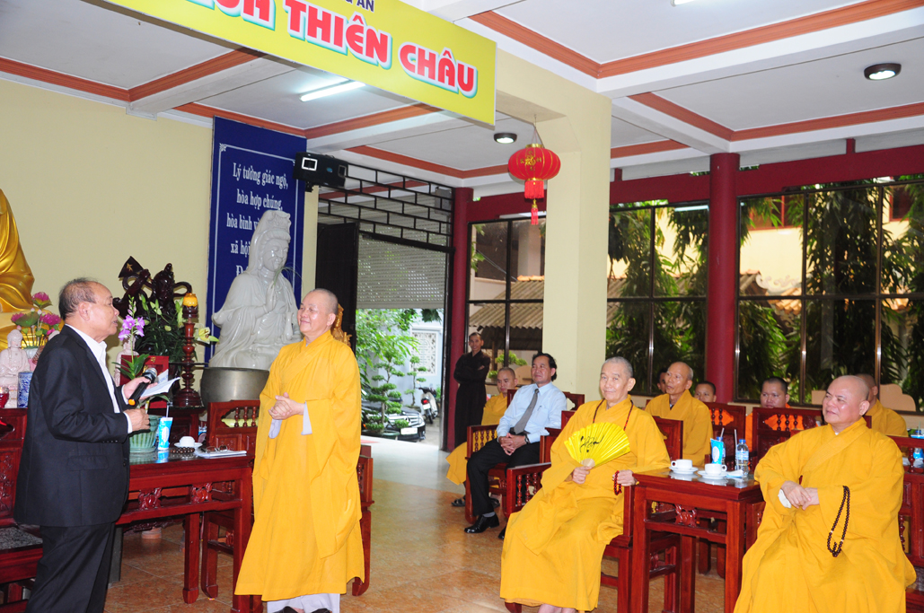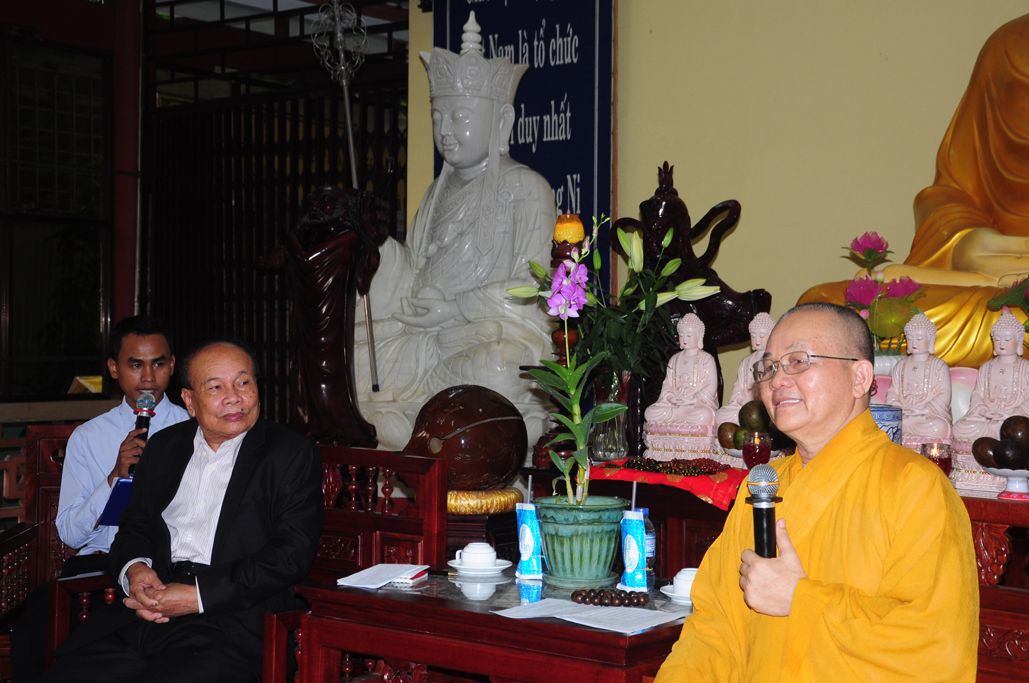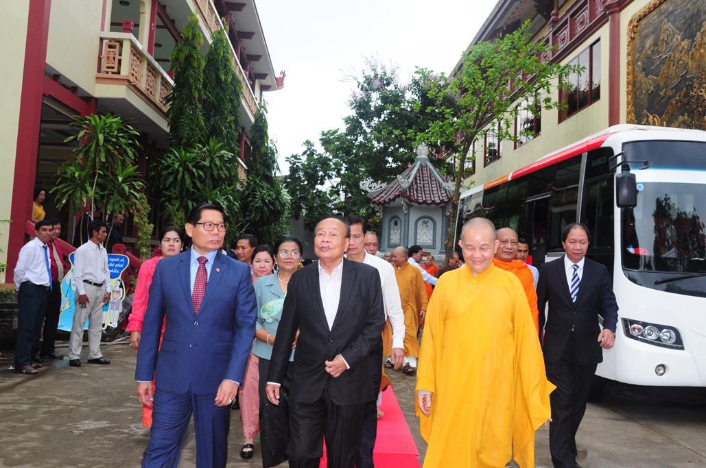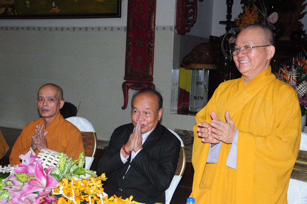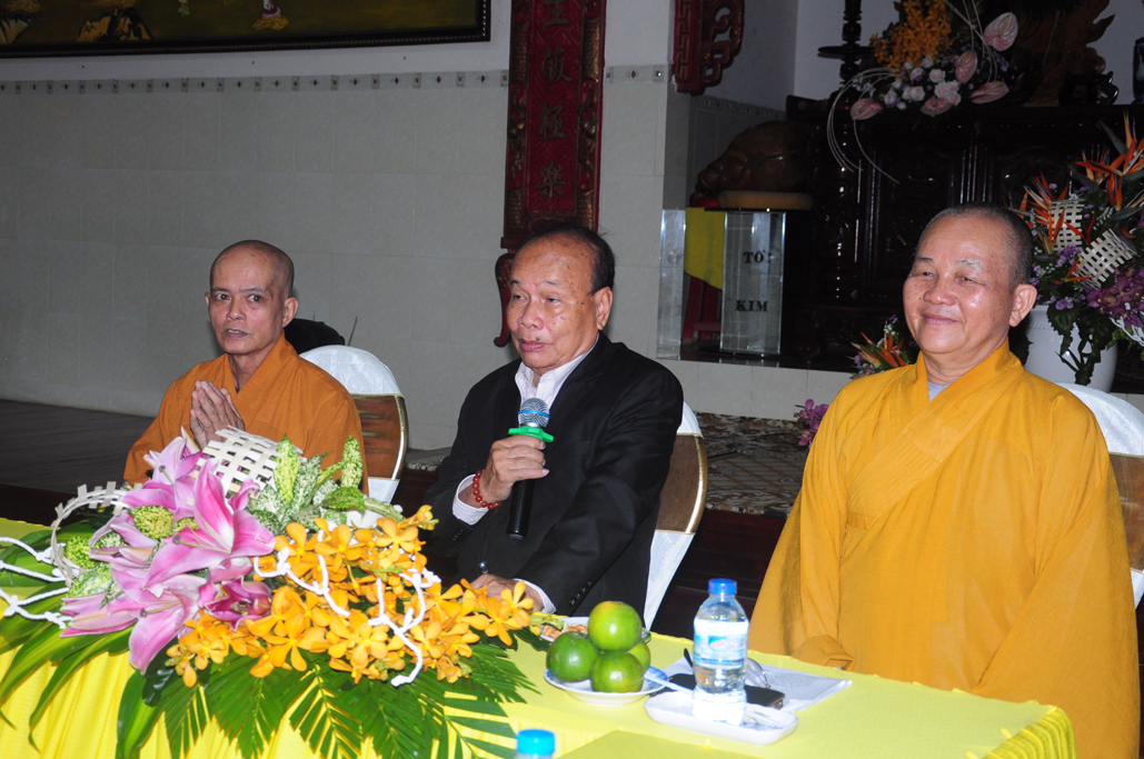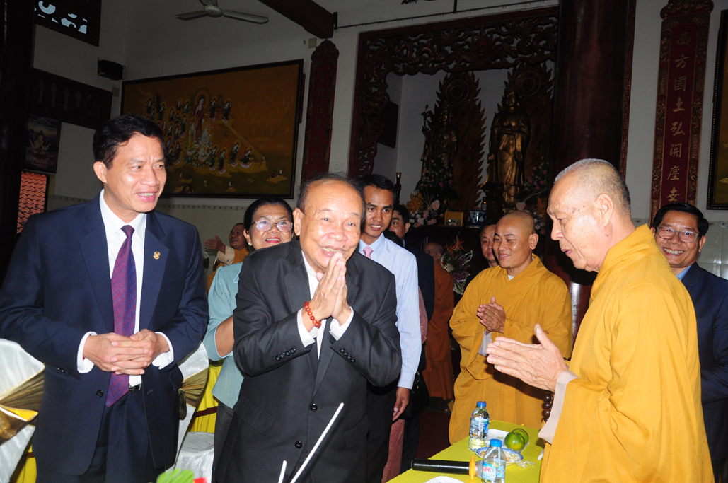 HT Thích Minh Thiện đã phát biểu chào mừng sự viếng thăm của Đoàn. Hoà thượng tán thán về mối quan hệ thân thiết của hai dân tộc từ thời kháng chiến chống thực dân đế quốc đến 2 nước được độc lập như hôm nay. Trong đó, tỉnh Long An là một tỉnh miền Tây nước Việt Nam có biên giới tiếp giáp với nước Campuchia, chịu ảnh hưởng nền văn hóa sông Mekong và tín ngưỡng Phật giáo rất đậm đà theo tinh thần từ bi và trí huệ của Đạo Phật Nam, Bắc truyền. Cho nên, mối bang giao hữu nghị giữa Chính quyền, nhân dân của tỉnh Long An và các tỉnh biên giới nước Campuchia về mặt kinh tế xã hội, từ thiện và tôn giáo…xưa nay rất tốt đẹp.