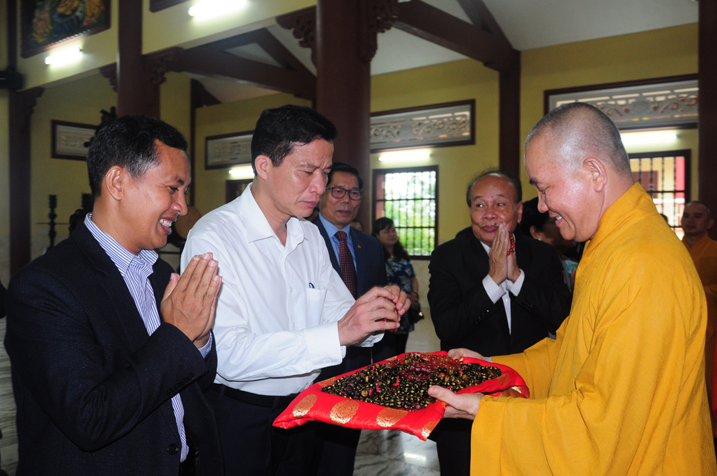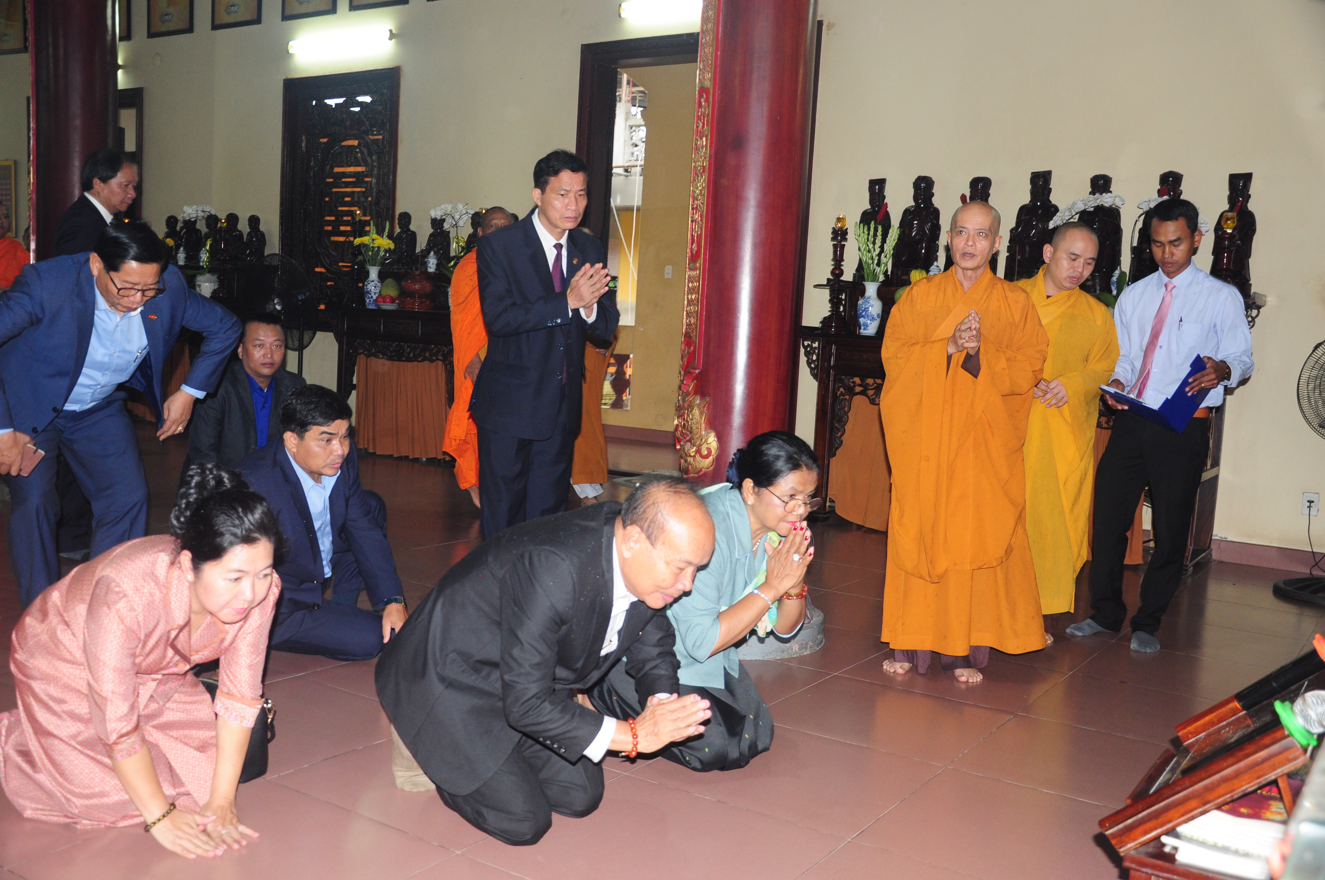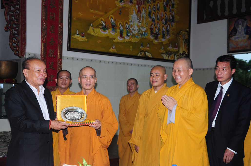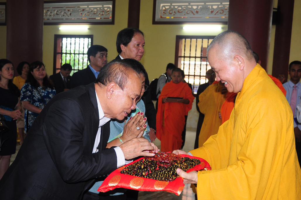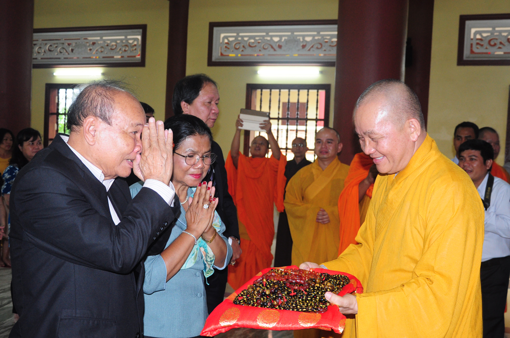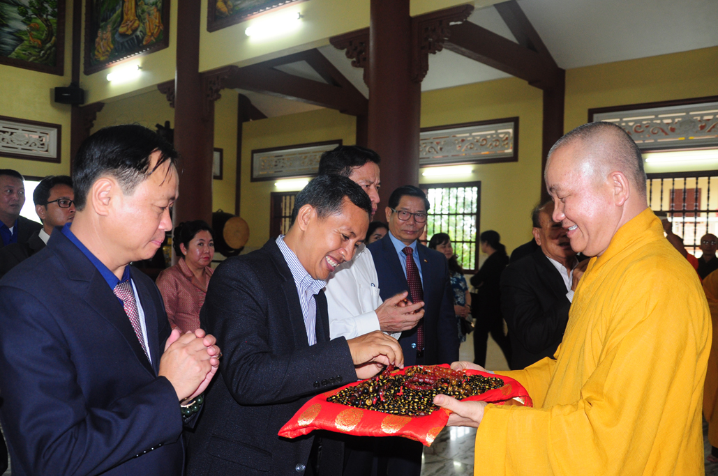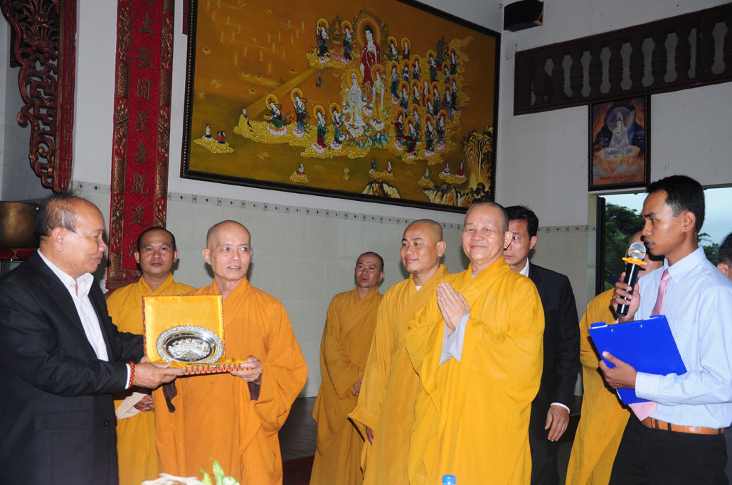 Nhân dịp này, HT Thích Minh Thiện đã trao tặng tôn tượng Bổn sư Thích Ca Mâu Ni Phật và chuỗi hạt đeo tay đến Ngài Bộ trưởng Him Chhem và các thành viên trong đoàn như lời thông điệp hai dân tộc Việt Nam-Campuchia hãy luôn yêu thương hòa bình, hữu nghị theo tinh thần Đức Phật đã dạy. Đáp lại, ngài Bộ trưởng Him Chhem đã trao biểu tượng đền Angkor Wat (một trong những kỳ quan của thế giới) là niềm tự hào và thiêng liêng của đất nước Campuchia đến với Thường trực BTS GHPGVN tỉnh Long An.