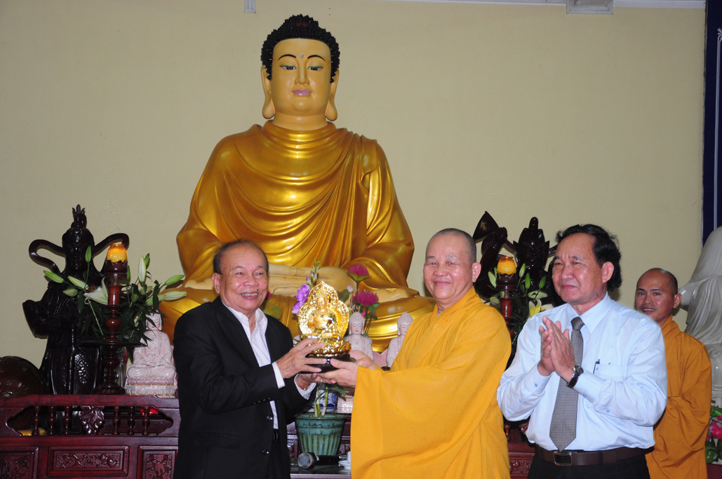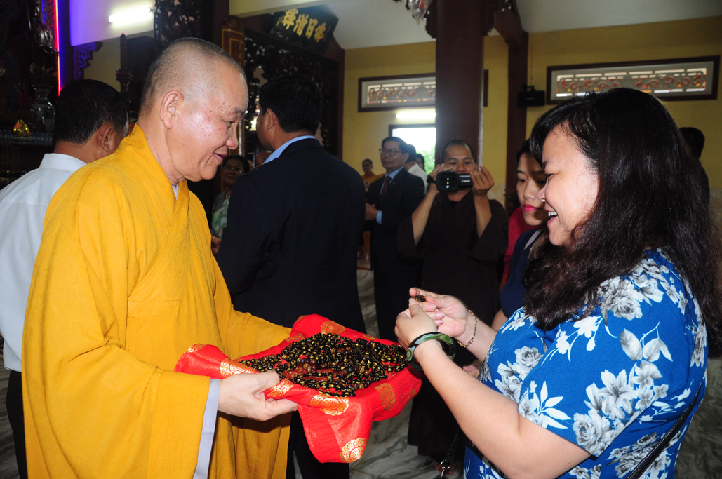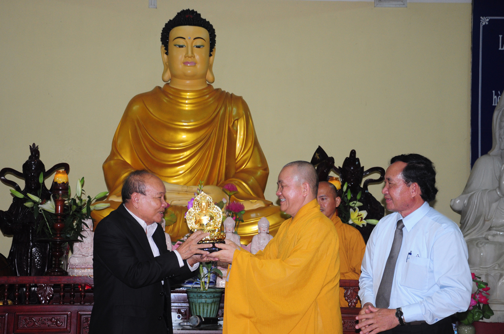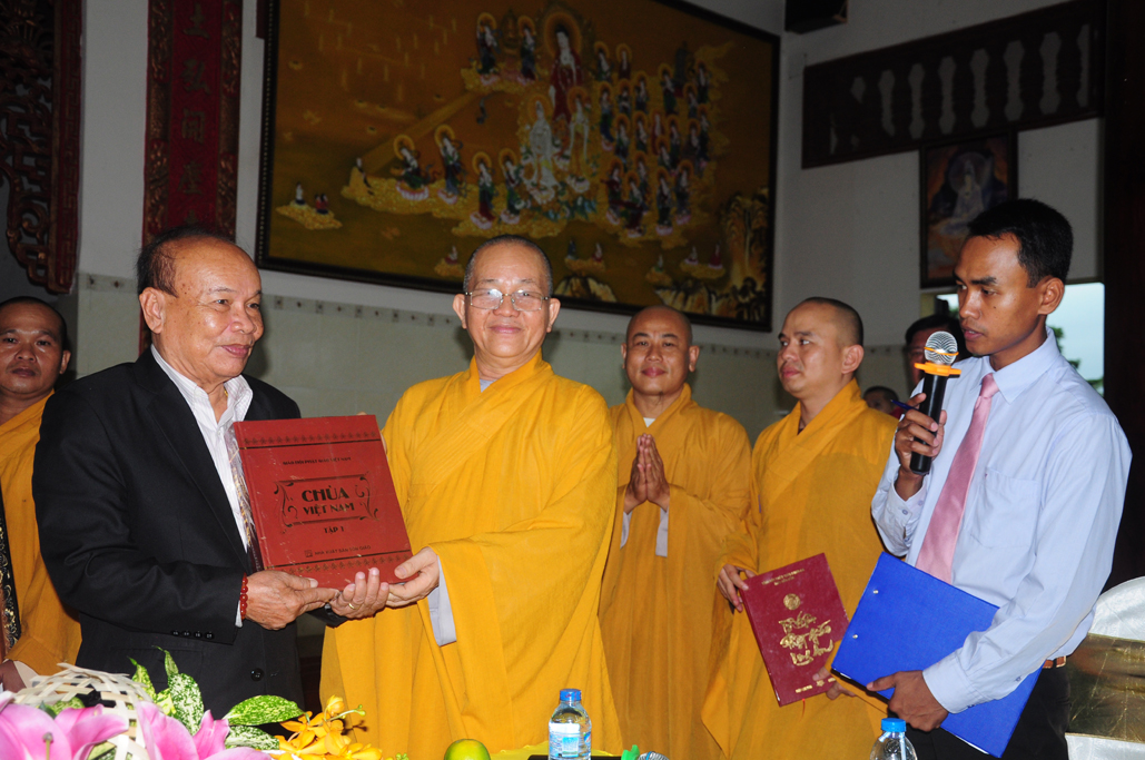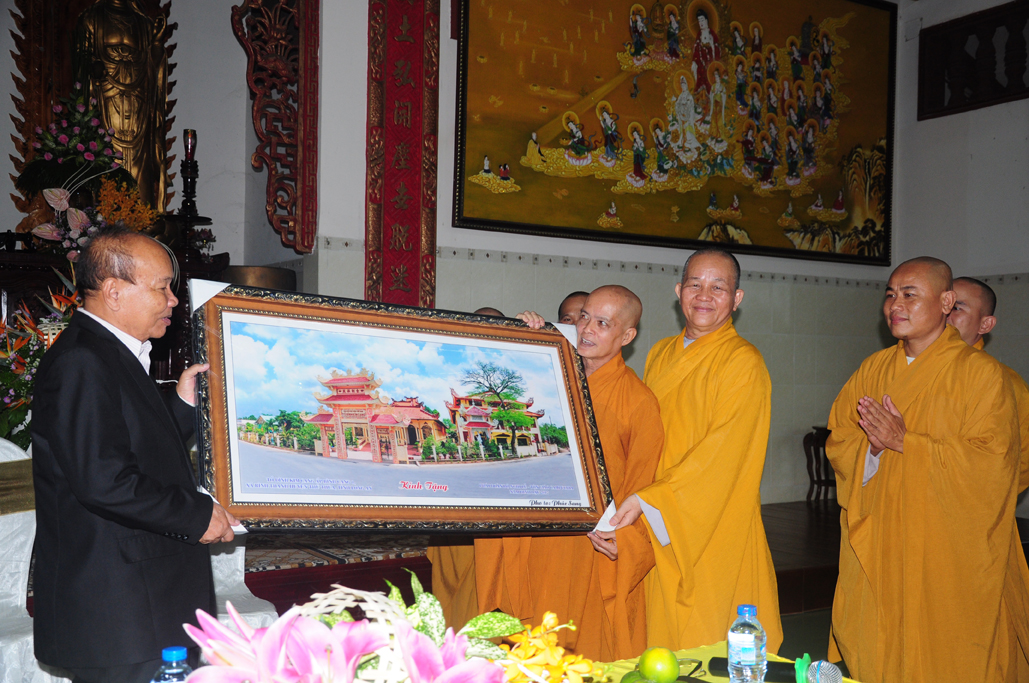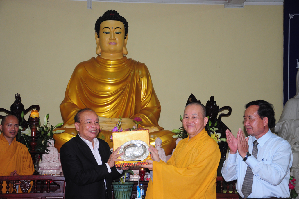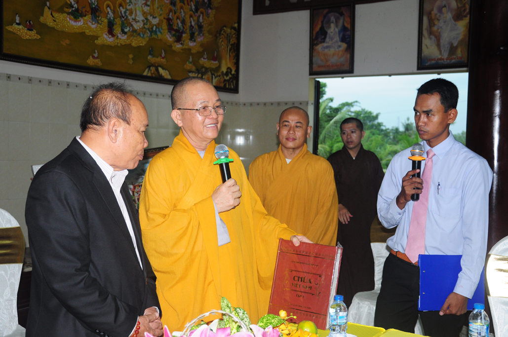 Nhân dịp này, HT Thích Minh Thiện đã trao tặng tôn tượng Bổn sư Thích Ca Mâu Ni Phật và chuỗi hạt đeo tay đến Ngài Bộ trưởng Him Chhem và các thành viên trong đoàn như lời thông điệp hai dân tộc Việt Nam-Campuchia hãy luôn yêu thương hòa bình, hữu nghị theo tinh thần Đức Phật đã dạy. Đáp lại, ngài Bộ trưởng Him Chhem đã trao biểu tượng đền Angkor Wat (một trong những kỳ quan của thế giới) là niềm tự hào và thiêng liêng của đất nước Campuchia đến với Thường trực BTS GHPGVN tỉnh Long An.