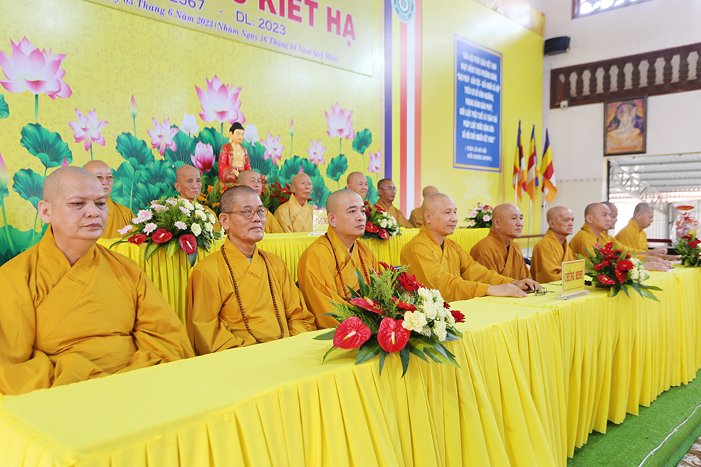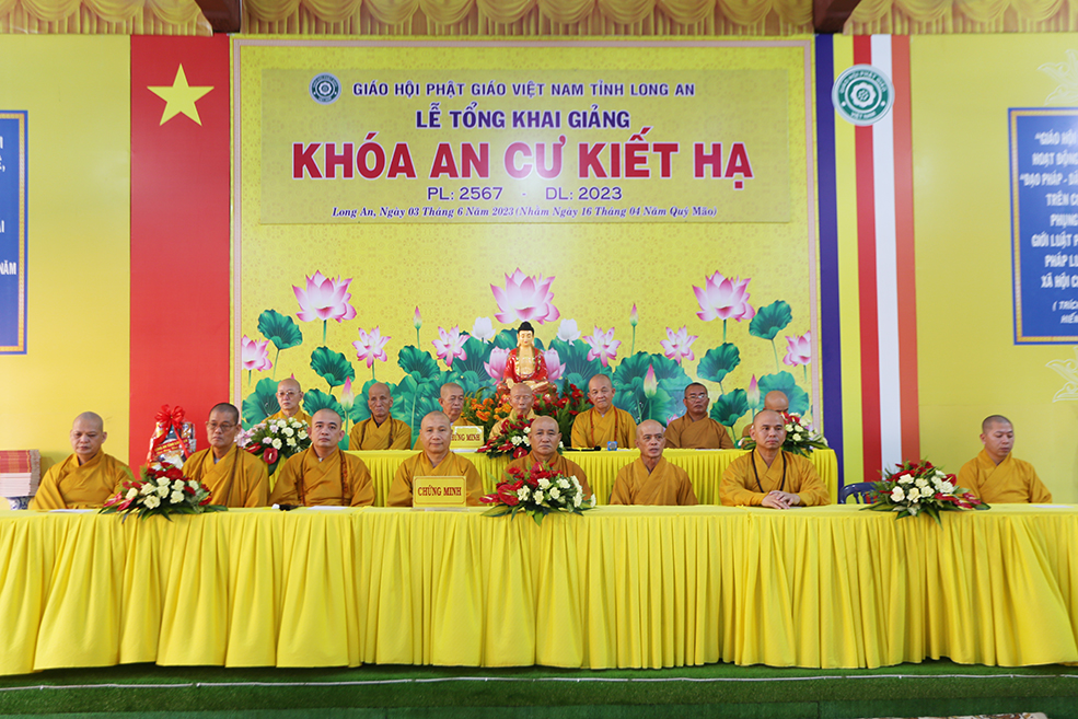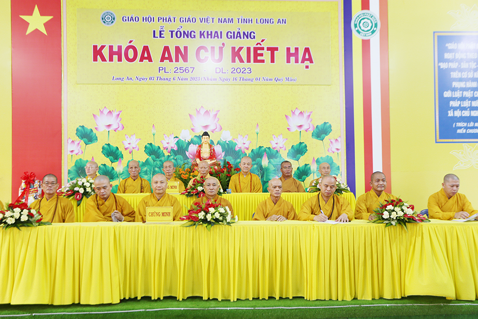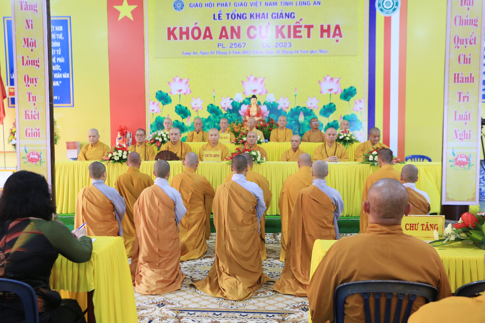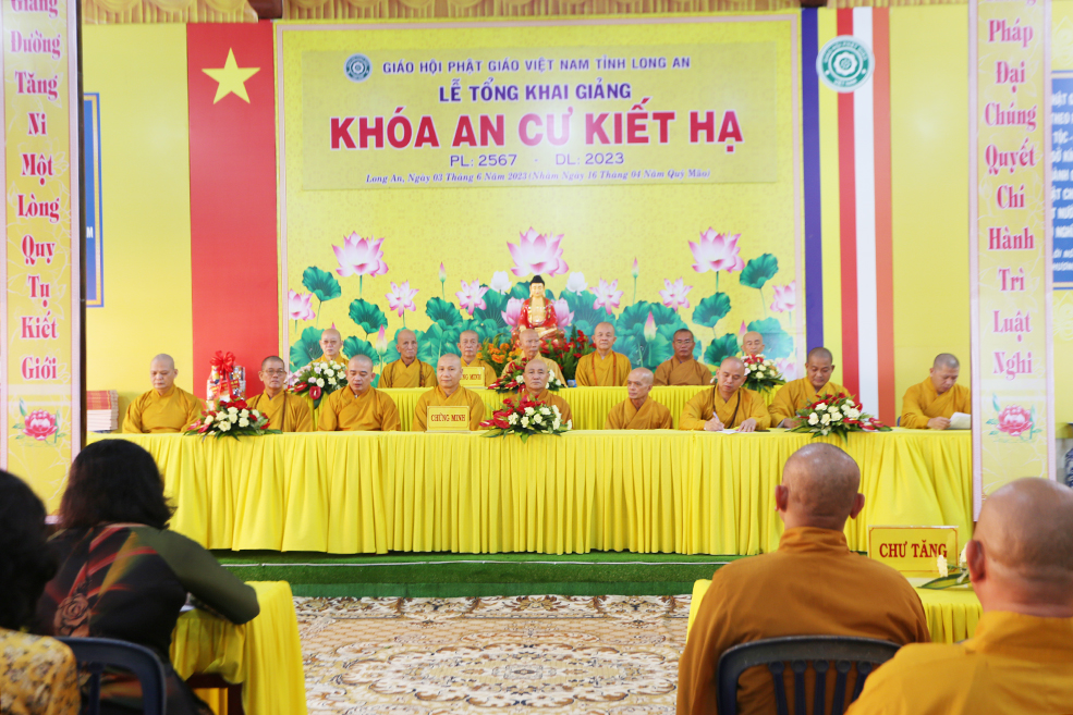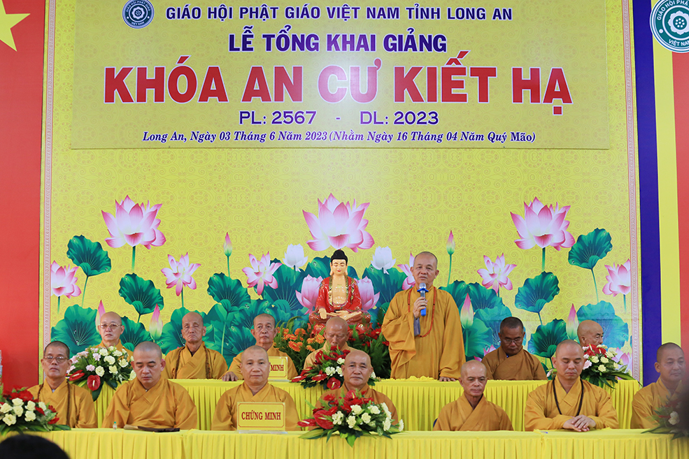 Tại buổi lễ, Đại đức Thích Thiện Danh – Phó Thư ký kiêm Chánh Văn Phòng Ban Trị sự GHPGVN tỉnh Long An báo cáo công tác tổ chức Khoá An cư Kiết hạ Phật lịch 2567. Theo báo cáo, Tất cả các điểm An cư Kết hạ tổ chức thời gian tu học đủ ba tháng, từ ngày 03/7/2023 đến ngày 30/9/2023 (nhằm ngày 16/4/Quý Mão) đến ngày 16/7/Quý Mão). Tổng Khai giảng vào Ngày 03/7/2023 (nhằm ngày 16/4/Quý Mão), Bế giảng ngày 23/8/2023 (nhằm ngày 08/7/Quý Mão) tại Chùa Kim Cang, ấp Bình Cang 1, xã Bình Thạnh, huyện Thủ Thừa, tỉnh Long An. Các trường hạ sẽ học các chuyên đề về Kinh – Luật – Luận, thực hiện Bố tát đầy đủ mỗi tháng 2 lần, Hành chánh Giáo hội, Bồi dưỡng Kiến thức Trụ trì, Luật Tín ngưỡng Tôn giáo …Được biết, mùa An cư kiết hạ năm nay, Phật giáo Long An tổ chức 12 điểm An cư Kết hạ cho gần 1000 vị Tăng Ni trong tỉnh tu học. Điểm nổi bật trong công tác tổ chức năm nay là BTS GHPGVN Tỉnh sẽ tổ chức khóa bồi dưỡng trụ trì vào đầu tháng 5 âm lịch nhằm hướng đến triển khai hiến chương tu chỉnh lần thứ 7.