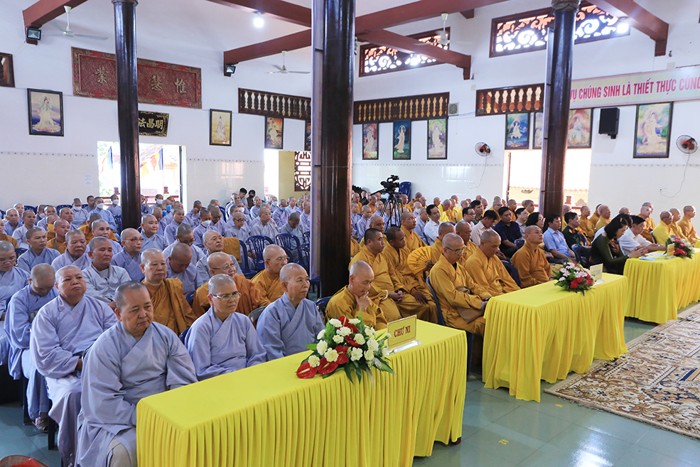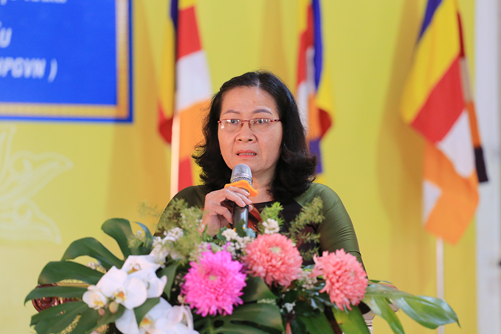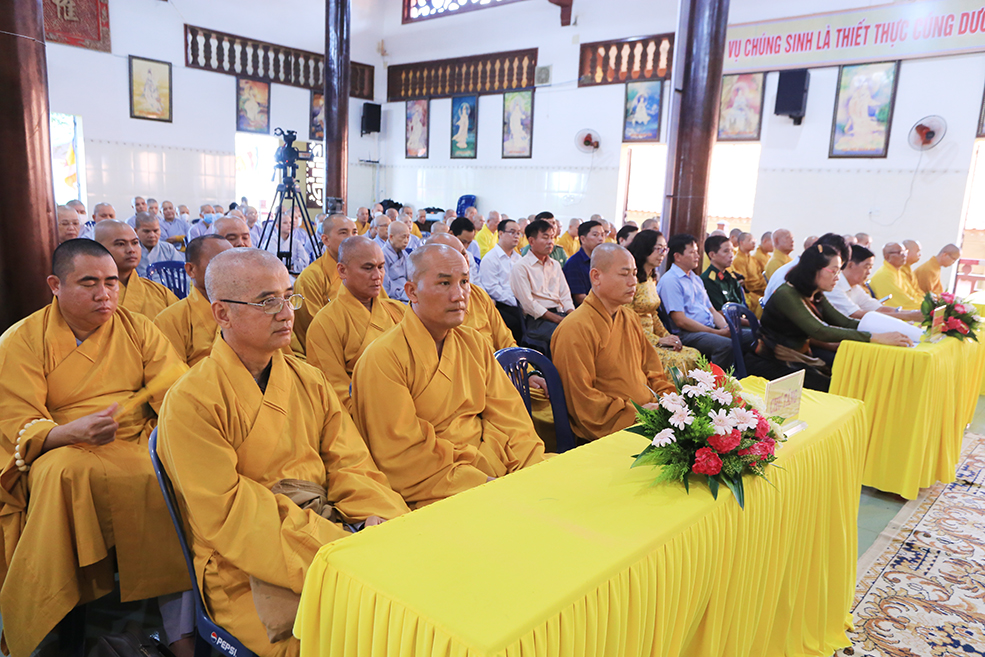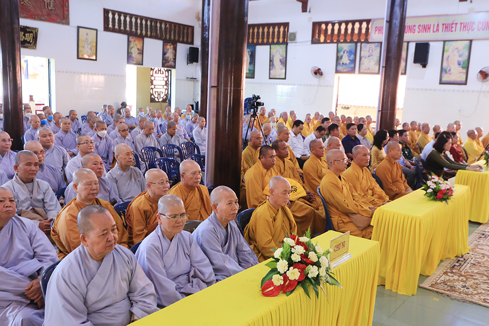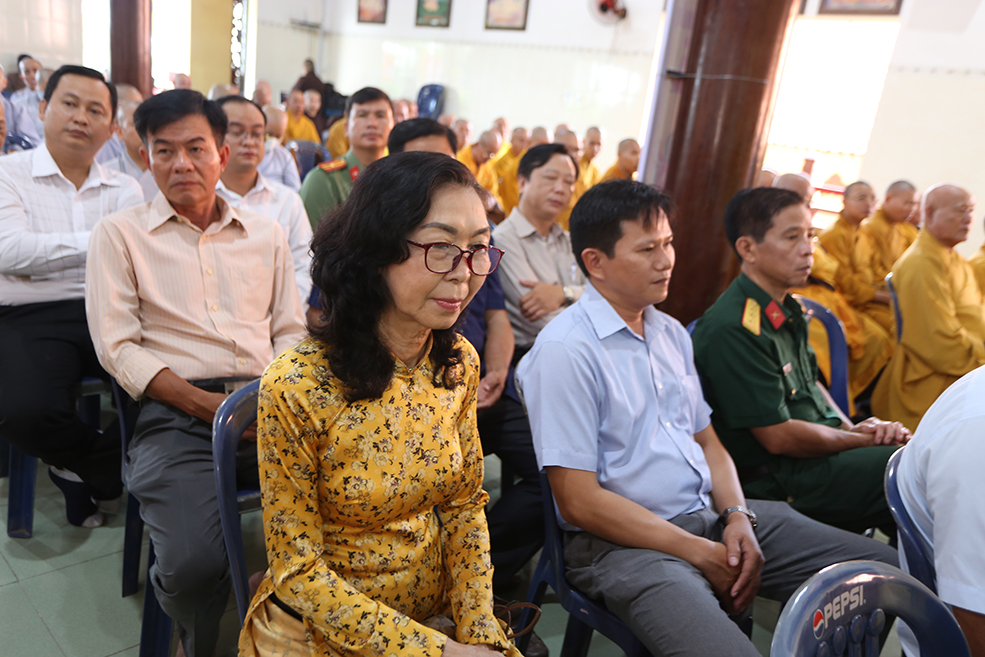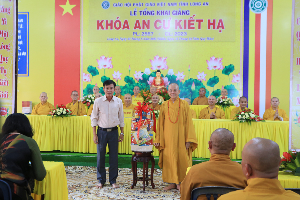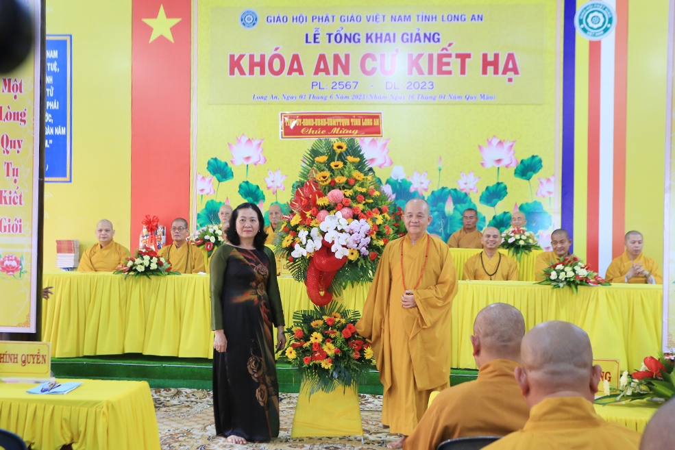 Thay mặt tỉnh ủy, HĐND, UBND, UBMTTQVN tỉnh Long An Bà Phạm Ngọc Tiệp Phó Chủ tịch MTTQVN tỉnh phát biểu, Bà mong rằng sau khóa An cư kiết hạ khi trở về trú xứ, Tăng Ni tích cực đem đạo vào đời tốt và thiết thực hơn nữa. Tăng Ni tiếp tục thực hiện đúng mục đích của Giáo hội Phật giáo VN là Hoằng dương chánh pháp, phát triển Giáo hội trong và ngoài nước, tham gia bảo vệ Tổ quốc, phục vụ Dân tộc, góp phần xây dựng hòa bình an lạc cho chúng sanh. Đồng thời Bà cũng mong Tăng Ni vận động Phật tử tích cực tham gia hưởng ứng phong trào thi đua yêu nước, các hoạt động do Mặt trận và các đoàn thể địa phương phát động.
