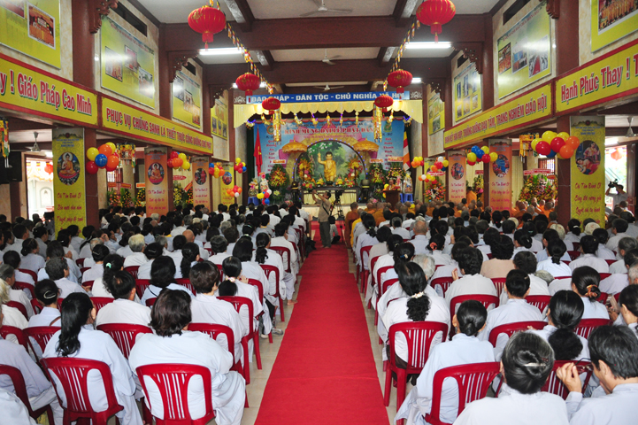 Mở đầu buổi lễ với các nghi thức: niệm Phật cầu gia hộ, chào quốc kỳ, đạo kỳ, một phút nhập từ bi quán tưởng nhớ đến các Thánh tử đạo, Anh hùng chiến sĩ đã hy sinh cho sự nghiệp bảo vệ Tổ quốc. Các nghi thức tiếp diễn hòa trong tiếng trống, kèn oai hùng do các em học sinh Bồ Đề Phương Duy thực hiện; và vô cùng trang trọng với tiết mục dâng hoa cúng dường Phật đản của các em thanh thiếu nữ Phật giáo Long An.