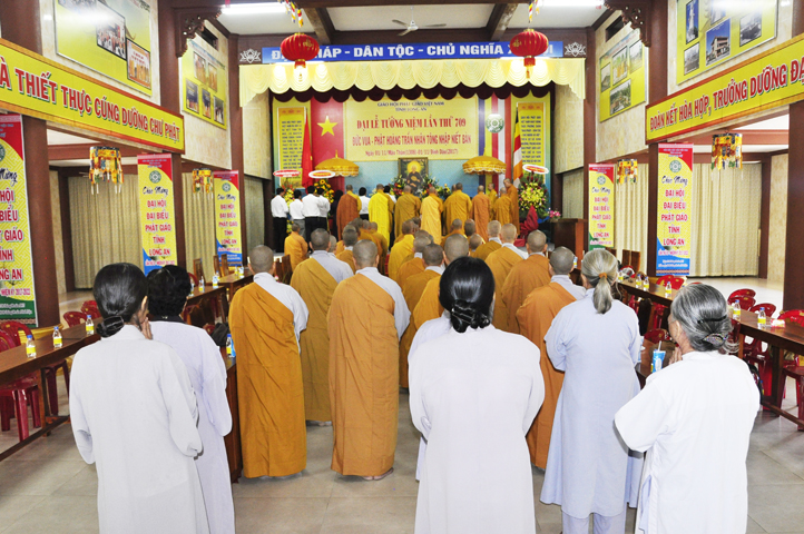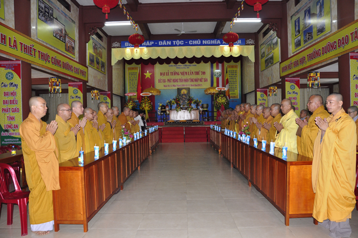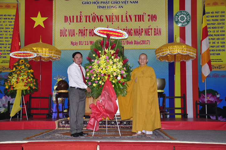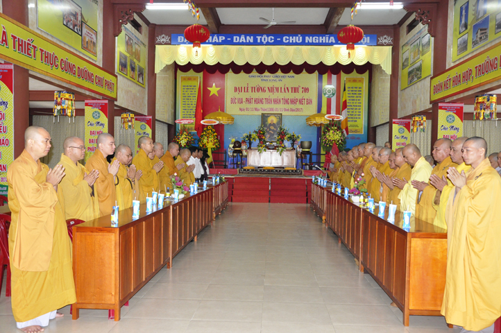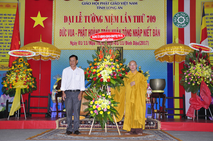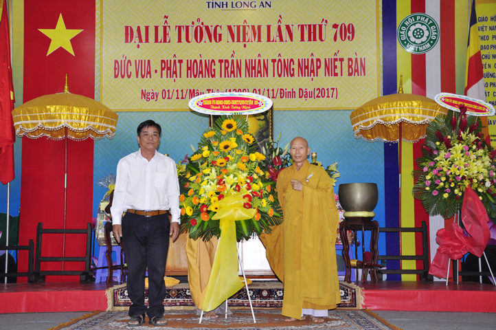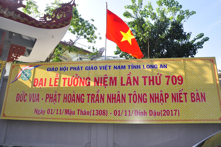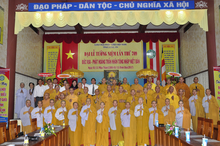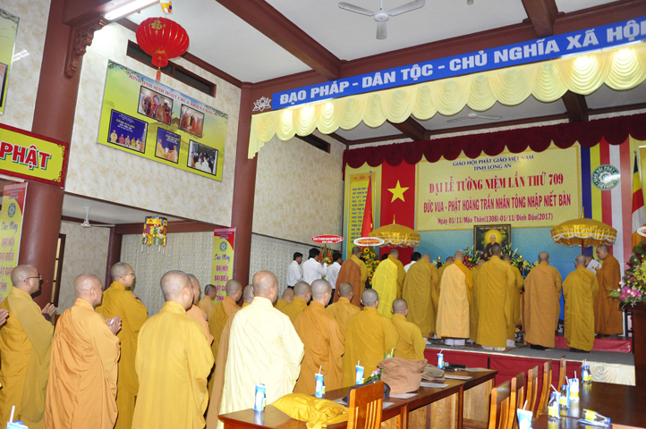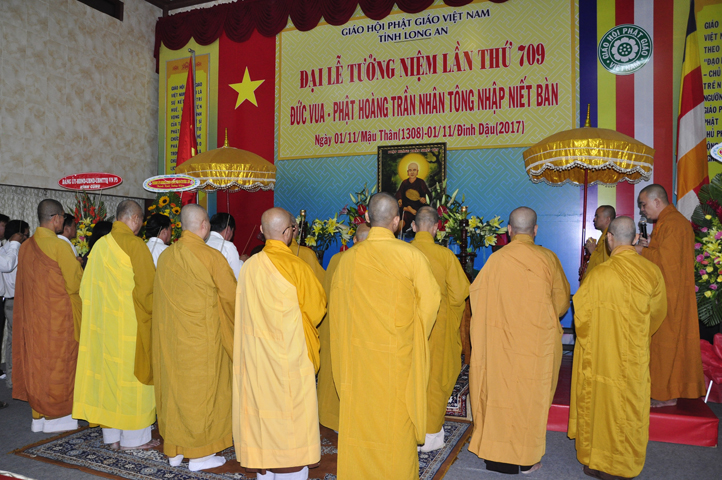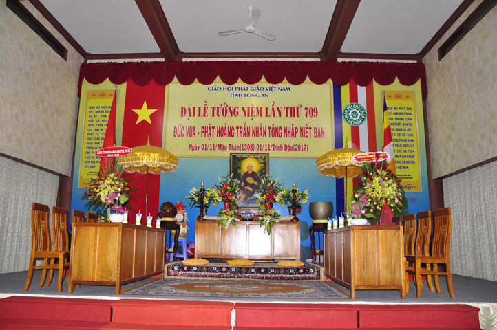 Để tôn vinh những công đức của Đức Vua – Phật Hoàng Trần Nhân Tông đối với Dân tộc và Đạo pháp, thực hiện theo chỉ đạo của Trung ương Giáo hội qua thông bạch số 709/TB-HĐTS về việc hướng dẫn tổ chức Đại Lễ Tưởng Niệm lần thứ 709 Đức vua- Phật Hoàng Trân Nhân Tông nhập Niết bàn. Sáng ngày 18 tháng 12 năm 2017(01/11/Đinh Dậu) Ban trị sự GHPGVN tỉnh Long An long trọng tổ chức Đại lễ Tưởng niệm tại văn phòng Ban trị sự GHPGVN tỉnh Long An, chùa Thiên Châu, số 101, đường Huỳnh Văn Nhứt, Phường 3, TP. Tân An, tỉnh Long An.