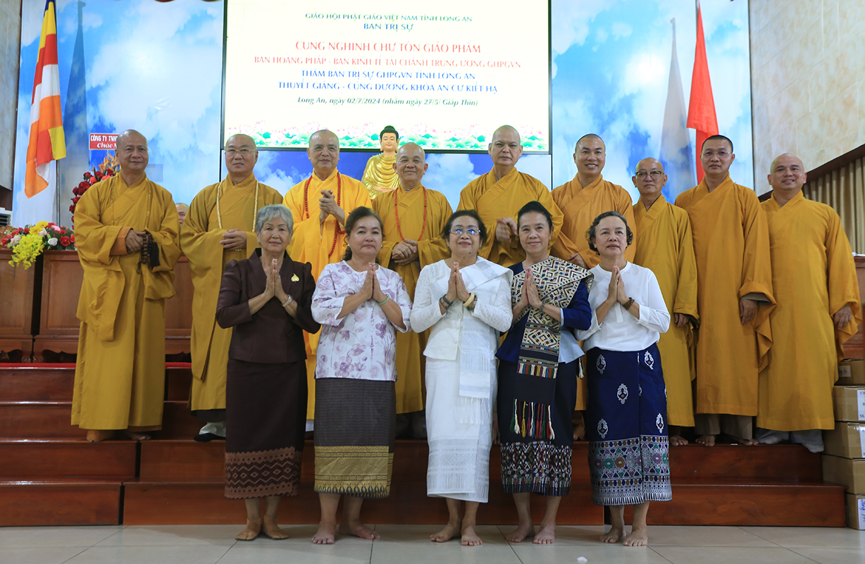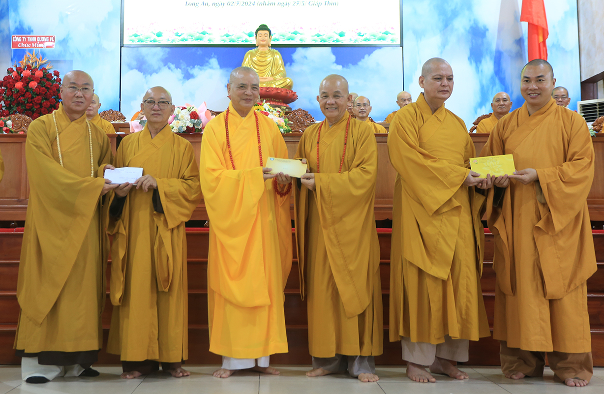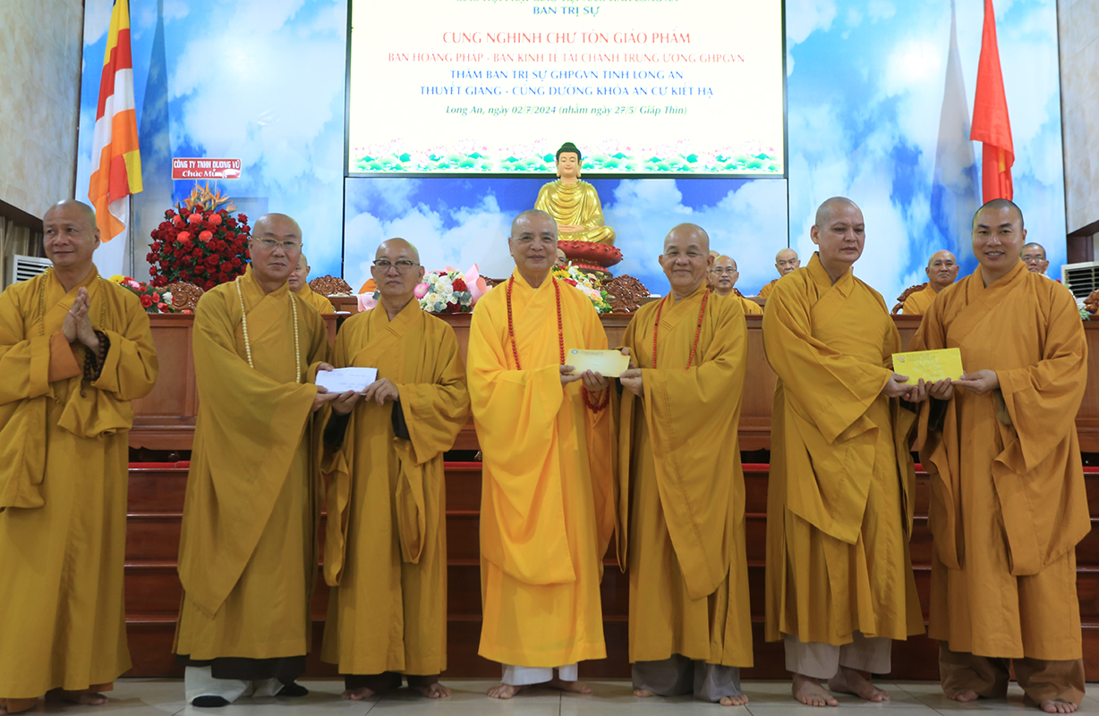Sau lời tác bạch cúng dường của Đại đức Thích Minh Thật, Chánh Thư ký Ban kinh Tế – Tài chính T.Ư, chư tôn đức cũng đã trao cúng dường 50 triệu đồng của Ban Kinh tế – Tài chính T.Ư, 50 triệu đồng của chùa Long Hương, 20 triệu đồng Hội từ thiện Tường Nguyên và 10 triệu đồng của Ban Hoằng pháp T.Ư, cùng vật phẩm cúng dường các trường hạ tại Long An.