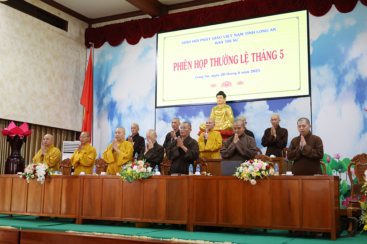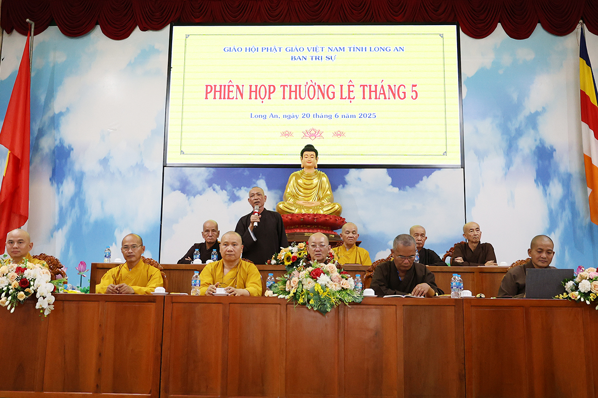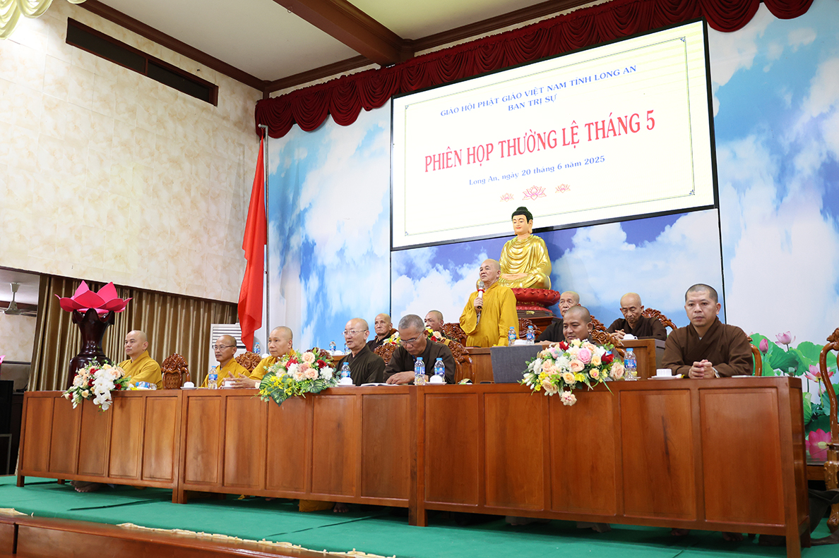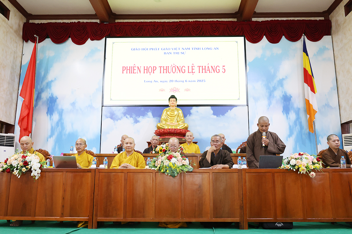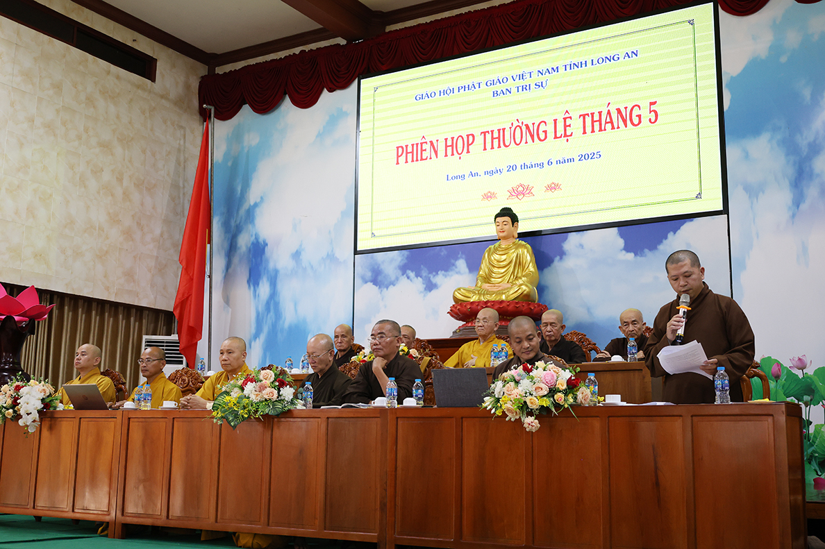 Mở đầu phiên họp, đại diện bộ phận Thư ký – Văn phòng, ĐĐ. Thích Lệ Duyên – Phó ban kiêm Chánh Thư ký BTS GHPGVN tỉnh đã báo cáo khái quát tình hình hoạt động Phật sự 6 tháng đầu năm của GHPGVN tỉnh Long An. Theo đó, nhờ sự lãnh đạo của Trung ương Giáo hội, sự quan tâm của chính quyền địa phương, sự hỗ trợ của Tăng Ni Phật tử, hoạt động Phật sự của Phật giáo Long An ổn định, các Phật sự nổi bật có thể kể đến như: tổ chức thành công Đại giới đàn Đạt Pháp năm 2025 tại chùa Pháp Minh, huyện Đức Hòa (giới trường Tăng) và chùa Hòa Bình, huyện Cần Giuộc (giới trường Ni); phối hợp với lãnh đạo chính quyền thăm Nghĩa trang Liệt sĩ tỉnh; phối hợp Bộ CHQS tỉnh phát quà cho bà con dịp Tết Nguyên đán Ất Tỵ 2025; trao Giáo chỉ tấn phong giáo phẩm đến 3 vị Thượng tọa và 8 vị Ni sư; thành lập Điểm nhóm sinh hoạt tôn giáo tập trung Quan Âm Lan Nhã và Cát Tường tại huyện Đức Hòa; thành lập Ban Quản trị Tịnh thất Dược sư, huyện Cần Đước; tham dự Đại lễ Phật đản Liên Hợp Quốc tại Học viện Phật giáo Việt Nam tại TPHCM; tổ chức Đại lễ Phật Đản PL.2569 – DL. 2025 tại Lễ đài Văn phòng BTS GHPGVN tỉnh; tổ chức Lễ tưởng niệm anh hùng liệt sĩ, trai đàn chẩn tế, trao quà cho hộ gia đình chính sách; tổ chức đoàn thăm và làm việc đến 13 BTS GHPGVN tỉnh nhằm tổng kết Phật sự và giải quyết những vấn đề còn tồn đọng; tổ chức Lễ Tổng khai giảng khóa an cư kiết hạ PL.2569 – DL.2025. Tổng giá trị hoạt động từ thiện xã hội toàn tỉnh đạt 35.889.224.000đ (ba mươi lăm tỷ tám trăm tám mươi chín triệu hai trăm hai mươi bốn nghìn đồng).