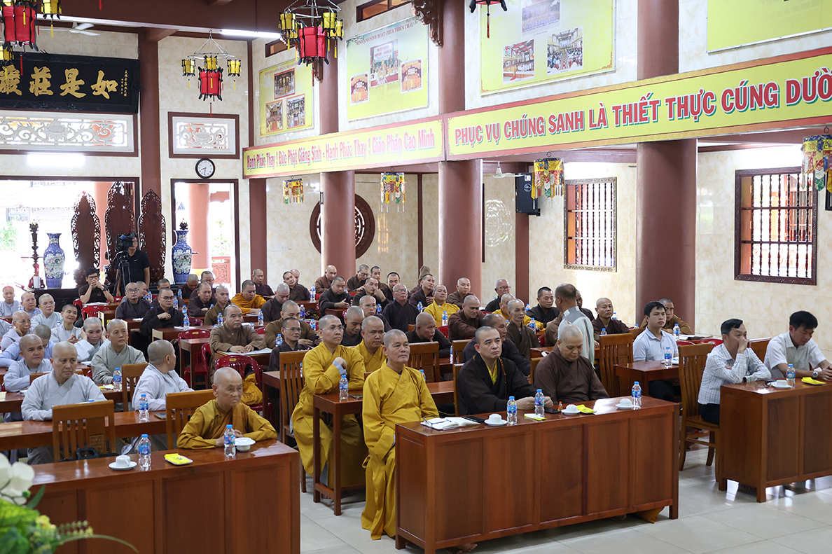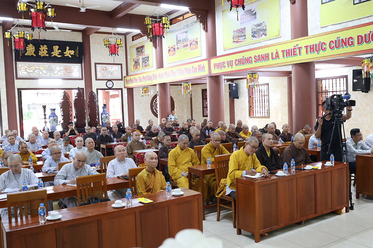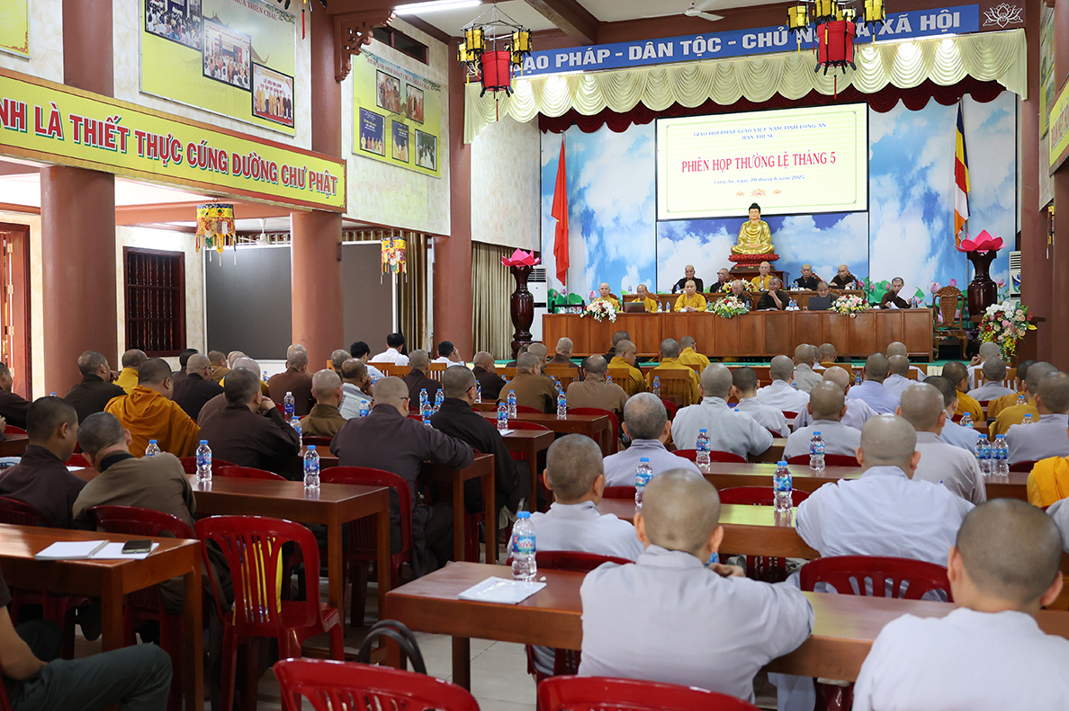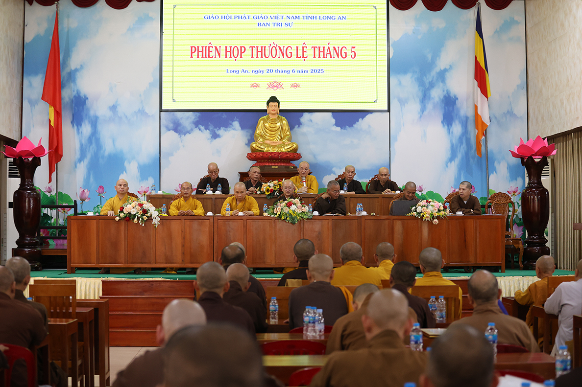 Mở đầu phiên họp, đại diện bộ phận Thư ký – Văn phòng, ĐĐ. Thích Lệ Duyên – Phó ban kiêm Chánh Thư ký BTS GHPGVN tỉnh đã báo cáo khái quát tình hình hoạt động Phật sự 6 tháng đầu năm của GHPGVN tỉnh Long An. Theo đó, nhờ sự lãnh đạo của Trung ương Giáo hội, sự quan tâm của chính quyền địa phương, sự hỗ trợ của Tăng Ni Phật tử, hoạt động Phật sự của Phật giáo Long An ổn định, các Phật sự nổi bật có thể kể đến như: tổ chức thành công Đại giới đàn Đạt Pháp năm 2025 tại chùa Pháp Minh, huyện Đức Hòa (giới trường Tăng) và chùa Hòa Bình, huyện Cần Giuộc (giới trường Ni); phối hợp với lãnh đạo chính quyền thăm Nghĩa trang Liệt sĩ tỉnh; phối hợp Bộ CHQS tỉnh phát quà cho bà con dịp Tết Nguyên đán Ất Tỵ 2025; trao Giáo chỉ tấn phong giáo phẩm đến 3 vị Thượng tọa và 8 vị Ni sư; thành lập Điểm nhóm sinh hoạt tôn giáo tập trung Quan Âm Lan Nhã và Cát Tường tại huyện Đức Hòa; thành lập Ban Quản trị Tịnh thất Dược sư, huyện Cần Đước; tham dự Đại lễ Phật đản Liên Hợp Quốc tại Học viện Phật giáo Việt Nam tại TPHCM; tổ chức Đại lễ Phật Đản PL.2569 – DL. 2025 tại Lễ đài Văn phòng BTS GHPGVN tỉnh; tổ chức Lễ tưởng niệm anh hùng liệt sĩ, trai đàn chẩn tế, trao quà cho hộ gia đình chính sách; tổ chức đoàn thăm và làm việc đến 13 BTS GHPGVN tỉnh nhằm tổng kết Phật sự và giải quyết những vấn đề còn tồn đọng; tổ chức Lễ Tổng khai giảng khóa an cư kiết hạ PL.2569 – DL.2025. Tổng giá trị hoạt động từ thiện xã hội toàn tỉnh đạt 35.889.224.000đ (ba mươi lăm tỷ tám trăm tám mươi chín triệu hai trăm hai mươi bốn nghìn đồng).