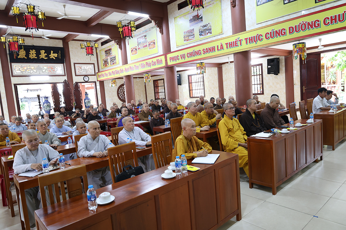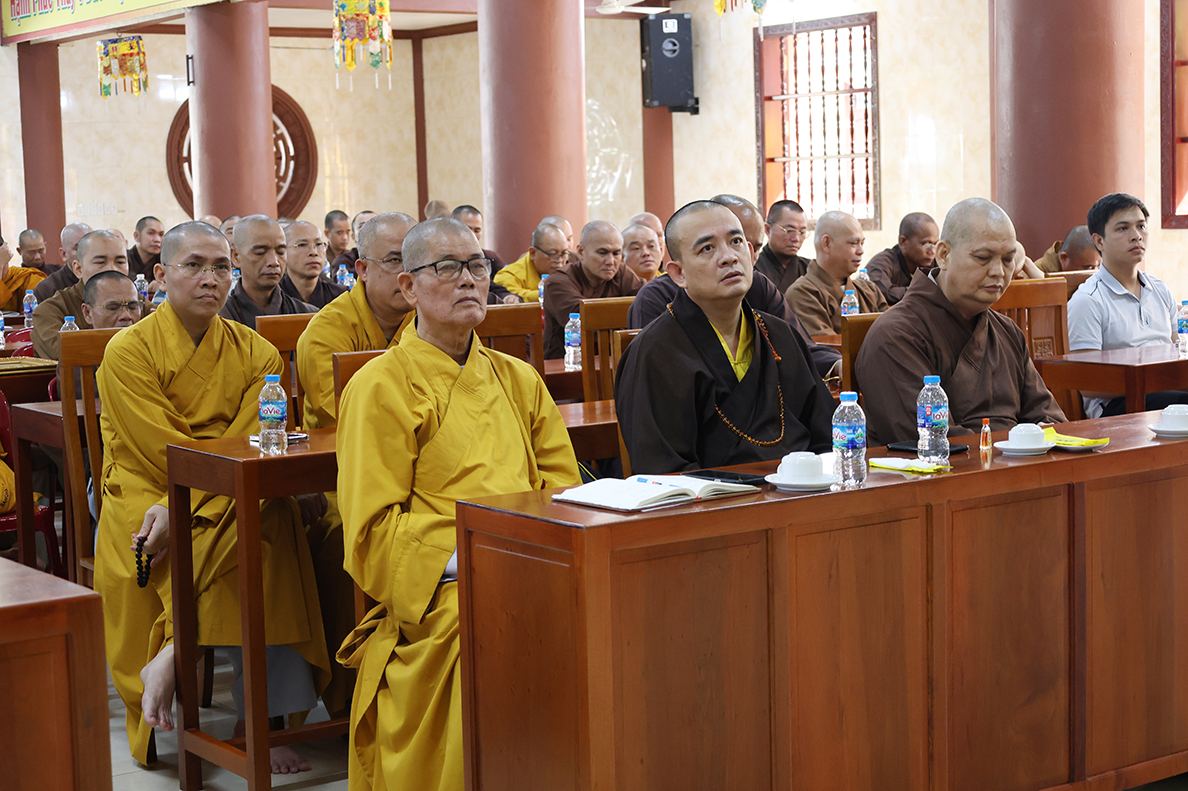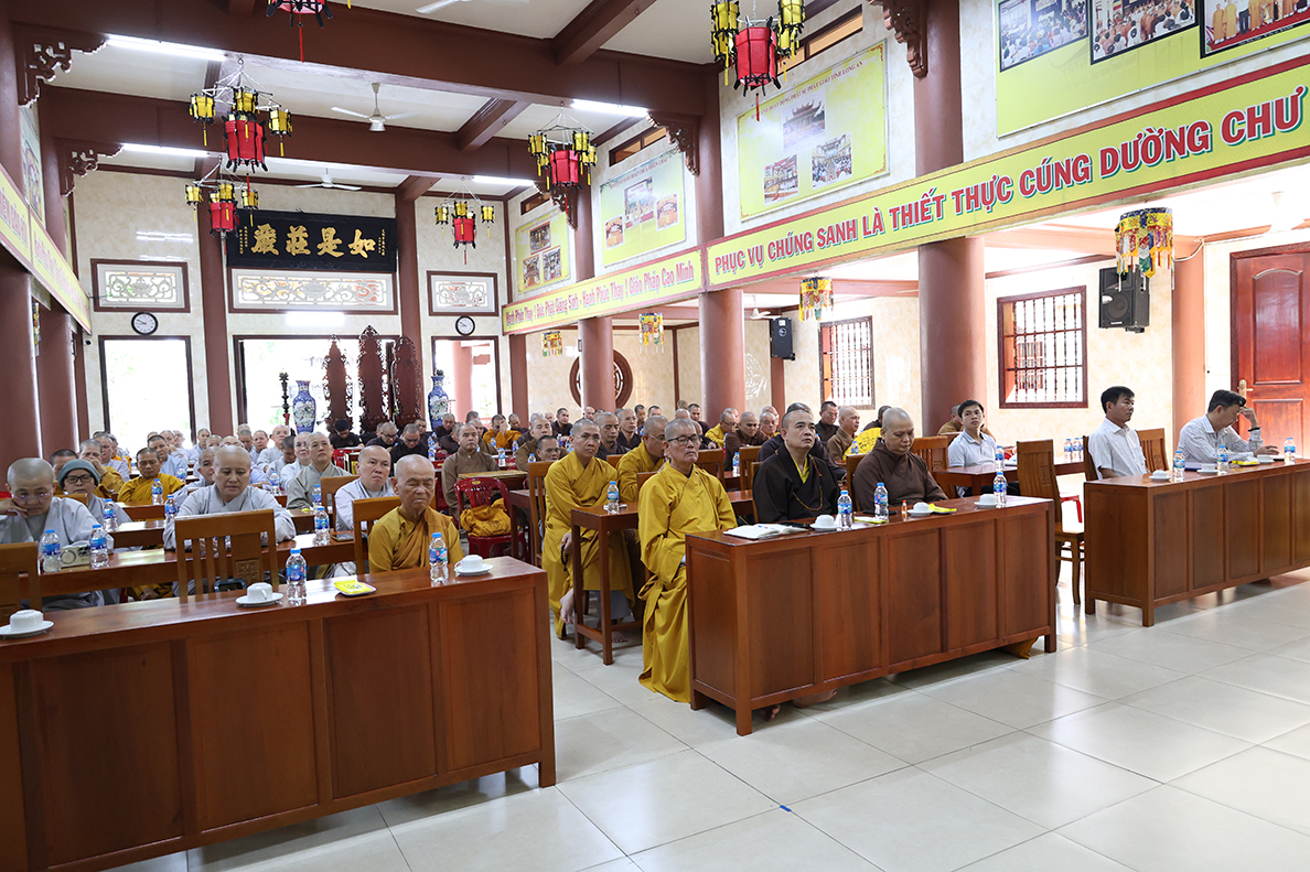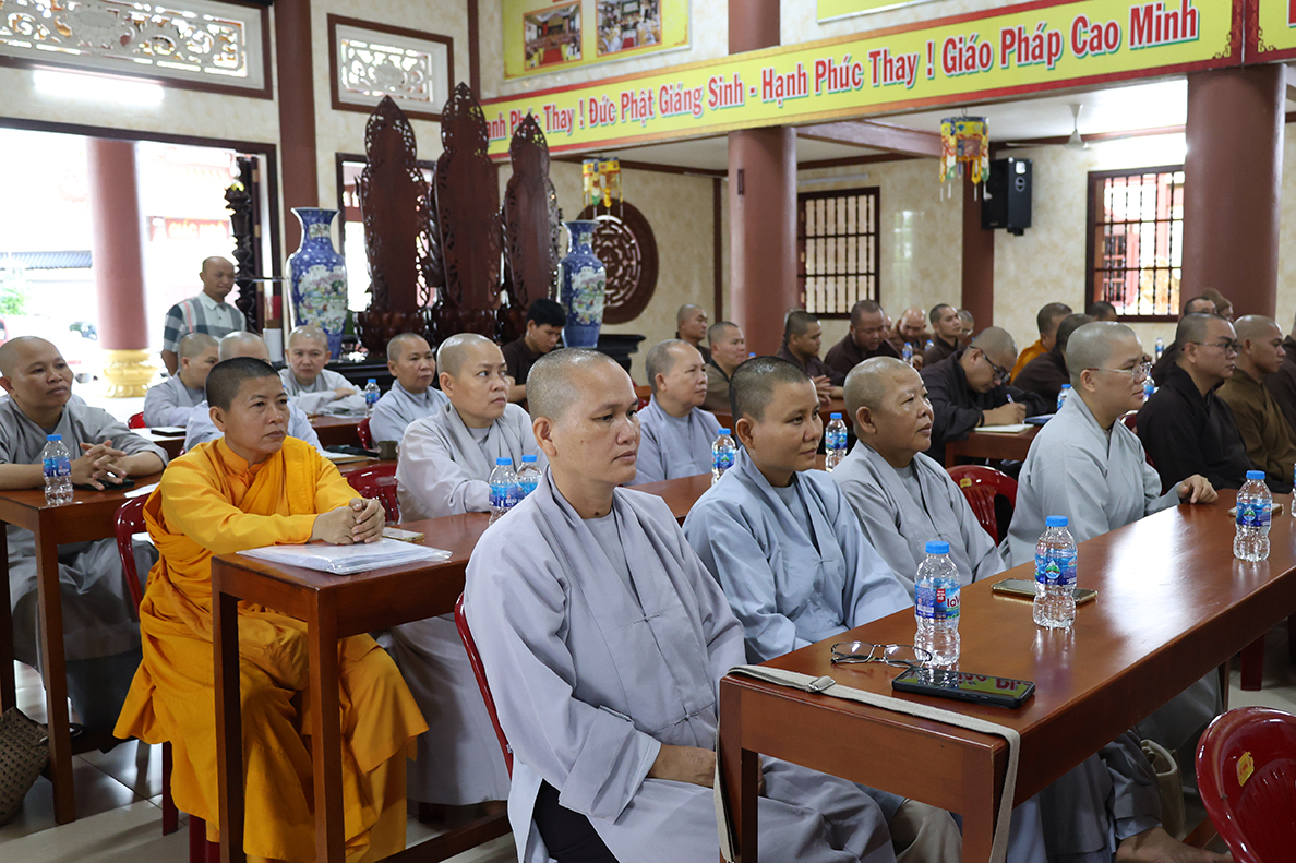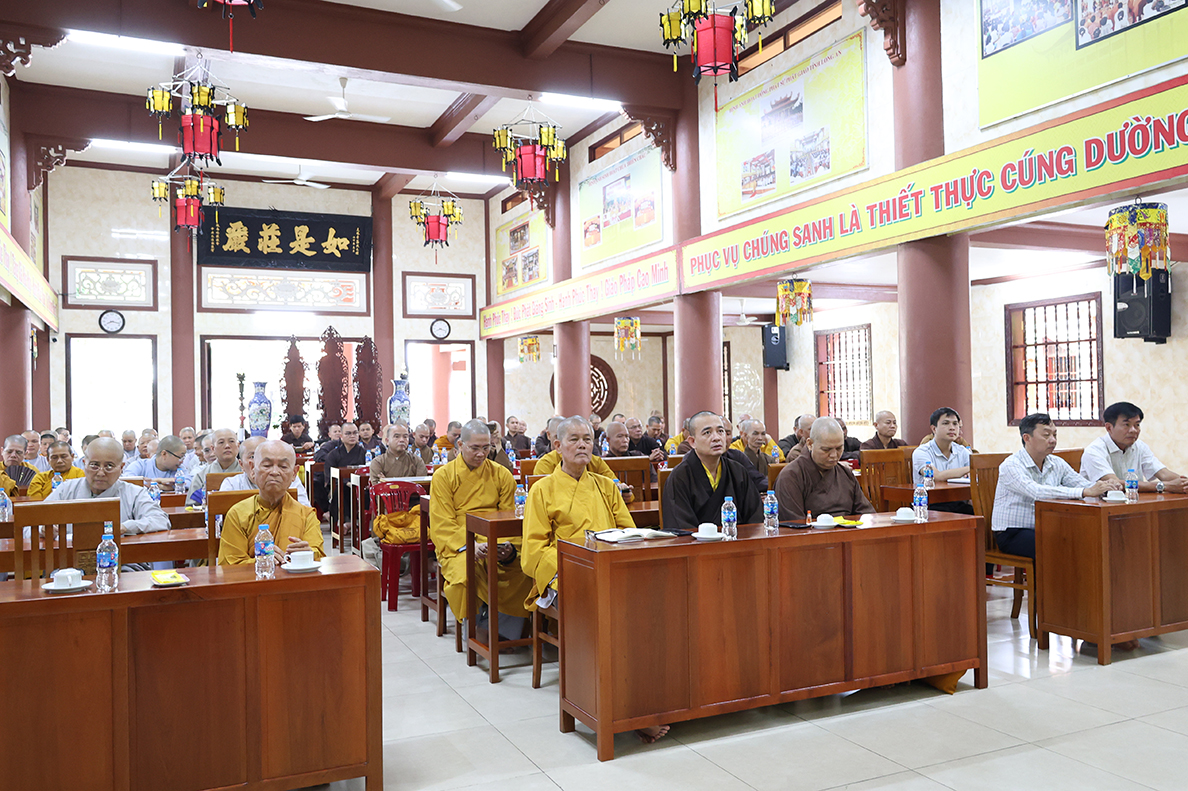Mở đầu phiên họp, đại diện bộ phận Thư ký – Văn phòng, ĐĐ. Thích Lệ Duyên – Phó ban kiêm Chánh Thư ký BTS GHPGVN tỉnh đã báo cáo khái quát tình hình hoạt động Phật sự 6 tháng đầu năm của GHPGVN tỉnh Long An. Theo đó, nhờ sự lãnh đạo của Trung ương Giáo hội, sự quan tâm của chính quyền địa phương, sự hỗ trợ của Tăng Ni Phật tử, hoạt động Phật sự của Phật giáo Long An ổn định, các Phật sự nổi bật có thể kể đến như: tổ chức thành công Đại giới đàn Đạt Pháp năm 2025 tại chùa Pháp Minh, huyện Đức Hòa (giới trường Tăng) và chùa Hòa Bình, huyện Cần Giuộc (giới trường Ni); phối hợp với lãnh đạo chính quyền thăm Nghĩa trang Liệt sĩ tỉnh; phối hợp Bộ CHQS tỉnh phát quà cho bà con dịp Tết Nguyên đán Ất Tỵ 2025; trao Giáo chỉ tấn phong giáo phẩm đến 3 vị Thượng tọa và 8 vị Ni sư; thành lập Điểm nhóm sinh hoạt tôn giáo tập trung Quan Âm Lan Nhã và Cát Tường tại huyện Đức Hòa; thành lập Ban Quản trị Tịnh thất Dược sư, huyện Cần Đước; tham dự Đại lễ Phật đản Liên Hợp Quốc tại Học viện Phật giáo Việt Nam tại TPHCM; tổ chức Đại lễ Phật Đản PL.2569 – DL. 2025 tại Lễ đài Văn phòng BTS GHPGVN tỉnh; tổ chức Lễ tưởng niệm anh hùng liệt sĩ, trai đàn chẩn tế, trao quà cho hộ gia đình chính sách; tổ chức đoàn thăm và làm việc đến 13 BTS GHPGVN tỉnh nhằm tổng kết Phật sự và giải quyết những vấn đề còn tồn đọng; tổ chức Lễ Tổng khai giảng khóa an cư kiết hạ PL.2569 – DL.2025. Tổng giá trị hoạt động từ thiện xã hội toàn tỉnh đạt 35.889.224.000đ (ba mươi lăm tỷ tám trăm tám mươi chín triệu hai trăm hai mươi bốn nghìn đồng).