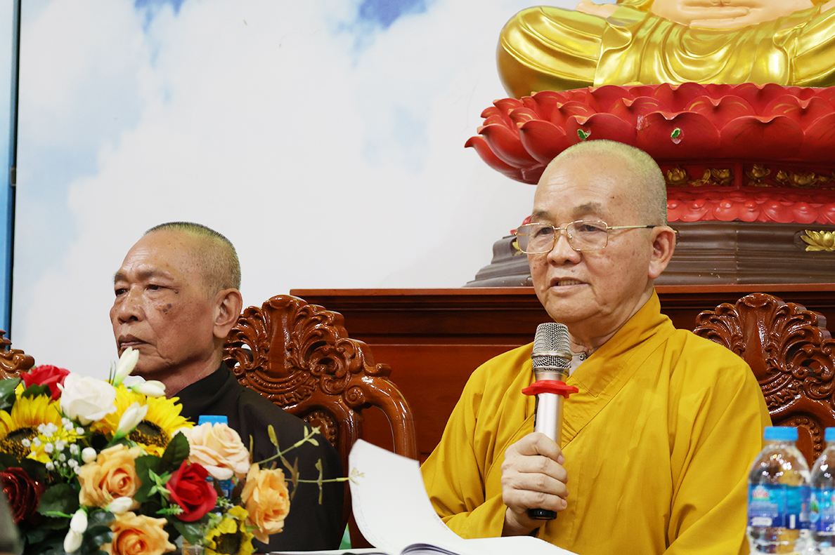Phát biểu chỉ đạo tại phiên họp, HT. Thích Minh Thiện – Trưởng BTS GHPGVN tỉnh đã ghi nhận những phát biểu ý kiến của Chư Tôn đức và có những chỉ đạo sâu sát, nhấn mạnh vai trò đoàn kết, ổn định tổ chức và phát huy hiệu quả hoạt động Phật sự tại địa phương. Song, Hòa thượng cũng giải trình nhiều nội dung quan trọng trong Thông tư 256 và 258 của Hội đồng Trị sự. Các nội dung như: công tác hiệp thương nhân sự Chư Tôn đức Ban Thường trực, kiện toàn Văn phòng Ban Trị sự, định hướng tổ chức, vận hành các hoạt động Phật sự một cách ổn định, nề nếp, đúng quy định pháp lý và phù hợp với tinh thần của Thông tư đã được Hòa thượng giải trình nhằm giúp Chư Tôn đức nắm vững và thực hiện hiệu quả trong thời gian tới.