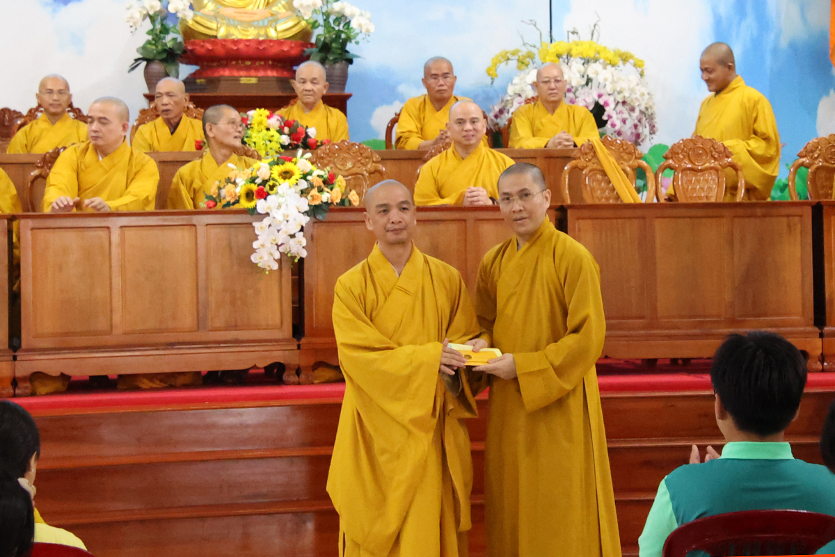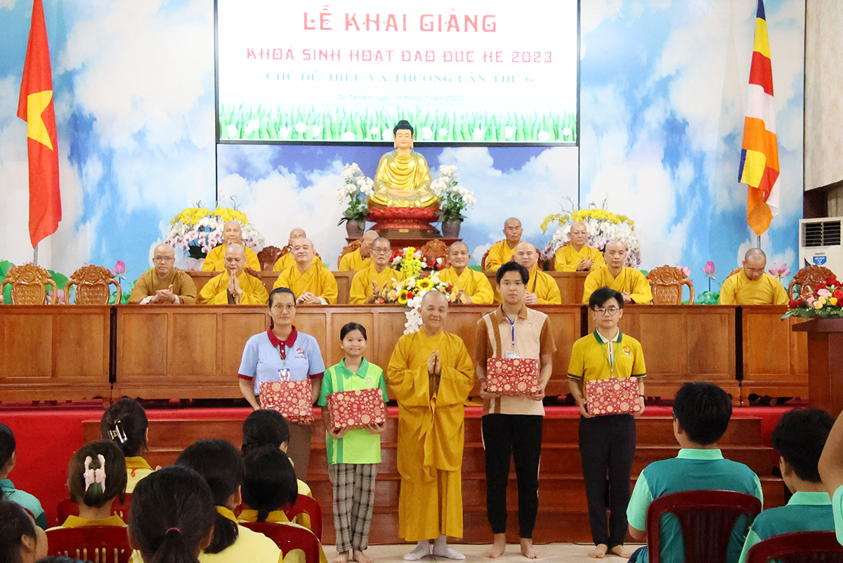 Nhằm khích lệ tinh thần, Hòa thượng Thích Minh Thiện trao tặng quà cho đại diện học sinh và các huynh trưởng trong ban tổ chức.
