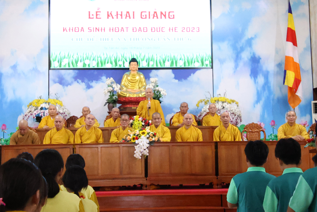 ĐĐ. Thích Pháp Huân thay mặt Ban Tổ chức đọc diễn văn khai mạc và báo cáo công tác tổ chức khóa Đạo đức hè năm 2023 tại chùa Thiên Châu. Đại đức trình bày khái quát về mục đích của việc tổ chức khóa đạo đức nhằm giúp các em biết thương yêu, đối xử tốt với mọi người, có tình yêu thiên nhiên, đất nước, con người trở thành một người công dân có ích cho xã hội. Theo đó, có gần 300 khóa sinh đăng ký sinh hoạt trong năm nay. Đại đức kính tri ân Hòa thượng trụ trì chùa Thiên Châu, chư Tăng và Phật tử, các cấp lãnh đạo chính quyền và quý mạnh thường quân đã phát tâm hỗ trợ để khóa học được diễn ra. Sau đó, Đại đức đã trình bày về nội dung của khóa học bao gồm: Giá trị của sự vâng lời, kính cha mẹ, cảm hóa bạn xấu, tôn kính Phật, nói không với game, nâng cao thể lực, tập luyện võ thuật, văn hóa kỹ năng,…. Khóa học có 50 huynh trưởng tham gia hỗ trợ.