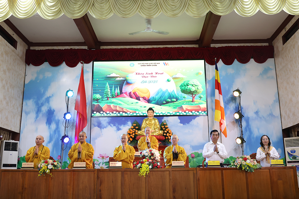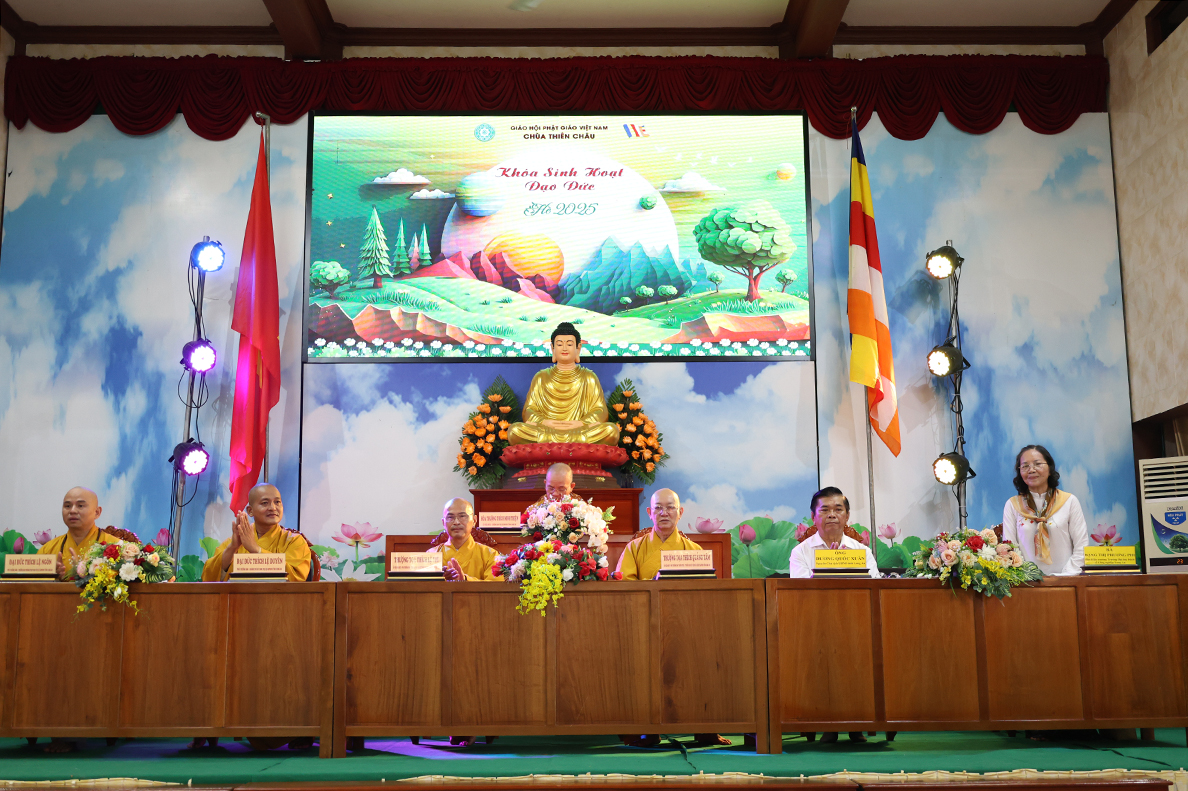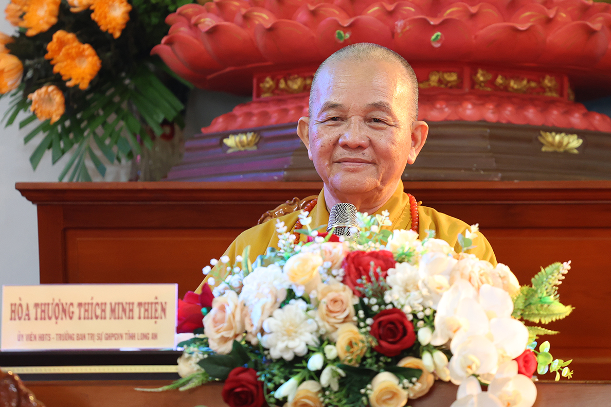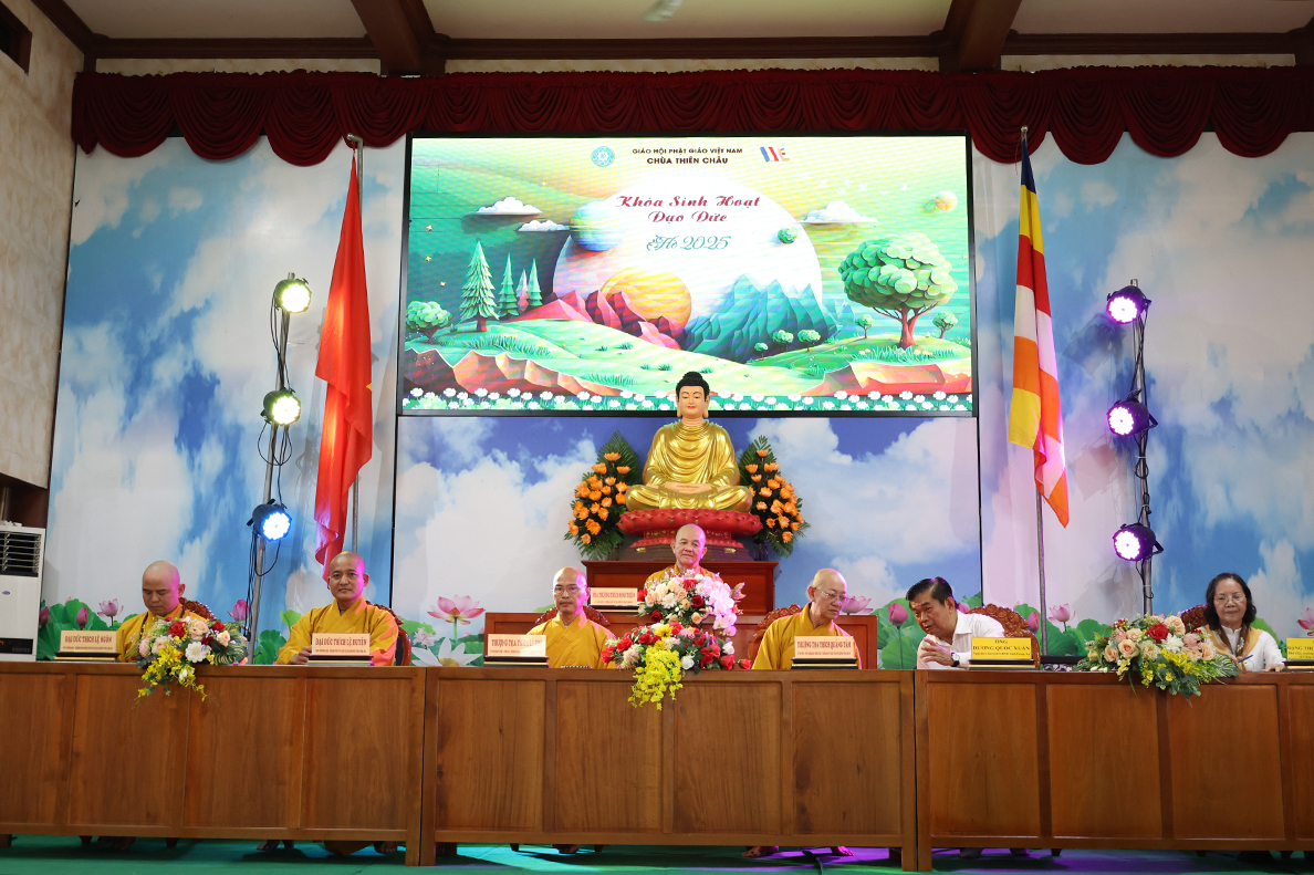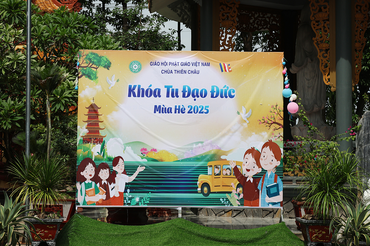 Hoà thượng Thích Minh Thiện – Trưởng BTS GHPGVN tỉnh Long An, Trụ trì chùa Thiên Châu có lời đạo từ đến các khoá sinh tại buổi lễ. Hòa thượng chia sẻ Khóa Đạo đức hè 2025 tại chùa Thiên Châu được tổ chức nhằm lan tỏa tinh thần từ bi và trí tuệ của đạo Phật, đồng thời định hướng cho các em thiếu nhi trở thành những công dân có ích, biết yêu quê hương đất nước, biết sống biết ơn và thực hành đạo lý “uống nước nhớ nguồn” theo truyền thống tốt đẹp của dân tộc Việt Nam. Bên cạnh đó, khóa tu cũng tạo điều kiện để các em được trau dồi những kỹ năng sống cần thiết, giúp các em ứng xử chuẩn mực trong đời sống hằng ngày. Hoà thượng còn cho biết toàn bộ chi phí do chùa Thiên Châu đài thọ. Hòa thượng kỳ vọng rằng sau khóa tu, các em sẽ mang theo tinh thần sống cao đẹp: “Không làm các điều ác, siêng làm các việc lành, giữ tâm ý trong sạch – ấy mới là người đệ tử chân thật của Đức Phật”.