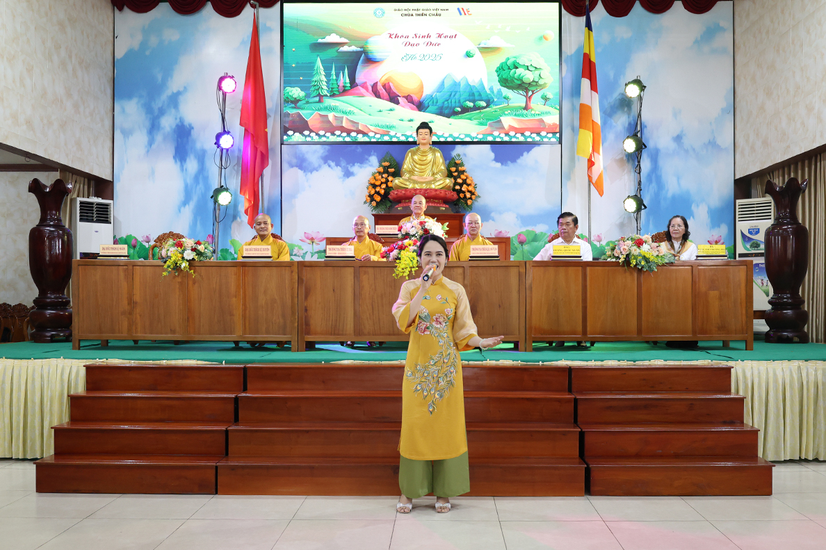 Mở đầu, Đại đức Thích Pháp Huân thay mặt Ban Tổ chức tuyên đọc diễn văn khai mạc và báo cáo công tác tổ chức khóa Đạo đức hè năm 2025 tại chùa Thiên Châu. Mục đích của việc tổ chức khóa đạo đức nhằm giúp các em biết thương yêu, đối xử tốt với mọi người, có tình yêu quê hương, đất nước, giúp các em trở thành một người công dân có ích cho xã hội. Theo đó, có gần 200 khóa sinh đăng ký sinh hoạt trong năm nay. Đại đức kính tri ân Hòa thượng trụ trì chùa Thiên Châu, chư Tăng và Phật tử, các cấp lãnh đạo chính quyền và quý mạnh thường quân đã phát tâm hỗ trợ để khóa học được diễn ra. Sau đó, Đại đức đã trình bày về nội dung của khóa học bao gồm: Giá trị của sự vâng lời, kính cha mẹ, cảm hóa bạn xấu, tôn kính Phật, nói không với game, nâng cao thể lực, tập luyện võ thuật, văn hóa kỹ năng,…