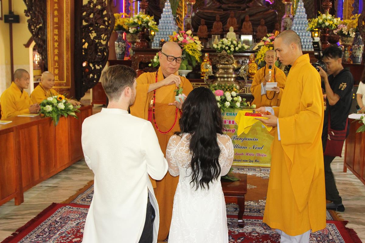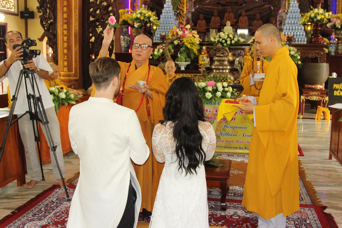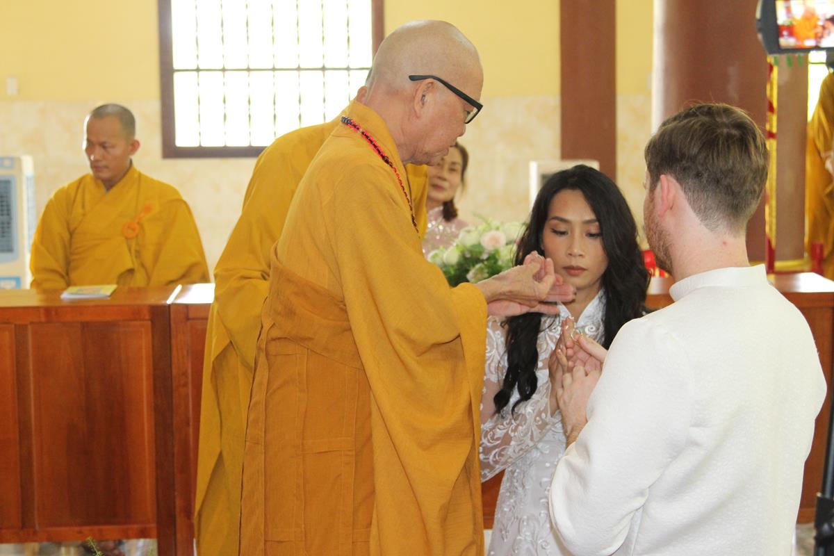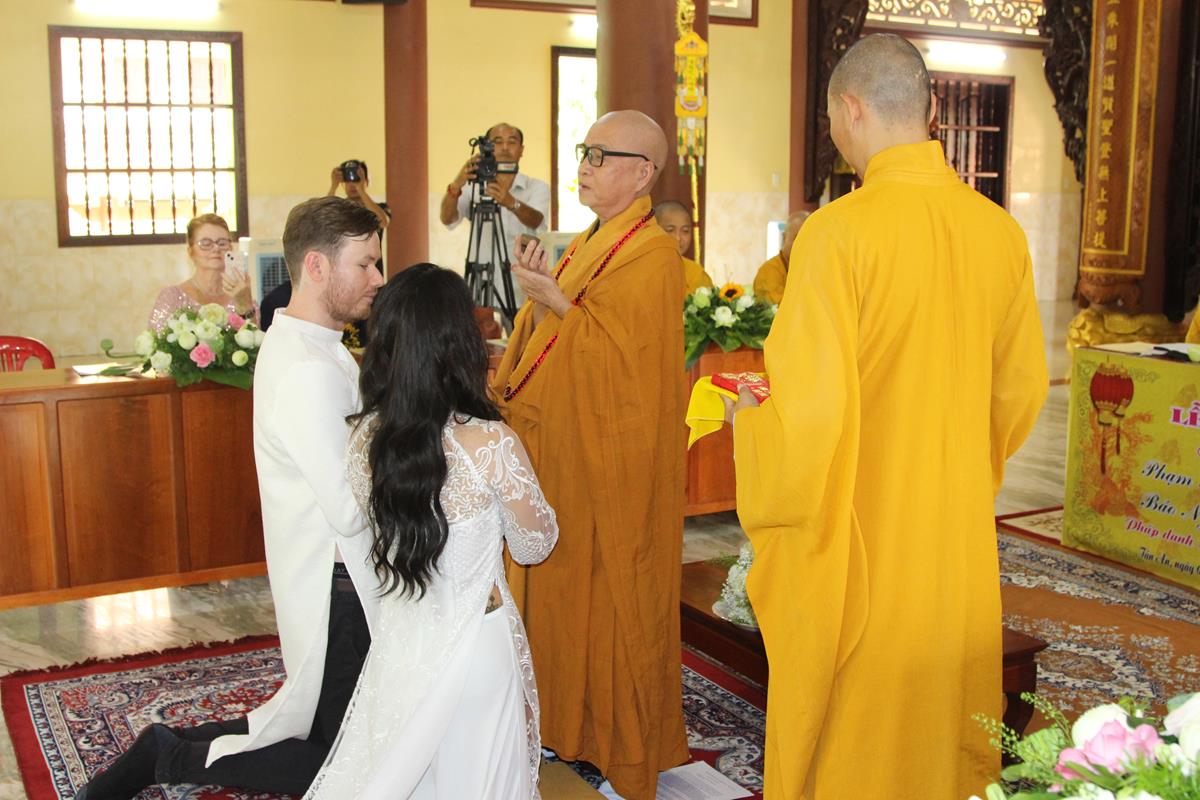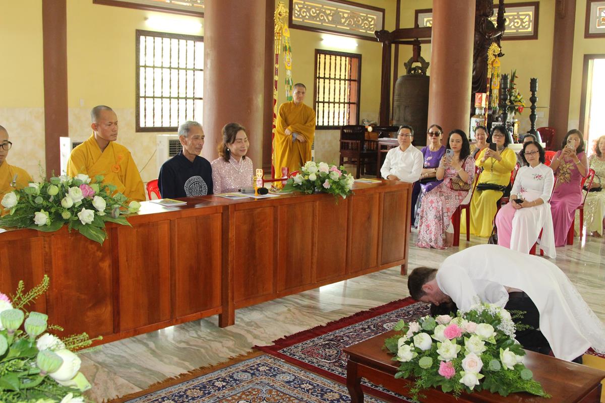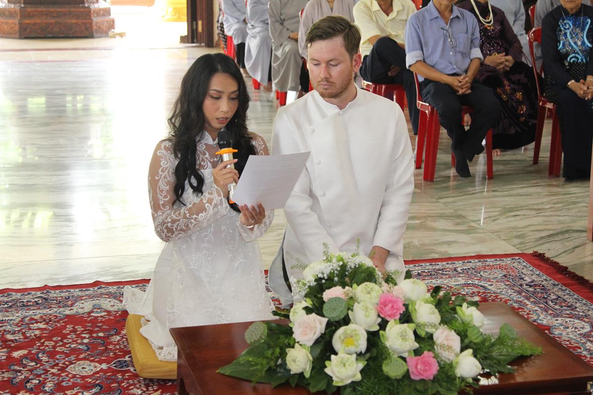 Dưới sự hướng dẫn của ĐĐ. Thích Minh Tâm, tân lang và tân nương đảnh lễ tri ân hai đấng sinh thành và dâng phát nguyện trong buổi lễ: (1) chung thuỷ suốt đời, (2) hiếu kính song thân hai bên, (3) mở rộng lòng thương, (4) thâm tín Tam bảo.