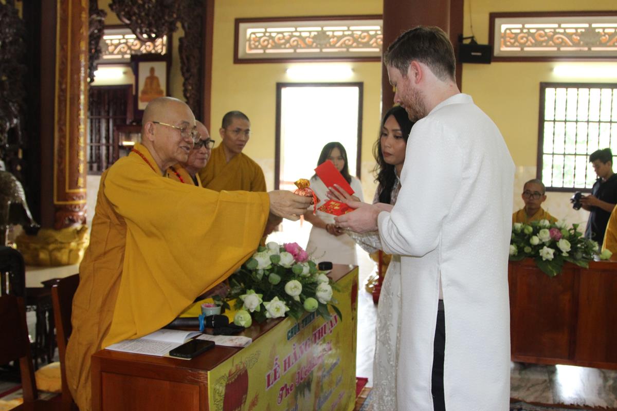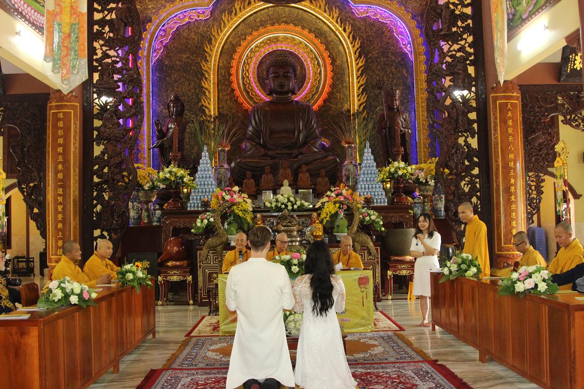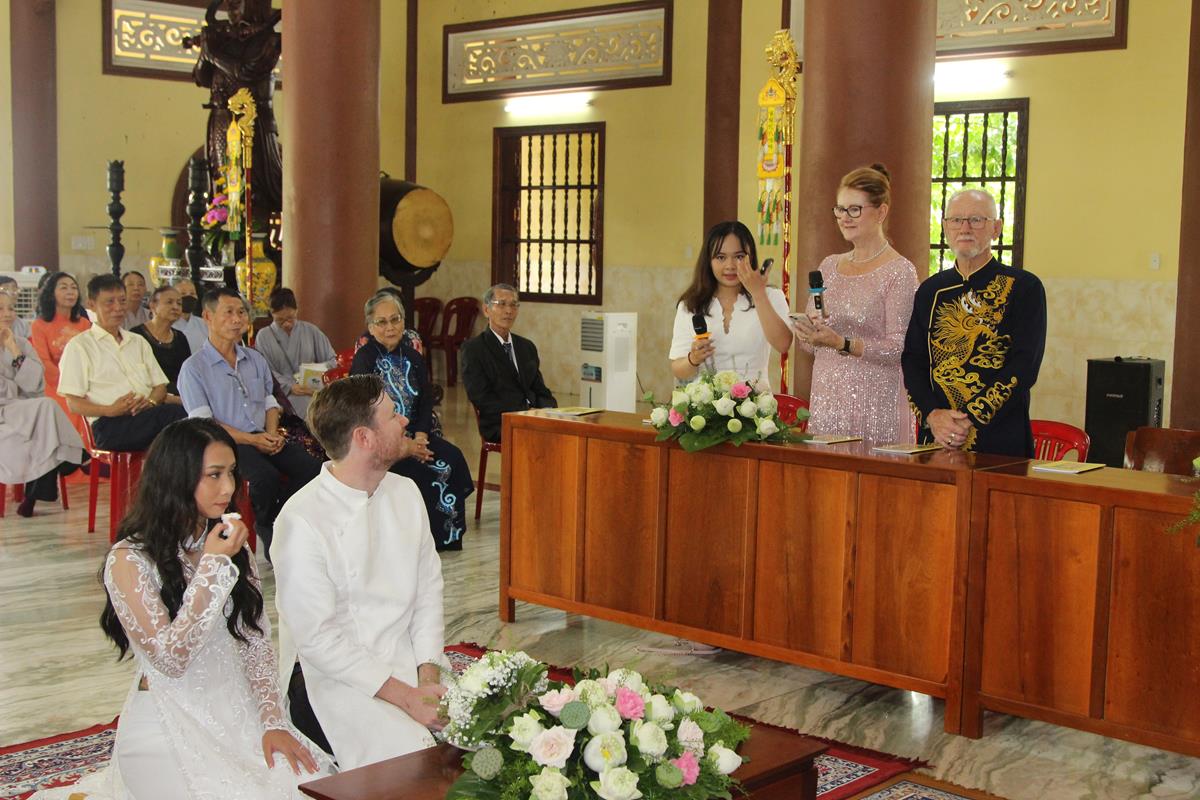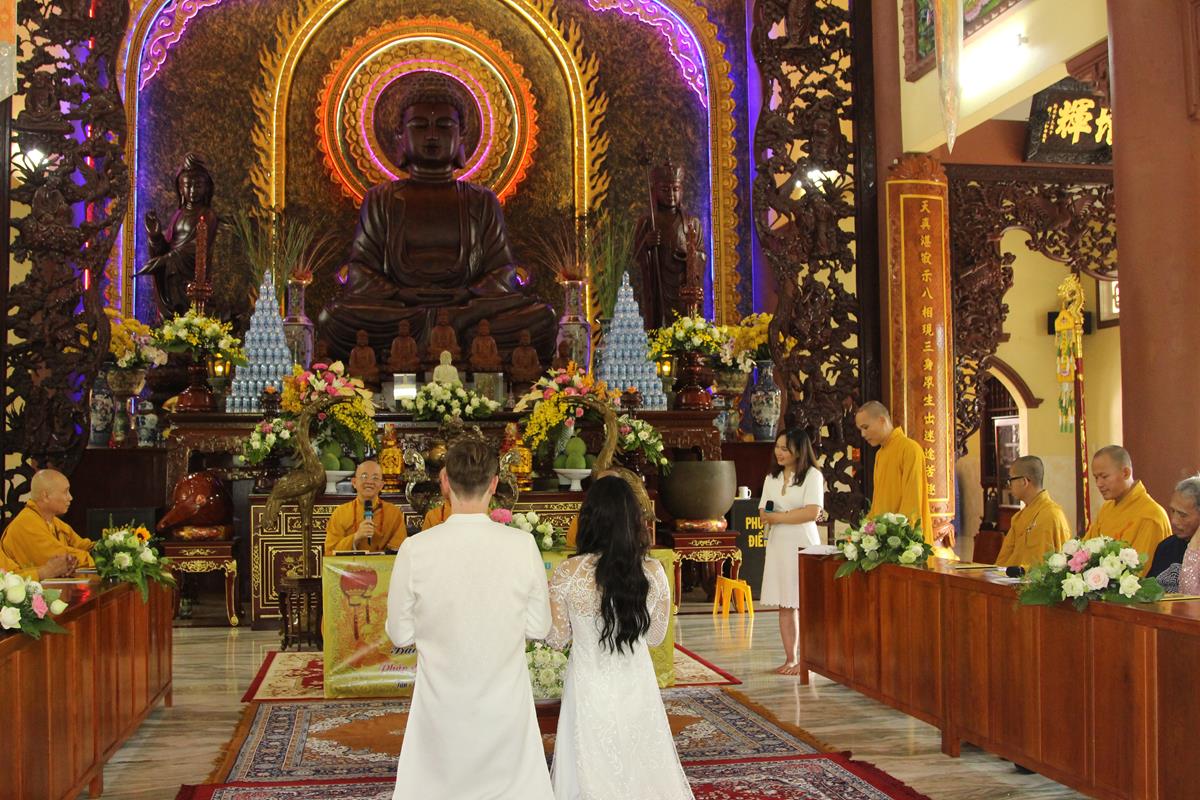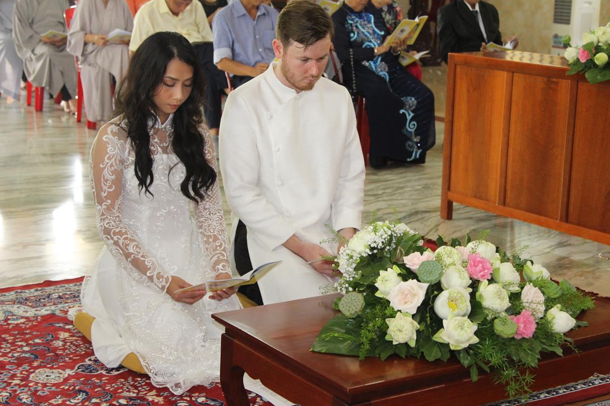 Dưới sự hướng dẫn của ĐĐ. Thích Minh Tâm, tân lang và tân nương đảnh lễ tri ân hai đấng sinh thành và dâng phát nguyện trong buổi lễ: (1) chung thuỷ suốt đời, (2) hiếu kính song thân hai bên, (3) mở rộng lòng thương, (4) thâm tín Tam bảo.