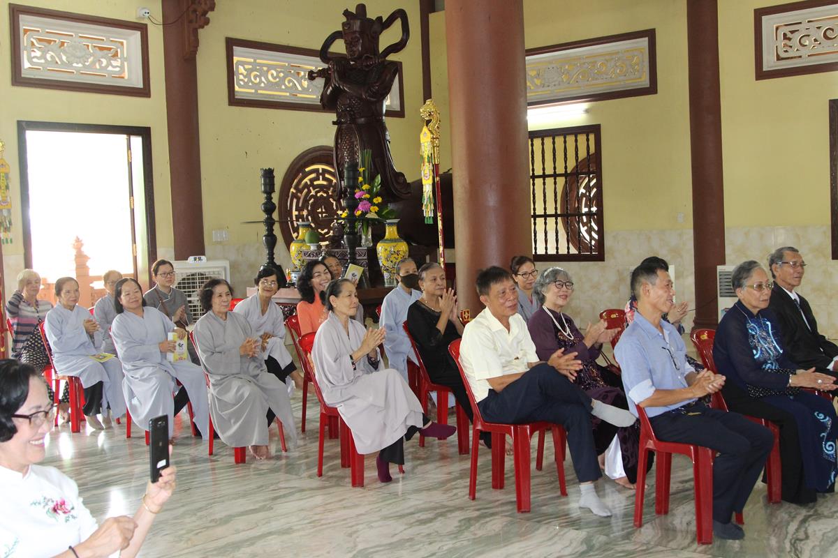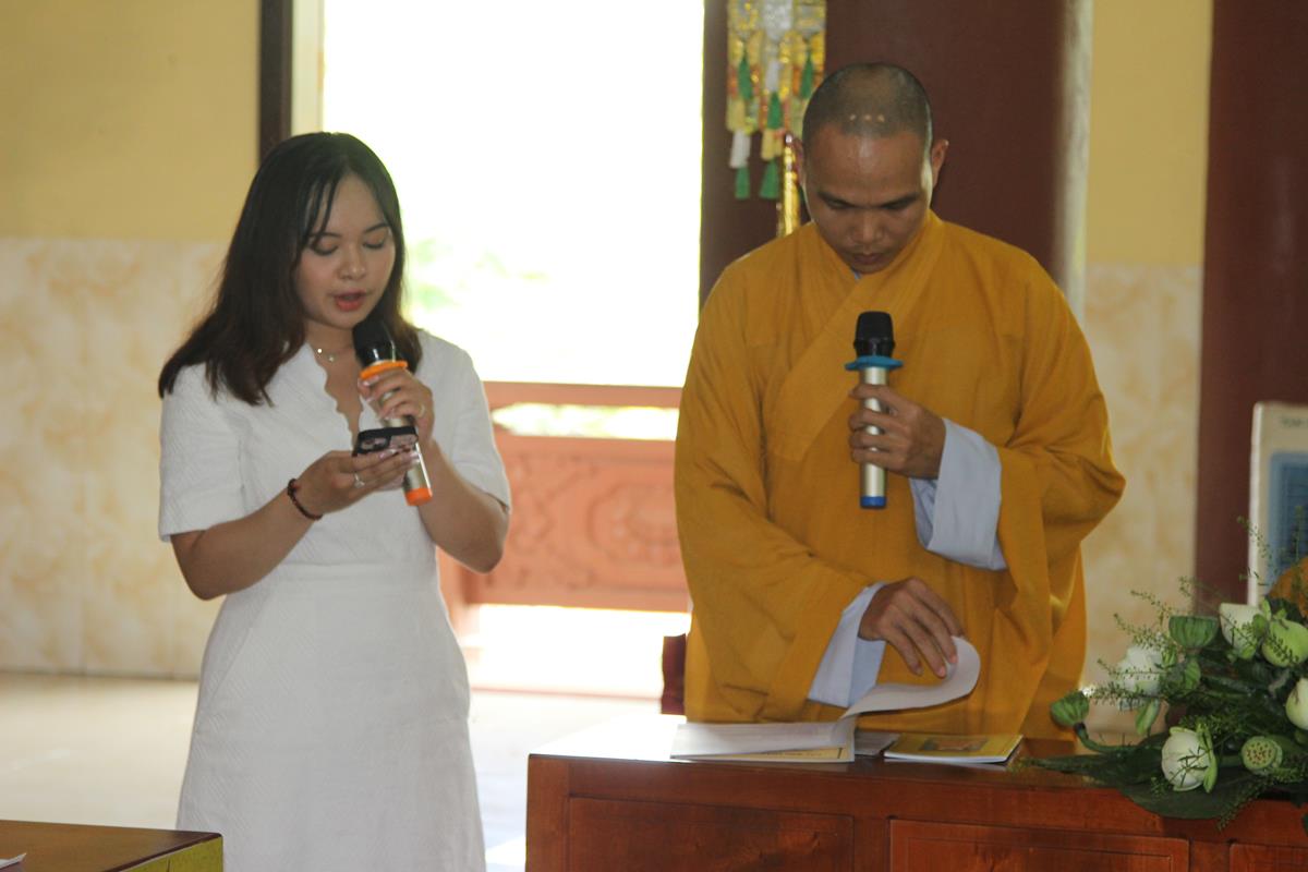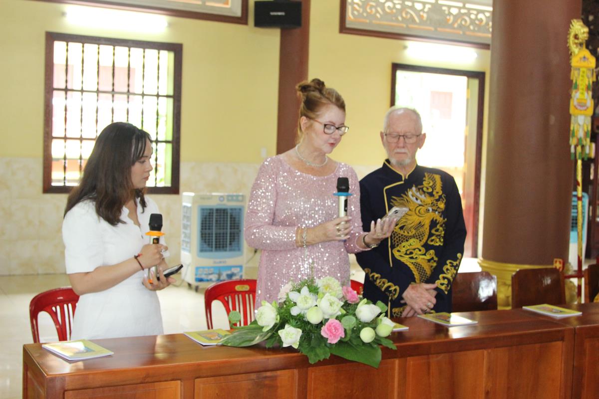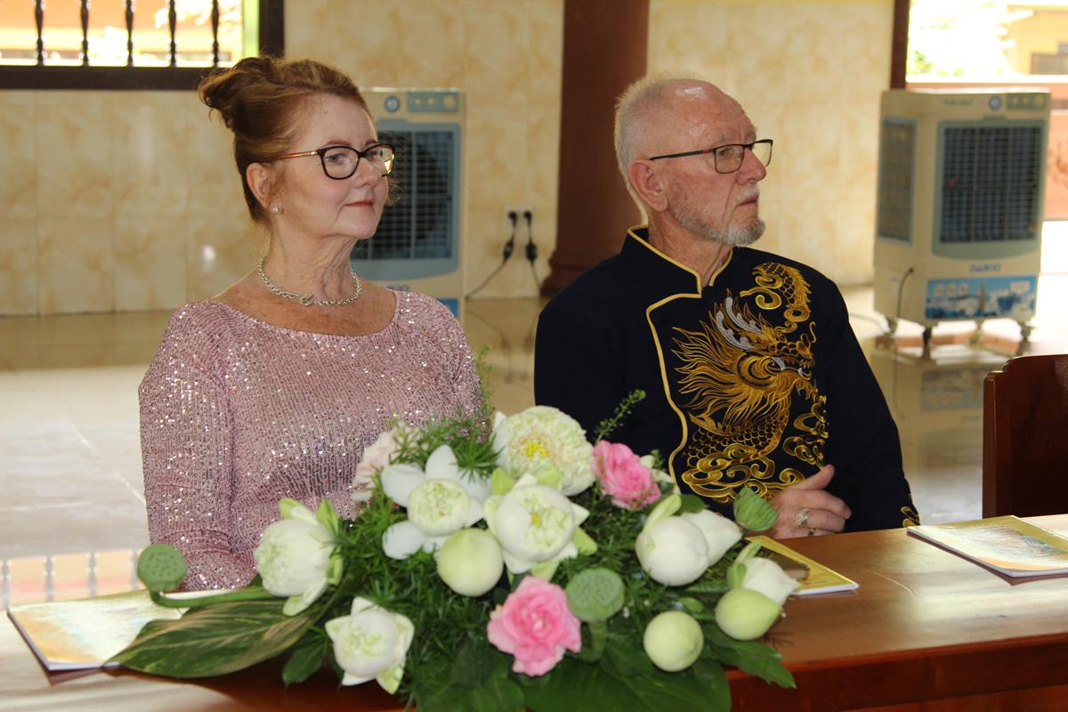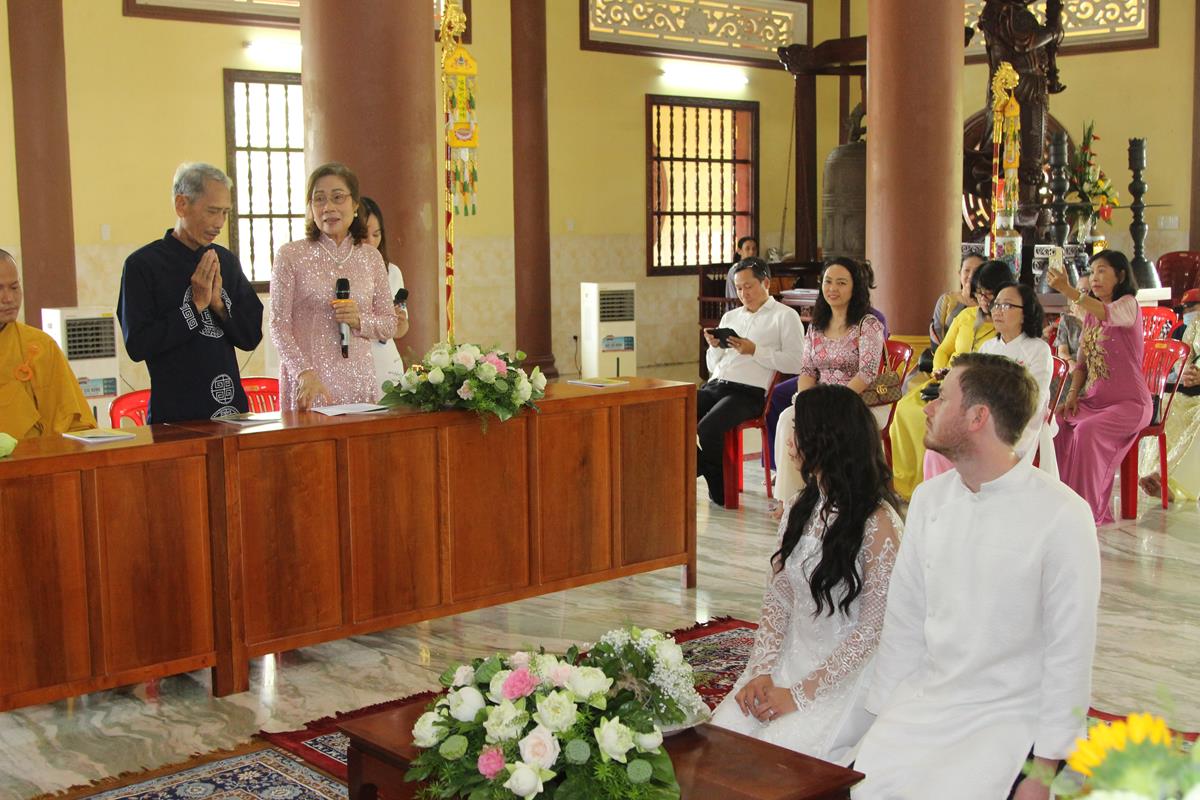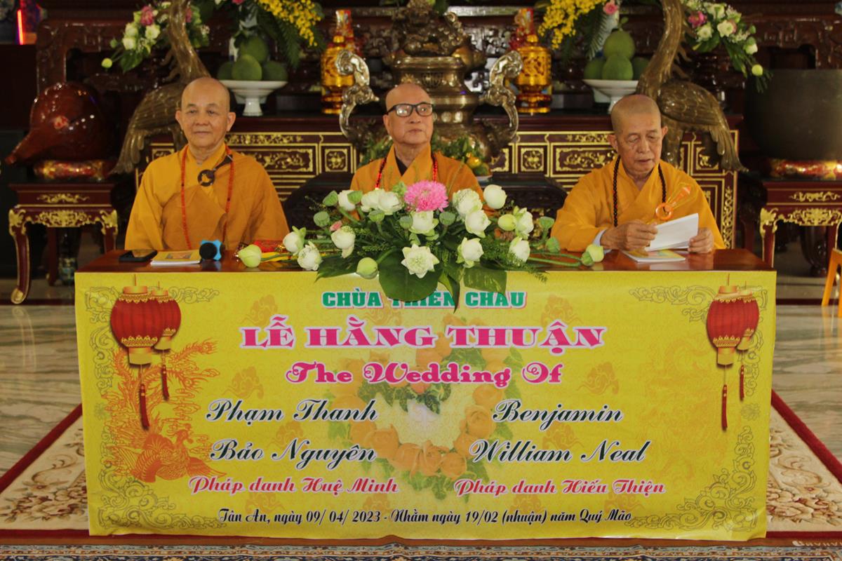 Ban đạo từ cho buổi lễ, HT. Thích Minh Thiện đã nói về ý nghĩa của Lễ Hằng thuận của đôi tân lang và tân nương, đây không chỉ là hôn lễ của đôi bạn trẻ mà còn là sự kết nối của hai gia đình, hai quốc gia, hai nền văn hoá, đây cùng là sự nối kết nền hoà bình trên thế giới. Tiếp đó, Hòa thượng đã dạy cho đôi bạn trẻ về 5 bổn phận của chồng đối với vợ và ngược lại, đây là lời của đức Phật dạy trong bài Kinh Thiện Sanh. Nhân đây, Hòa thượng cũng gửi những món quà và lời chúc phúc đến với đôi bạn trẻ, để buổi lễ được thành tựu viên mãn, Hòa thượng đã cùng chư Tôn đức chứng minh, hai bên gia đình, đôi bạn trẻ và toàn thể mọi người có mặt tụng bài Kinh Phước Đức.