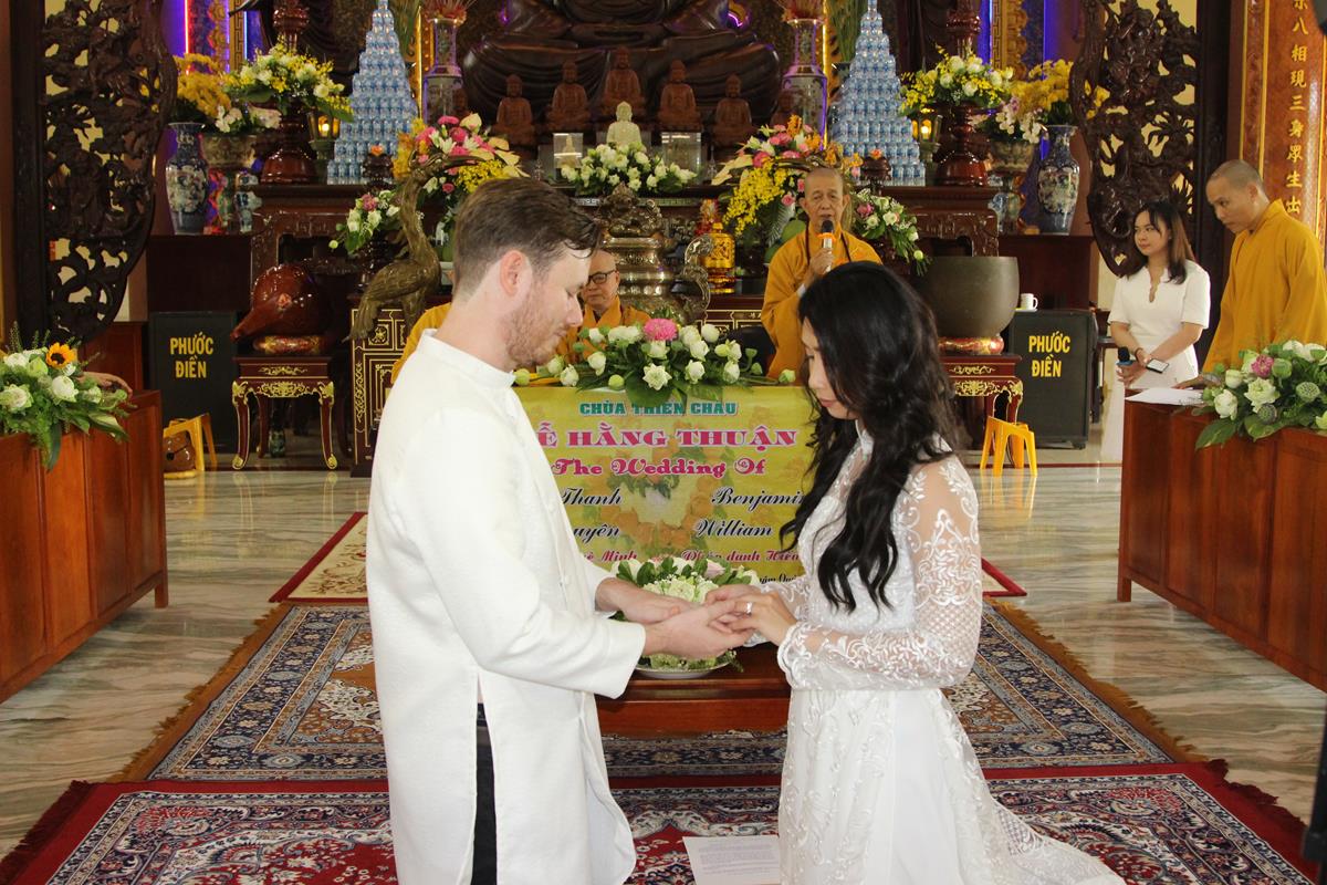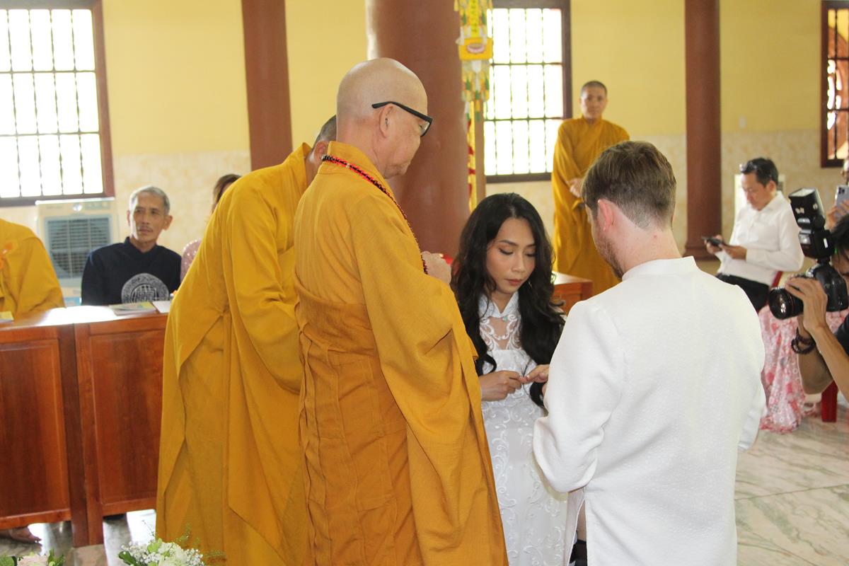 Ý nghĩa cao đẹp của đôi nhẫn cưới cũng được Chư Tôn Đức nói sơ lược trước khi đôi tân lang tân nương trao nhẫn dưới sự chứng minh của Tam Bảo. Điều này giúp đôi bạn trẻ hiểu rõ và trân trọng hơn ý nghĩa của hôn nhân gia đình, là một viên gạch chất lượng để xây dựng nên một xã hội tươi sáng thì đời sống đạo đức và nếp sống văn hóa của mỗi thành viên trong gia đình chính là nền móng vững chắc để tạo nên một gia đình văn hóa, lành mạnh, an vui hạnh phúc.